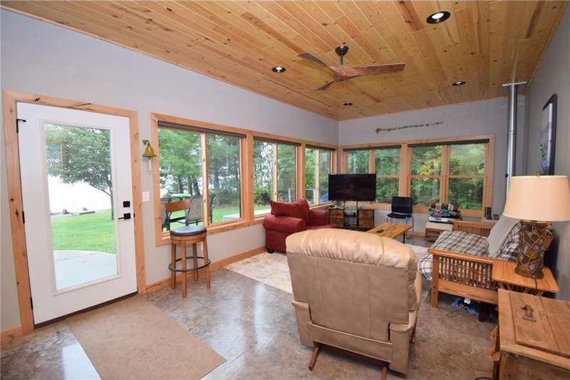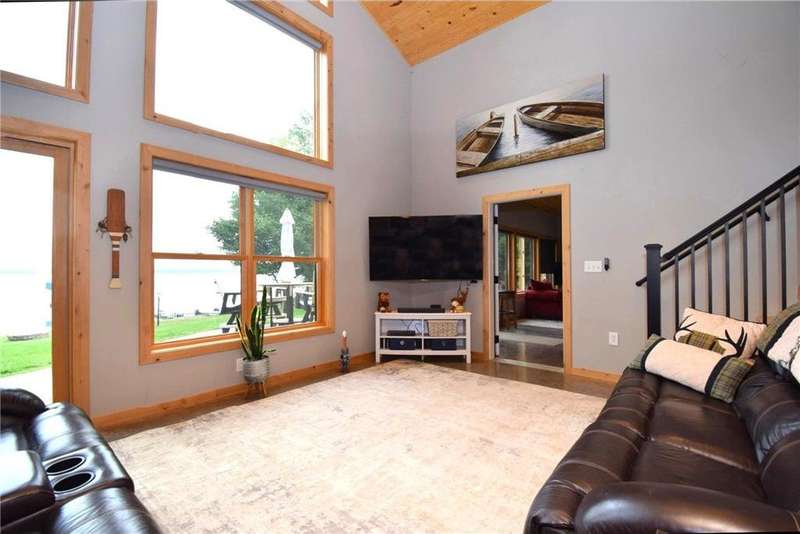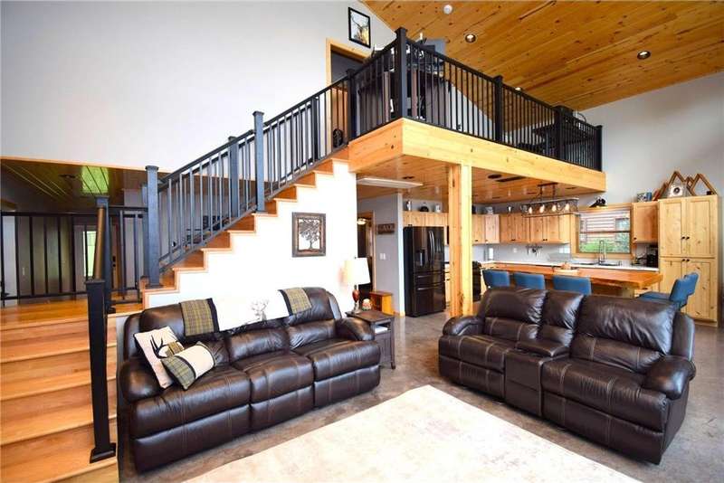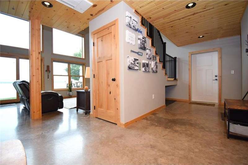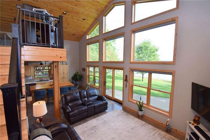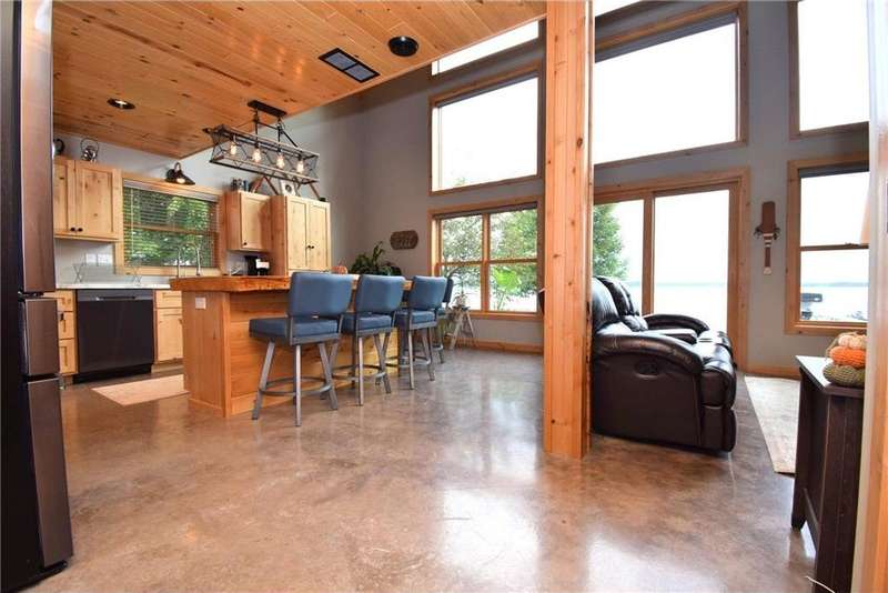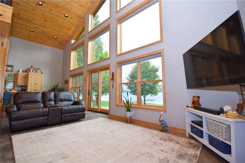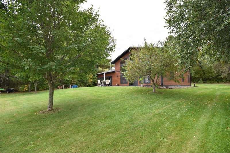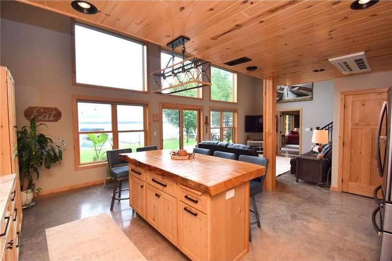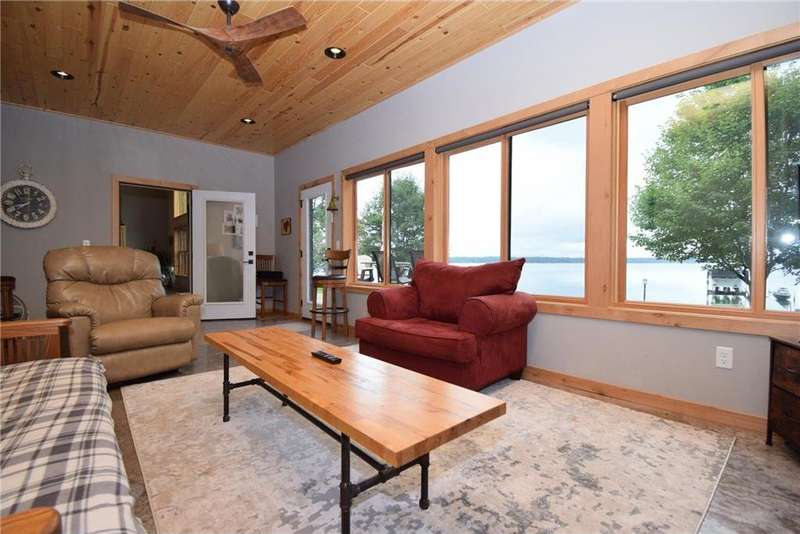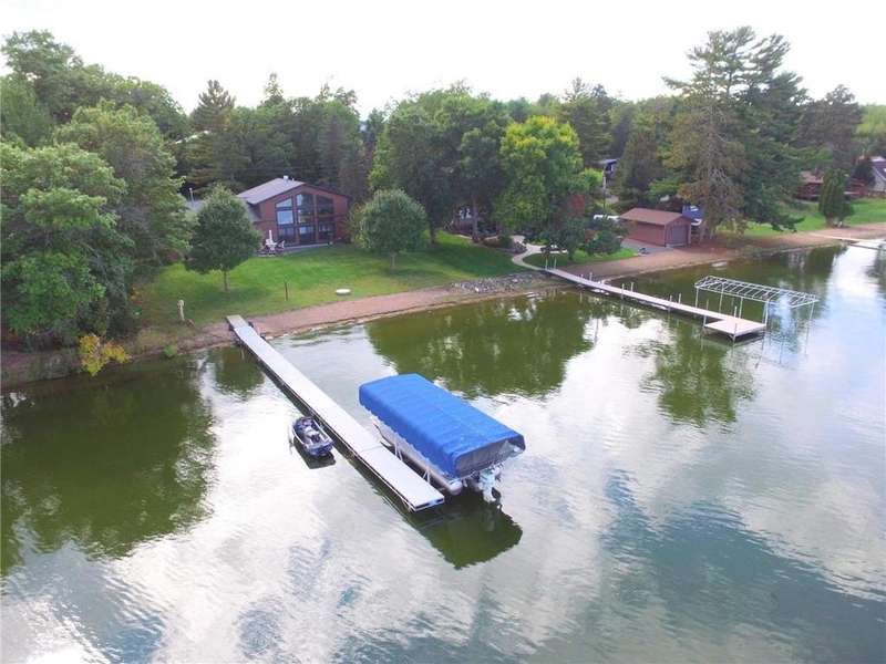 Spectacular custom high-end 3 BR, 3 BA chalet built by local reputable builder on Big Yellow Lake—sold turn-key! 97’ of level shoreline, sand beach, lakeside patio & gorgeous lawn. Soaring pine ceilings, artfully stained concrete floors, & great room w/wall of glass overlooking the lake. The fabulous eat-in kitchen features a massive live-edge pine island, knotty alder cabinets, stylish lighting, and flows to the lakeside four-season porch. Large main floor master suite featuring a custom bath w/ black cabinetry, brushed gold hardware, granite countertops, & tiled walk-in shower w/pebble base. A striking staircase w/black handrails and accent lighting leads to the open loft w/office space, plus 2 spacious bedrooms & full bath. 2-car attached heated/insulated garage, LP Smart Siding, gutters, architectural shingles, irrigation, drilled well, conventional septic, in-floor hot water heat, on-demand water heater, & mini-splits for cooling. Appreciate the quiet road location bordered to the east by a township parcel that remains undeveloped. Enjoy boating 2,500+ acres of water with 2 bar/restaurants & endless UTV/snowmobile trails out the back door. This property is a true Northwoods retreat!