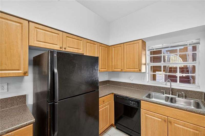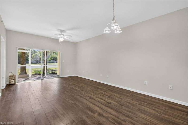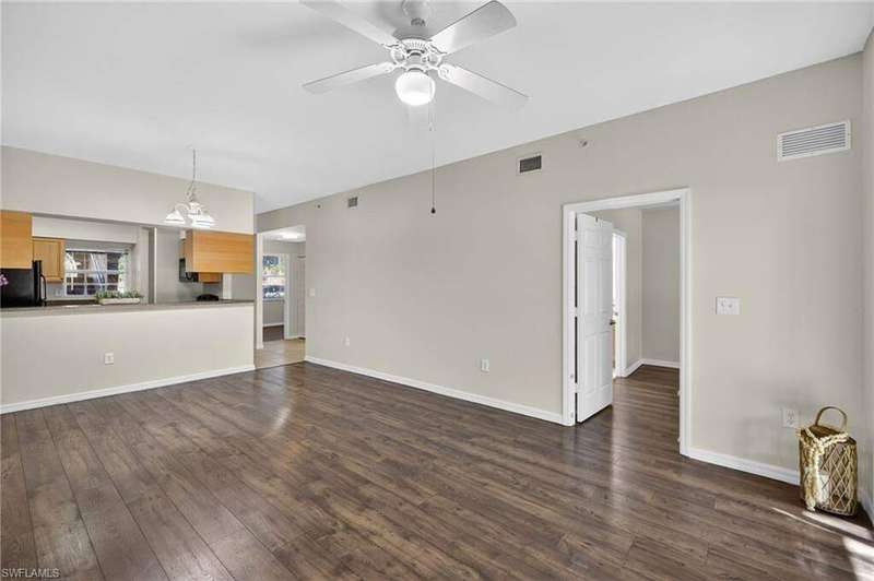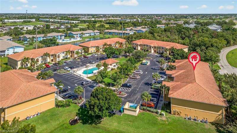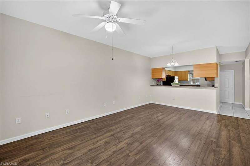 Tucked away in a quiet Cape Coral community, this well-maintained first-floor corner unit is the definition of affordable comfort-just minutes from Fort Myers, great shopping, dining, and only 30 minutes to the beach you would not be disappointed. The layout is smart and spacious, offering 2 bedrooms, 2 full baths, and no stairs to worry about. The screened lanai out back is perfect for sipping morning coffee or enjoying a good book. Inside, you'll find a roomy kitchen with solid oak cabinets, plenty of counter space, and a breakfast bar that opens into the great room, complete with wood floors throughout. The primary suite fits a king bed, features a walk-in closet, double vanity, and tiled shower. The guest room and bath are equally inviting-with a shower/tub combo for those bubble bath days. Enjoy in-unit laundry, extra storage, a newer hot water heater, and a heated community pool just splash away. Low HOA fees cover nearly everything but electricity and internet-talk about stress-free living! This unit lives much larger than it looks-and at a price that won't make your wallet cry. Come see why this Cape Coral cutie is a total score!