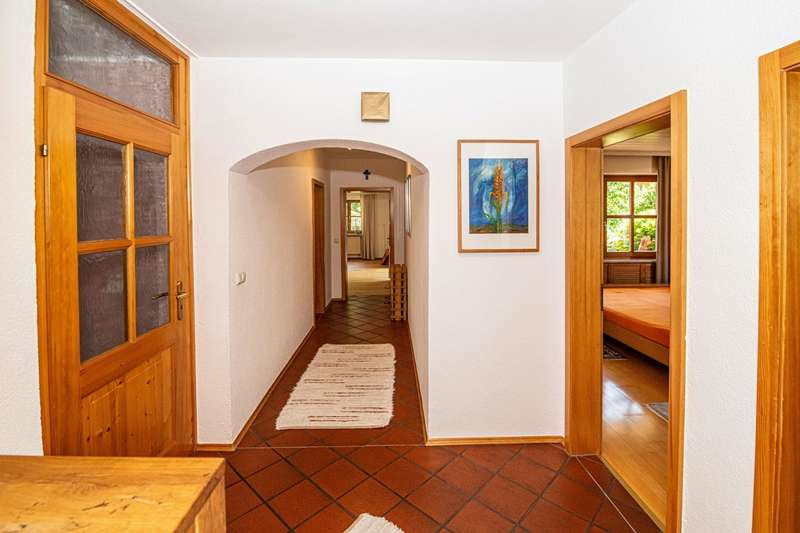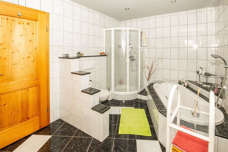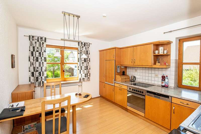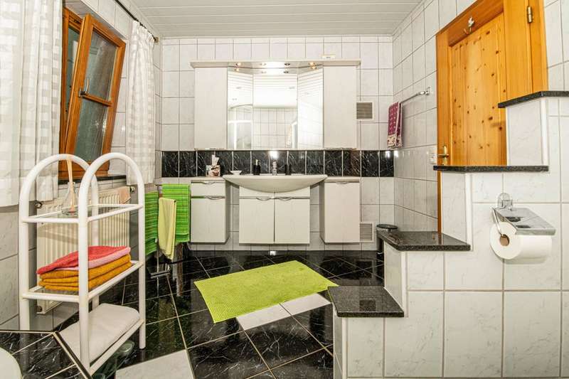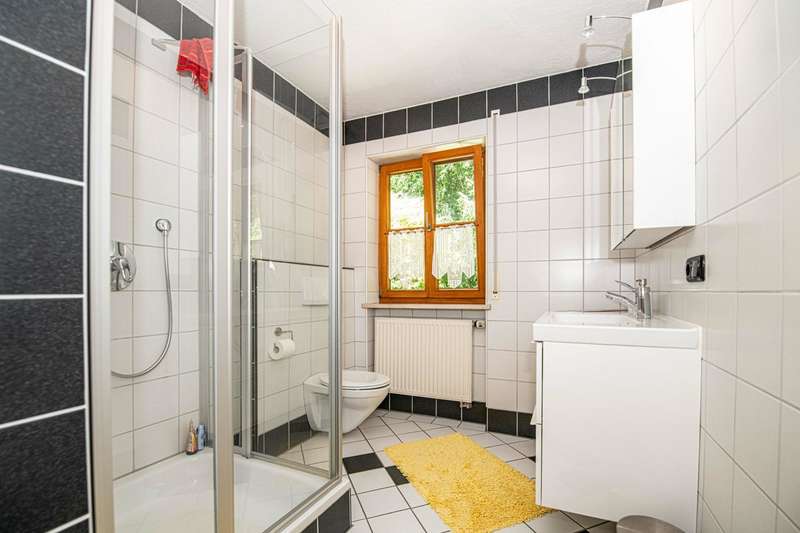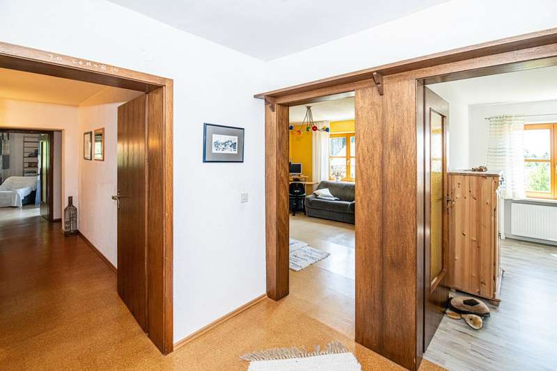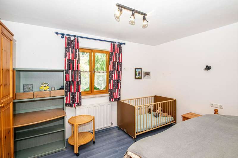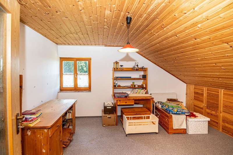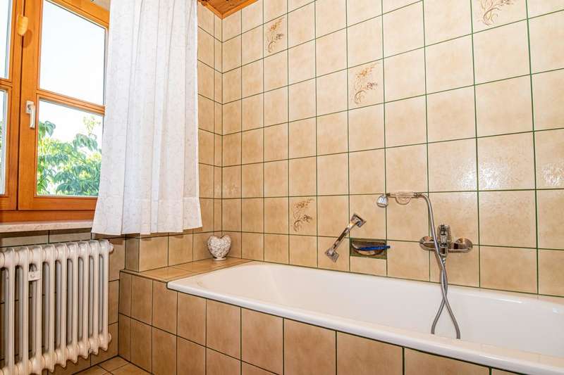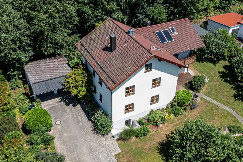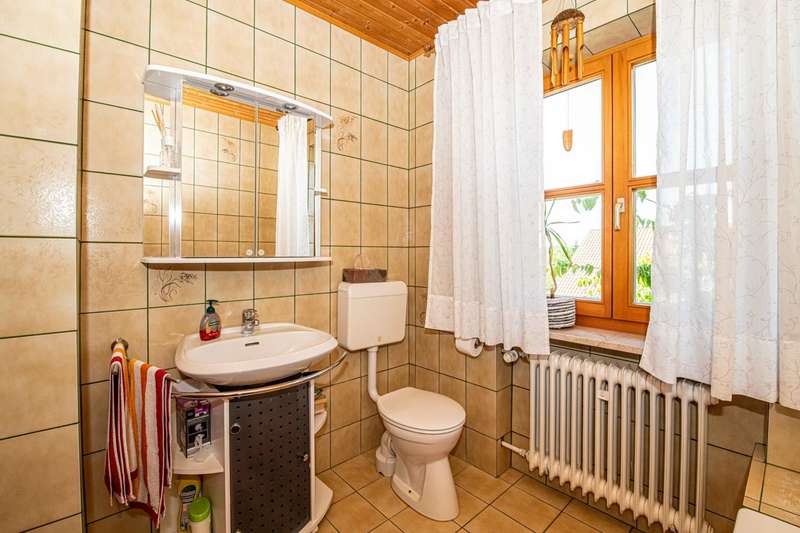This well-kept and light-flooded detached house, which can also be used as a two-family house, offers enough space for a large or 2 smaller families with a living space of approx. 196 m² and a generous plot area of approx. 1,280 m². The property was completed in 1979, an extension was added in 1996 and the existing building was modernized. Heating is provided by central oil heating and a modern tiled stove on the first floor (fired from the basement) provides cozy warmth on cold winter days. There are two solar panels on the roof to ensure the sustainable use of energy for water heating. The layout of the house is tailored to family needs. In addition to the kitchen, a storage room and a bathroom, there are two further rooms on the first floor and two bathrooms and four rooms on the upper floor. It can easily be used as a two-family home, as one of the rooms on the upper floor has plumbing for a kitchen and this floor can therefore be used completely independently. Not to be forgotten are the additional rooms in the attic, whose areas are not included in the stated living space of 196 m² and can be used in a variety of ways. The building has a full cellar and, in addition to the boiler and tank room, there are further storage facilities as well as a small workshop and direct access to the garden. A spacious double garage completes the overall package. The sheltered terrace on the first floor and the spacious balcony on the upper floor make for relaxing hours that even a little rain shower can't spoil. The garden has been lovingly landscaped and has a well-tended stock of fruit trees that will delight any amateur gardener. There is also plenty to discover on the ingrown plot: in addition to a small pond, there is a garden shed, a separate tool shed and a wooden shed, which provide additional storage space. A cistern for rainwater harvesting is also available and supports environmentally friendly gardening. Not only families will appreciate the combination of rural tranquillity and nearby urban amenities. Shopping facilities for everyday needs can be reached by car in less than five minutes. This property is an attractive option for those who value living close to nature. With its functional features, the given room layout and the quiet location, it opens up a wide range of possibilities. If you are interested, we will be happy to provide you with a virtual 360° tour in advance.