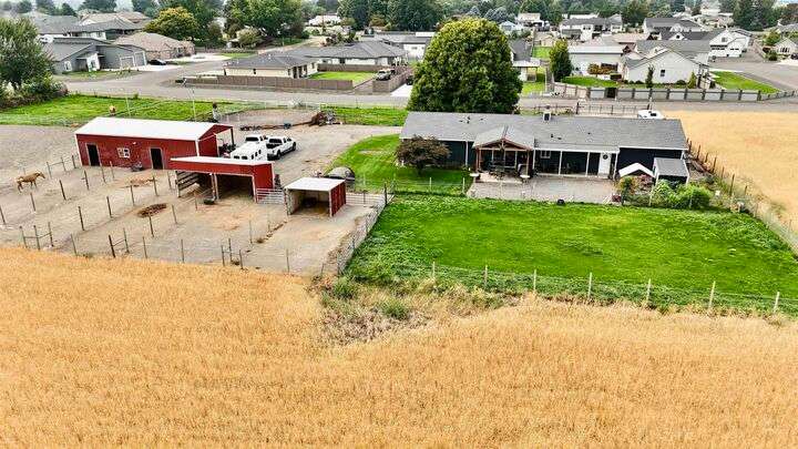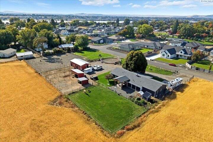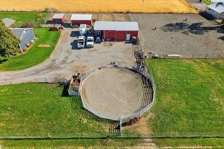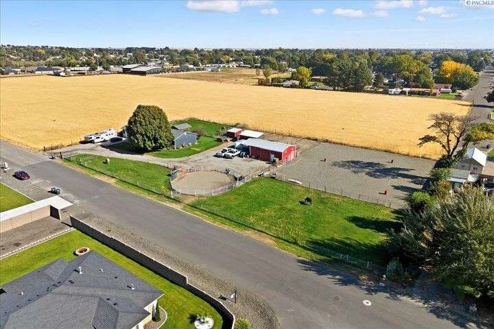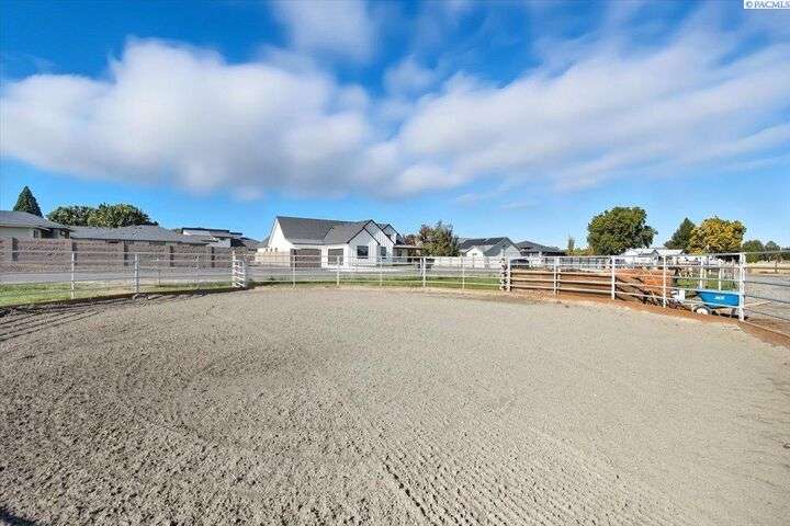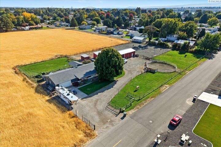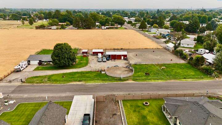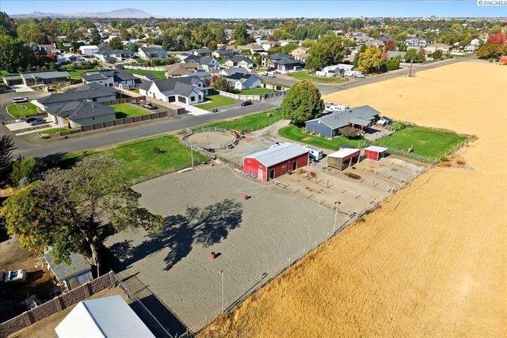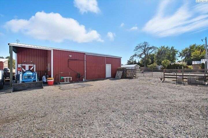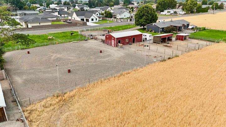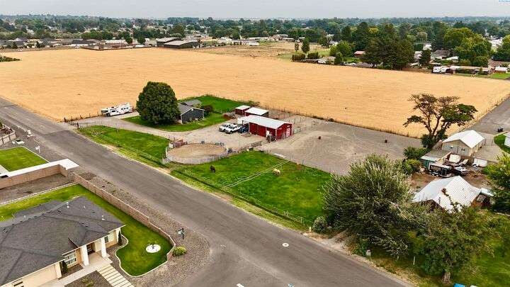 MLS# 288254 The Trifecta: A beautiful home, on sub-dividable acreage, situated within the desirable donut hole of Pasco. Ideal for equestrian enthusiasts and hobby farmers, this 1.5-acre property offers exceptional versatility. The meticulously maintained rambler provides an optimal layout, featuring three bedrooms and two bathrooms, with both a separate family room and living room to ensure efficient traffic flow. Entry to the fully fenced premises is secured with an electric gate operated by keypad , cellular and remote.A spacious utility/mud room adds further practicality, while a modern HVAC system is managed through NEST thermostats making it comfortable throughout the home. The oversized garage is equipped with its own mini-split heating and cooling system. Bedrooms are generously sized, with the Owner’s suite offering dual walk-in closets. All appliances are included with the sale. It is an Alexa smart home so most switches, lights, cameras, door locks, HVAC etc are app controlled.The backyard patio, enhanced by a majestic beamed pergola making you feel like you are in a mountainside resort, presents an inviting space for morning coffee and relaxation. Raised garden beds and a custom-designed chicken coop (with up to 19 chickens included if you like) complement the outdoor amenities. Security features include a 2 camera systems Lorex/Ring for a total of 22 cameras covering the entire property and electronically coded exterior doors for added safety. Roof was redone in 2024 with 50 year GAF shingle warranty. More extras: 30 amp RV service, 50 amp welding service, 70amps to barn and App controlled UGS. Equine facilities comprise entirely fenced and cross-fenced pastures, a five-stall barn with an electric fly sprayer in the shelter area, a lighted round pen, and a separated lighted arena for riding and exhibitions. The barn benefits from dedicated power and water supplies, including its own hot water heater, a hose and spigot for arena summer dust management, and frost-free spigots for winter use. The temperature-controlled tack room, supported by its own mini-split HVAC, safeguards food, medications, and precious equipment.Enjoy proximity to urban conveniences along with the tranquility of rural living. You just couldn’t ask for more so close to the city yet feel like you are hundreds of miles away from civilization. With subdivision potential, this property also provides valuable future opportunities.