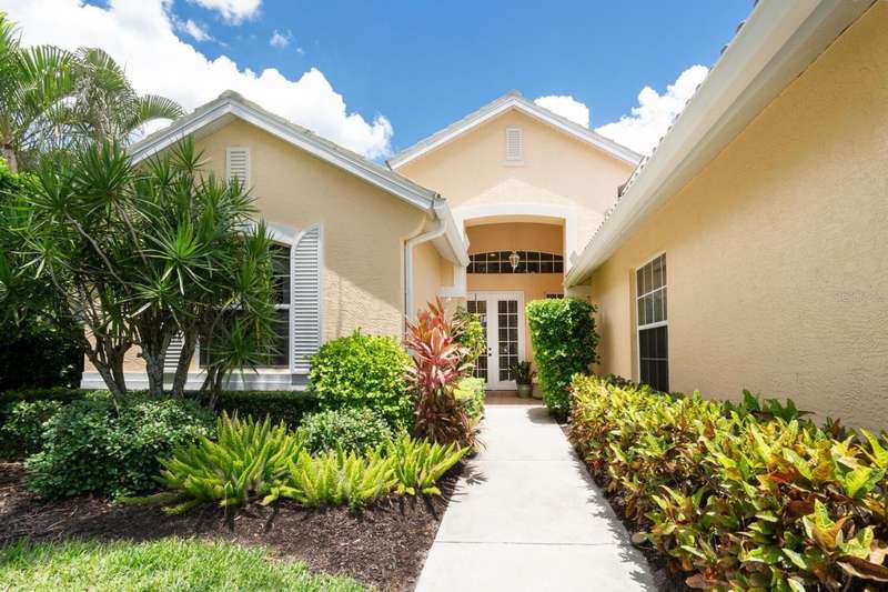 Under contract-accepting backup offers. LOCATION LOCATION LOCATION! We've all heard the timeless expression, but not all homes meet the standard. This beautiful home most certainly does! Found in the sought after neighborhood of The Greens at El Conquistador - a tucked away, intimate sized subdivision of only 43 classically designed homes with a Southern Mediterranean flair encompassed by preserves, lakes & the IMG golf course. The ease and freedom of a single family home with superior quality concrete block construction and the desirability of maintenance free yard care - perfect for a second home or those on the go! This customized home enjoys an ideal floorplan with the spaciousness of approximately 2300 square feet along with the comfortable flow of an open Great Room concept featuring soaring, volume ceilings with abundance of recessed lighting, decorative moldings, fireplace and tile floors on the diagonal. Ten foot sliders pocket for wide expanse out to the private screened pool and patio with cabana bath and deep preserve back-drop. The large, thoughtfully designed kitchen features center island with vegetable sink and an excellent layout of cabinetry with built-in appliances and extra oven. Delightful breakfast area has bay window with window seat, built-in desk and there is the convenient access from garage for bringing in groceries. Three bedrooms, smartly laid out with pocket door entry to second and third bedrooms and a grand owner's retreat with tray ceiling & huge walk-in master closet. Lovely master bath with dual sinks, garden tub with separate shower & private water closet with bidet. A/C system replaced December 2024. Super to have, brand new electric storm shutter at front entrance. Nice size interior laundry room. Also to be appreciated is the extended length of the garage to fit larger vehicles. Family and pet friendly atmosphere with sidewalks and graceful, mature landscaping. By way of a short golf cart drive, Greens residents can partake of the semi-private IMG Golf and Country Club with its championship course & Sarasota Bayfront dining. Near all conveniences with close proximity to renown IMG Academy and just 20 minutes to fun Anna Maria Island with its wonderful Gulf beaches plus the same short distance to the cultural arts and buzz of downtown Sarasota. Florida living to be cherished for the fortunate Buyer that does not delay!