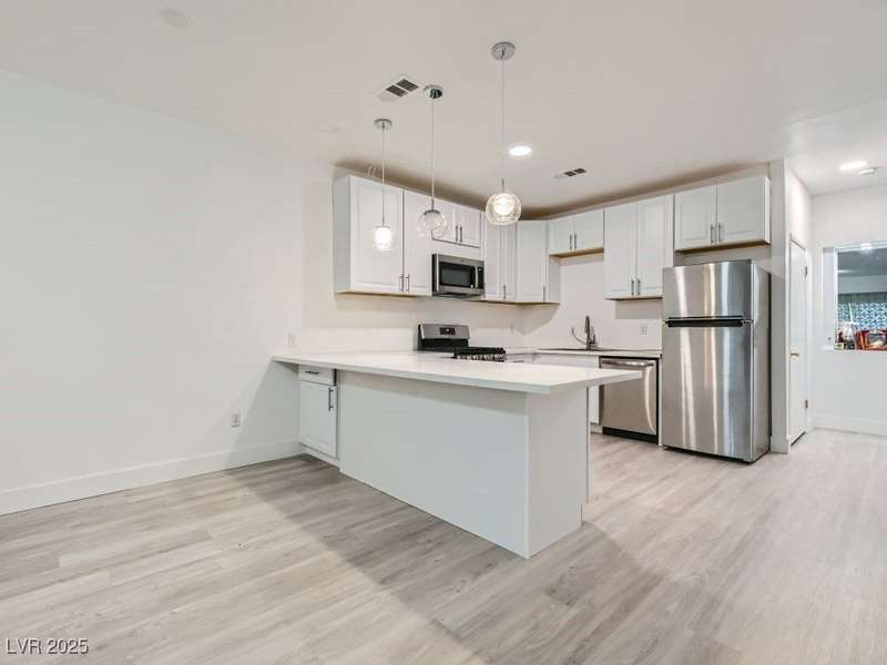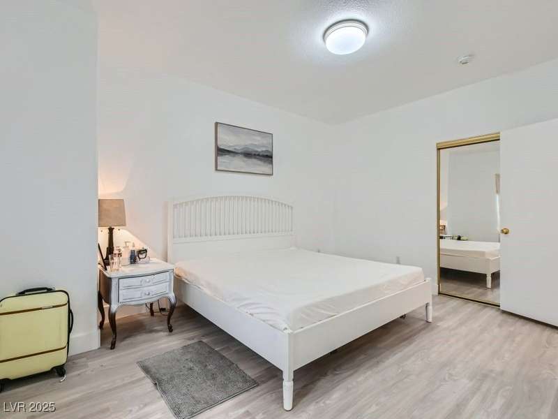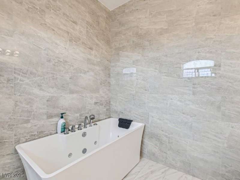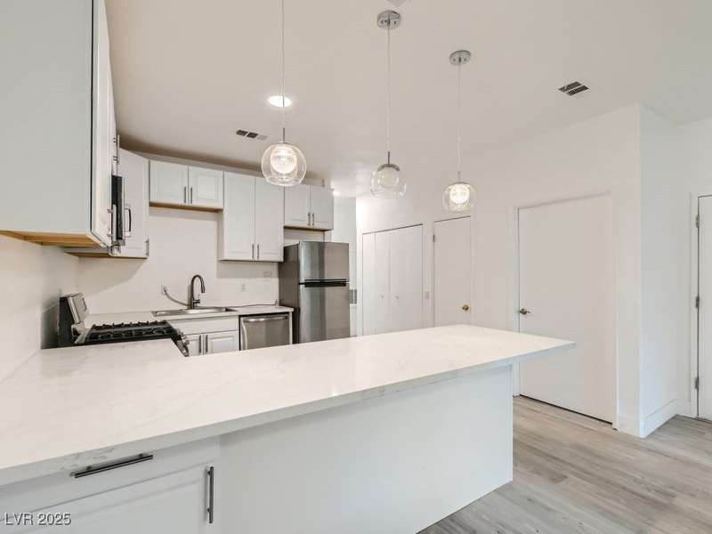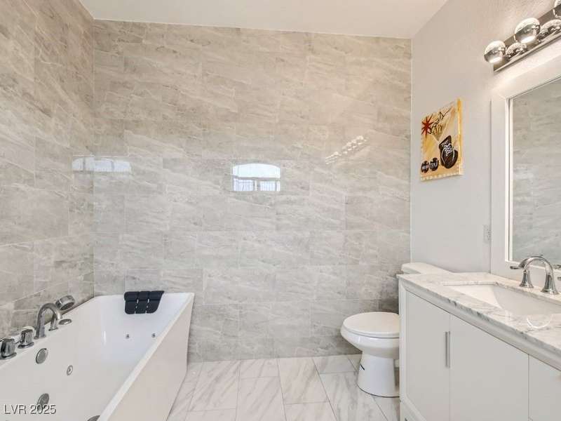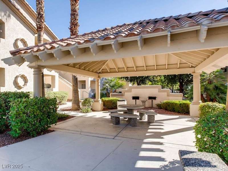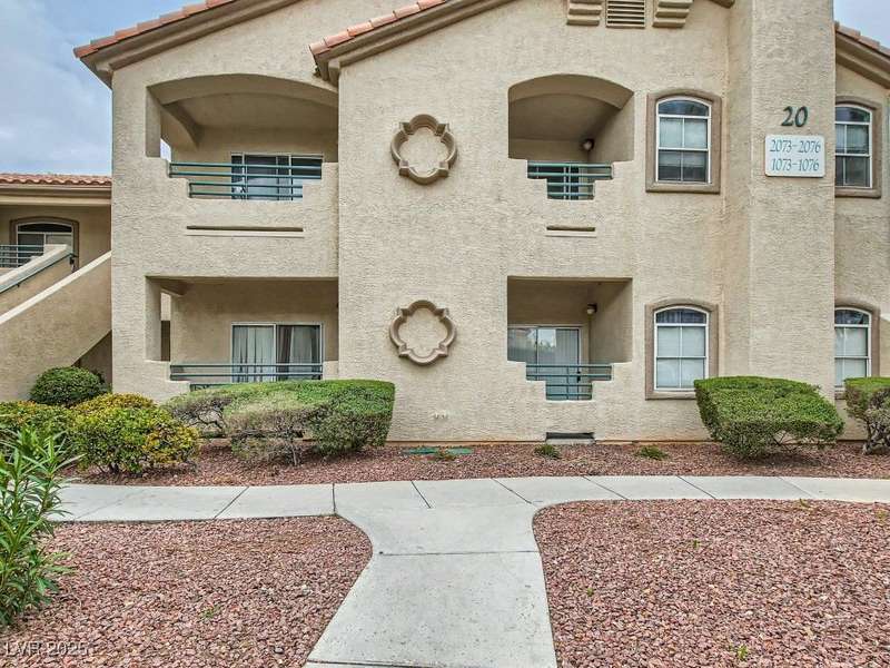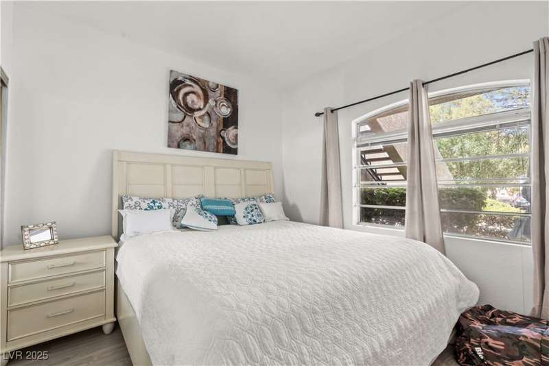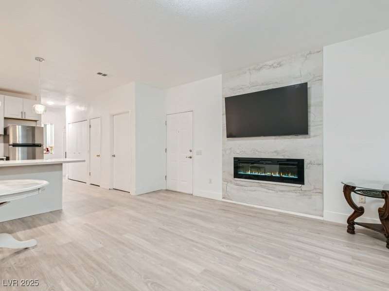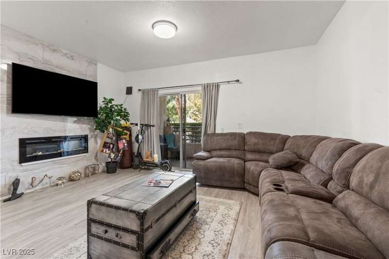 Modern and move-in ready, this 1st floor condo features an open floor plan with modern finishes throughout. The kitchen includes quartz countertops, stainless steel appliances, an extended breakfast bar, and luxury vinyl flooring. The primary suite offers a remodeled bathroom with double sinks and a free-standing soaking tub. The second bathroom features a stylish tiled walk-in shower. The living area includes an electric fireplace with a decorative accent wall and upgraded lighting throughout. Enjoy outdoor space with a private balcony. Located just minutes from the Las Vegas Strip, T-Mobile Arena, Allegiant Stadium, and the airport?this unit is ideal for those seeking modern comfort in a prime location.