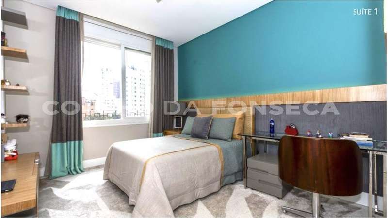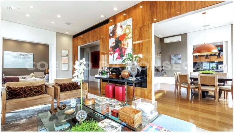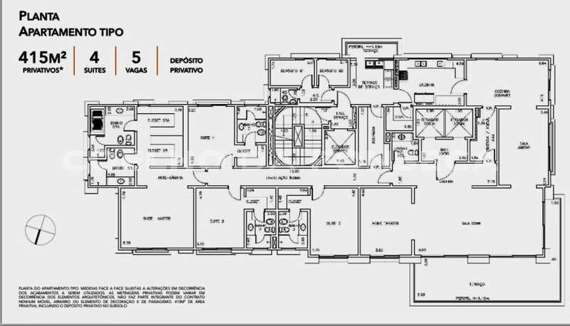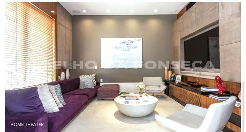 Planta modificada, com 3,35m de pé direito livre, hall entrada, amplo living, sala jantar, cozinha gourmet ampliada, home theater, escritório, closet na suíte master, terraço, rouparia, pisos em tábuas de Peroba na salas, nos banheiros mármore branco Piguês, cozinha planejada, salas com tratamento acústico de lã de rocha. 10 vagas para visitantes no 1ºsubsolo.