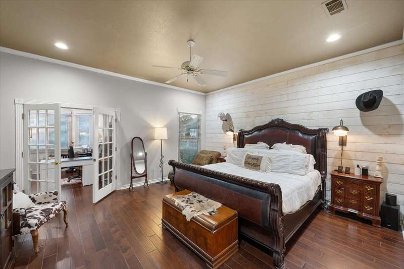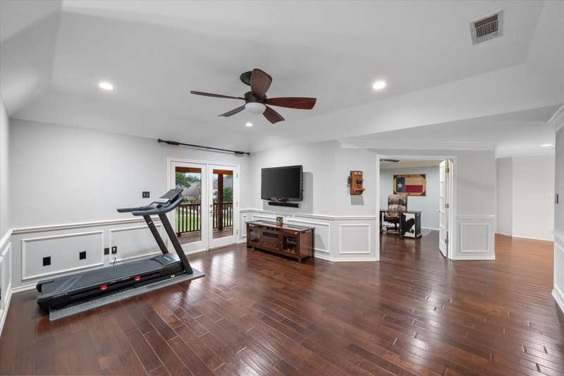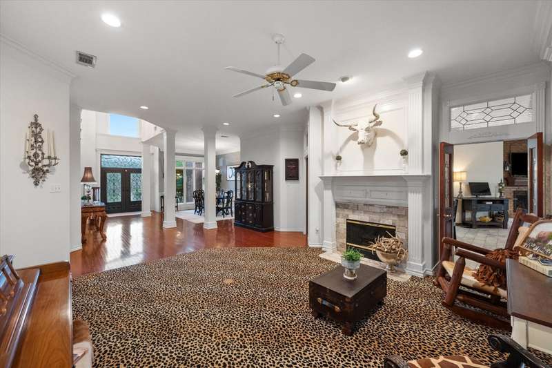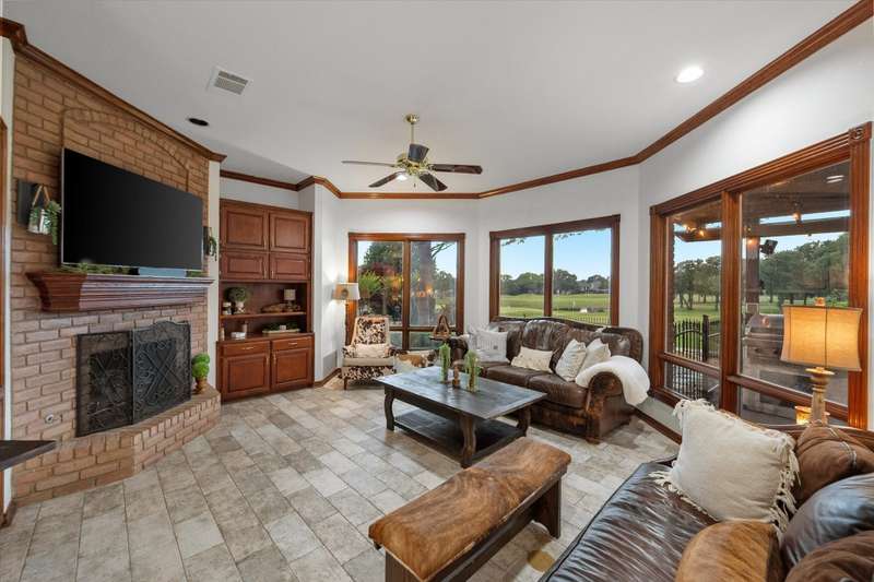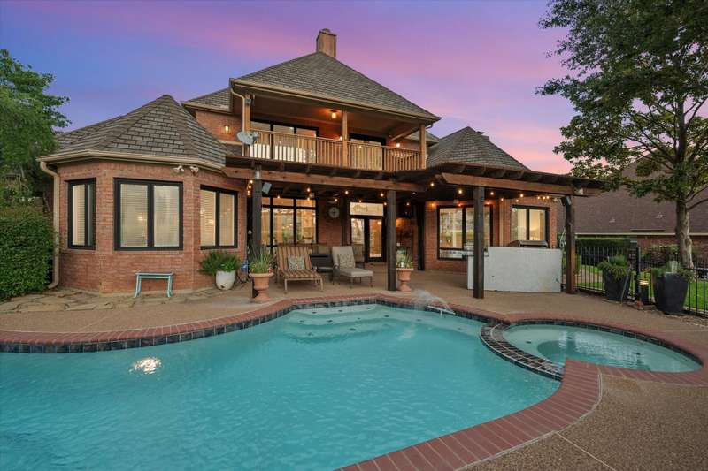 Experience elevated living in this exceptional Walnut Estates home, perfectly situated on the 13th green of the Walnut Creek Oak Course with sweeping golf course and pond views. Inside, timeless elegance meets modern comfort with rich wood, tile, and carpet flooring, custom trim and molding, and grand windows that frame the scenic surroundings from nearly every room. The expansive kitchen is designed to impress, featuring a large island, breakfast bar, stainless steel appliances, six-burner cooktop, built-in ice maker, and single ovenideal for effortless entertaining. Two staircases lead to a versatile upper level, where a spacious game room opens to a balcony overlooking the green and water, and a stunning office offers unmatched views. Downstairs, the second bedroomcurrently used as a baroffers easy conversion and flexible use. The second full bath includes direct access to the pool, enhancing convenience for guests. A generous laundry room with sink and cabinetry, two gas fireplaces, and abundant storage space add to the homes thoughtful design. Outdoors, the living experience continues with a covered patio, built-in grill, and beautifully landscaped pool areaperfect for gatherings or quiet relaxation. The oversized lot also features a separate yard space, offering privacy and room to roam. A two-car garage plus a dedicated golf cart bay completes this rare opportunity. A true gem in the heart of Mansfieldwhere luxury, views, and lifestyle come together in perfect harmony