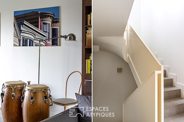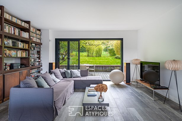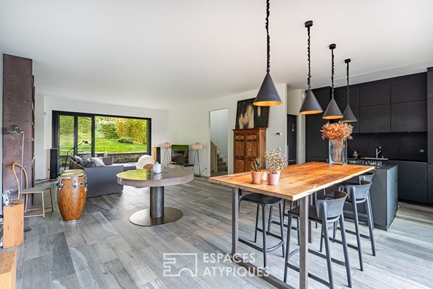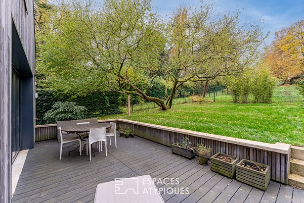 The entrance, accessed via a flight of steps, opens onto a spectacular 58 sq m living space. Bathed in light thanks to its dual aspect, it combines the living room, dining room, and a pleasant open-plan kitchen. This spacious area takes full advantage of the outdoors: on the front side, an 18 sq m extension offers breathtaking views of the surrounding greenery. On the garden side, a 27 sq m rear terrace opens onto a bucolic setting with complete privacy.