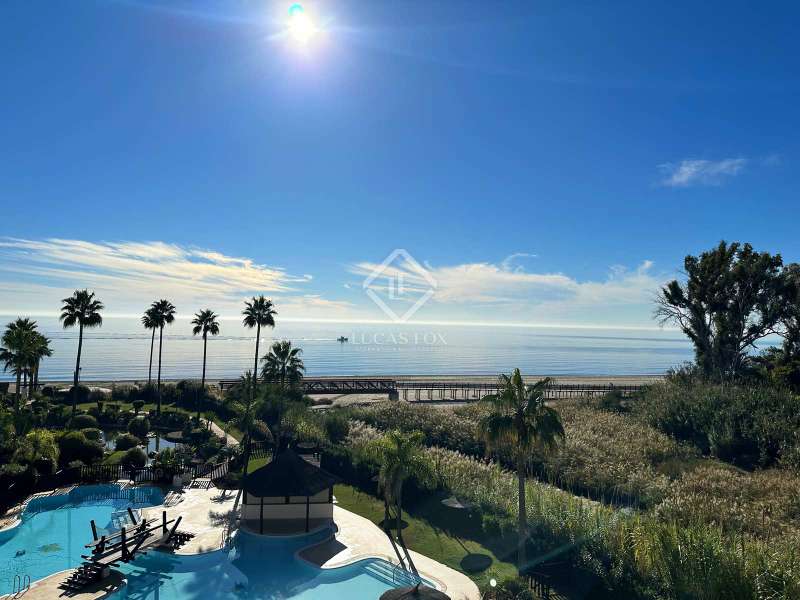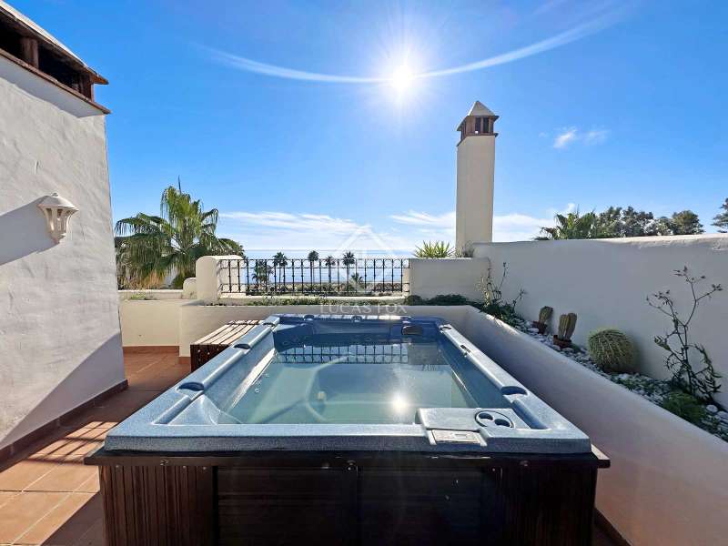This amazing penthouse with a solarium is part of the exclusive first-line development, Bahia de Velerin, strategically located on The New Golden Mile in Estepona. Surrounded by premier developments, this property offers unparalleled luxury in a unique coastal neighborhood. Enjoy private access to the stunning beach and a scenic promenade that leads directly to Estepona's city center, supermarkets, and beachfront restaurants. Only a short 10-minute drive to Marbella and Puerto Banús, this property capitalizes on the thriving amenities and services that Estepona has developed in recent years, promising an exceptional living experience on the Costa del Sol. Featuring 3 bedrooms, 2 bathrooms, and a guest toilet, the property boasts a spacious hall, a fully-equipped kitchen with a convenient food lift linked to the rooftop terrace, and a large living room with panoramic sea views and terrace access. The initial uncovered terrace provides breathtaking sea views and leads to a rooftop terrace for an even more elevated perspective. Here, a jacuzzi and barbecue area under the covered terrace make for a perfect setting to relish the best of Costa del Sol living. Situated in one of the most sought-after blocks, this property offers private and unobstructed direct sea views. The fantastic communal areas include a swimming pool with a pool bar and a scenic lake. Experience the epitome of coastal luxury living in this prime location.