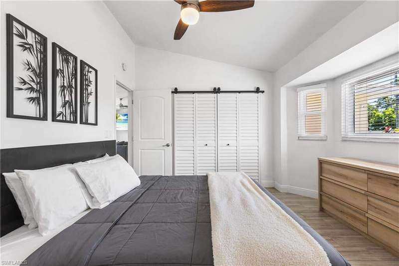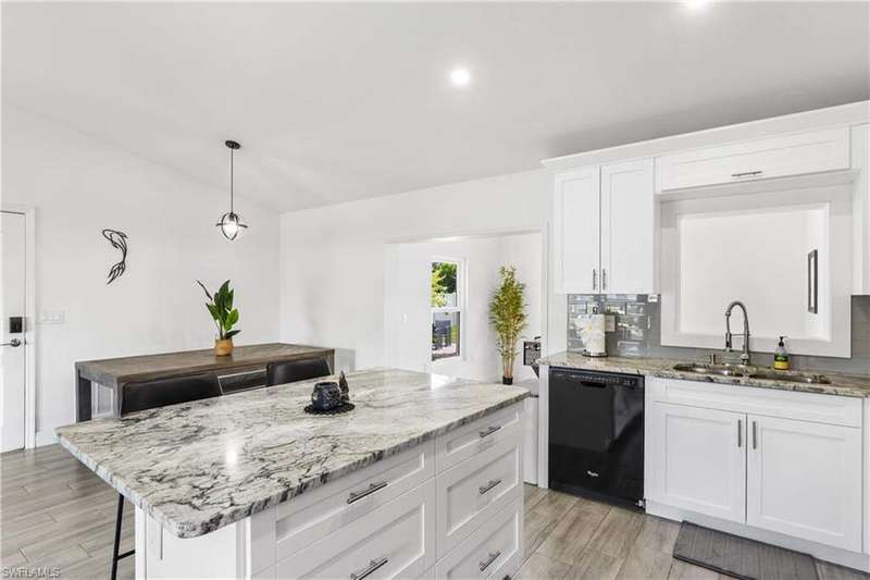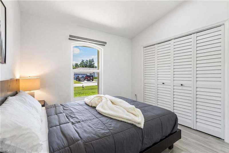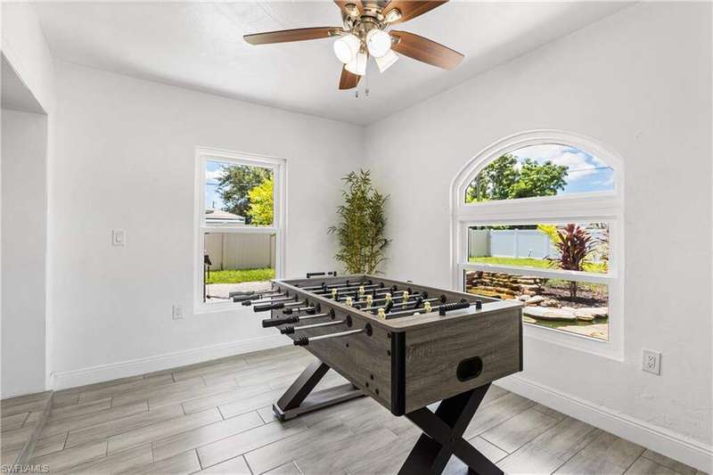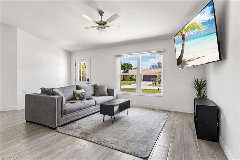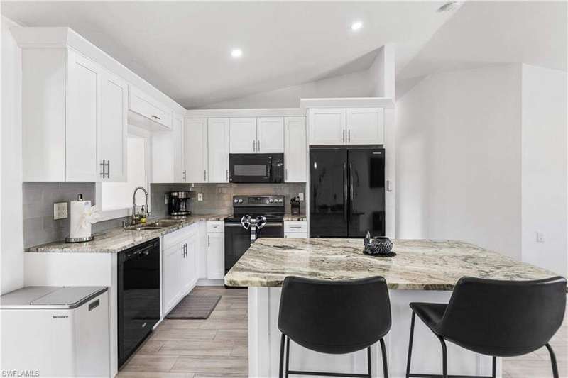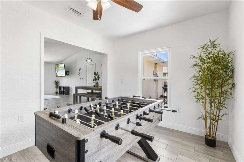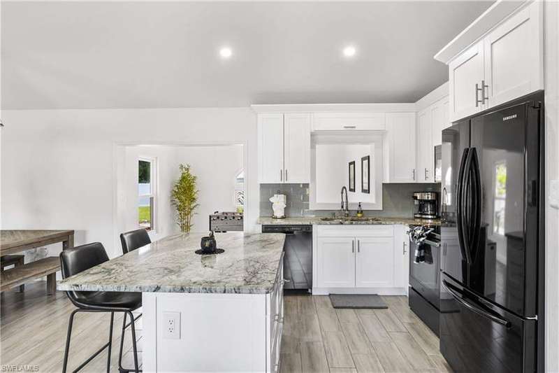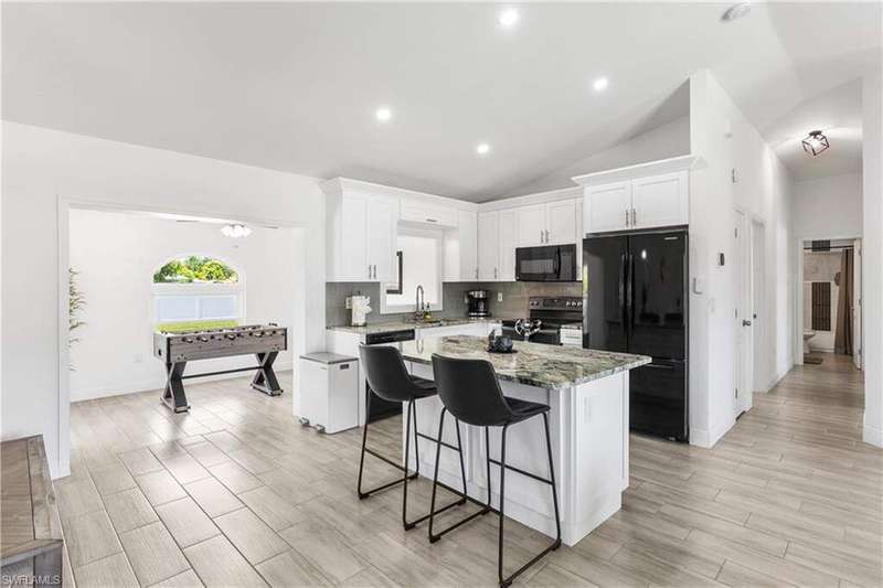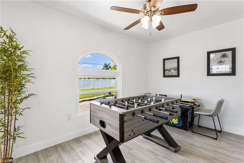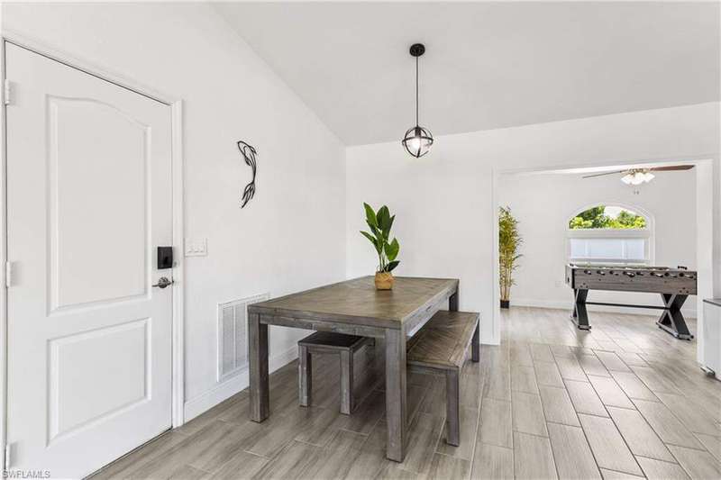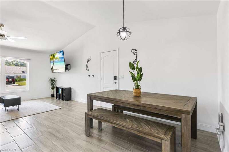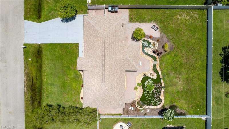Welome to the neighborhood! Solid roof! Newer AC and Water Heater! Completely remodeled with furniture included! Located in the X Flood zone and a lifestyle where you will be surrounded by caring, thoughtful neighbors and a true sense of comunity, manicured lawns and pride of ownership. You won't find another property like this one! Enjoy endless hours of entertainment with the beautiful koi pond that is the heart of the backyard, bringing life, movement, and a little magic to your outdoor space. Colorful koi fish glide through the water, weaving between blooming lily pads, while a cascading waterfall fountain adds a soothing touch. Surrounded by natural stonework and lush greenery, it truly feels like your own private escape. These cherished fish have been part of the home for years, adding charm and entertainment to everyday life. Step inside this turnkey furnished home, which has been completely renovated-perfect as a primary residence, seasonal getaway, or income producing rental with a strong history of success. Enjoy peace of mind with newer AC, roof, impact-resistant glass windows, hurricane rated garage door, and custom designer upgrades throughout. A privacy fence encloses the spacious yard, where an open-air pavered patio sets the scene for afternoon BBQs and outdoor relaxation. Located in a prime Cape Coral area, you're just minutes from shopping, dining, top rated schools, and a full service hospital. Whether you're feeding the fish, unwinding by the water, or simply soaking in the peaceful vibes, this one of a kind backyard makes every day a little more special.