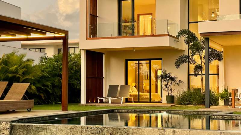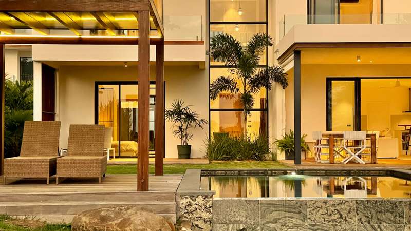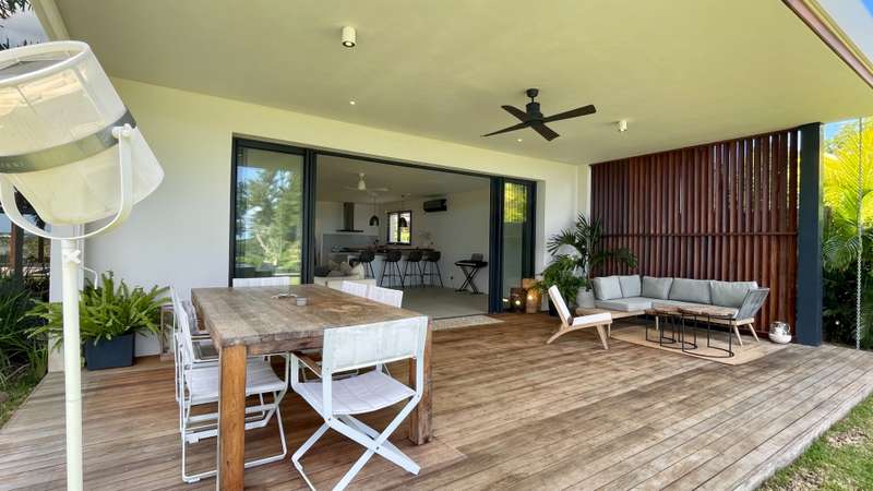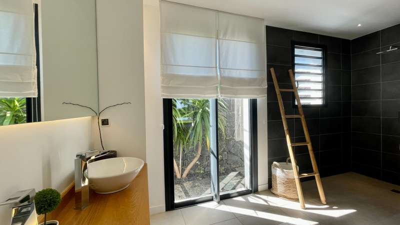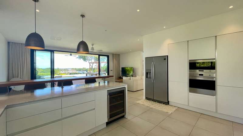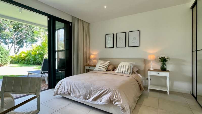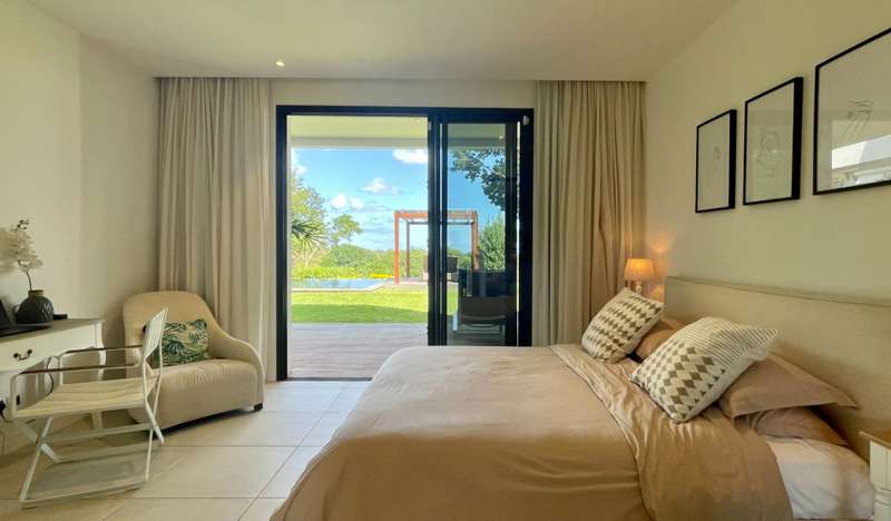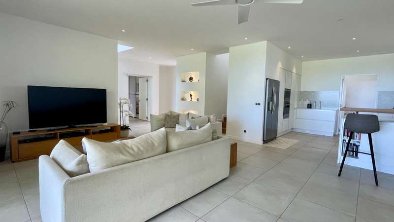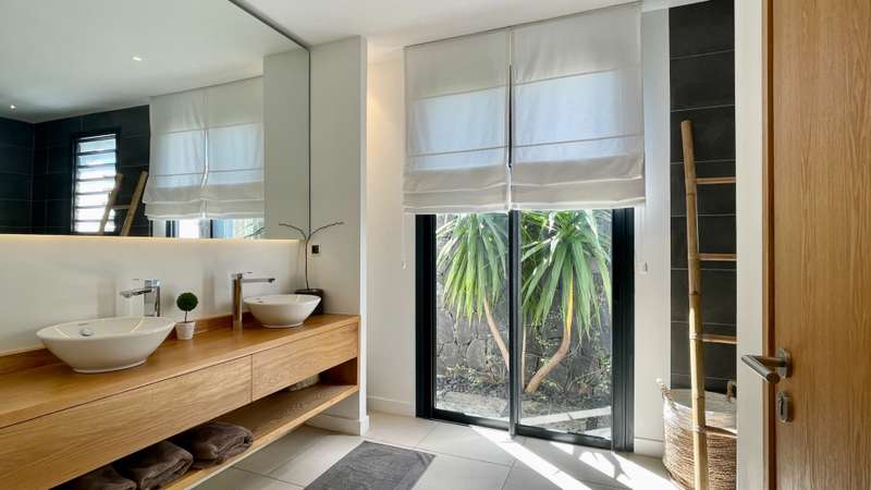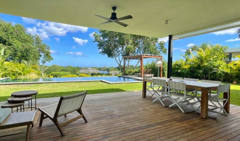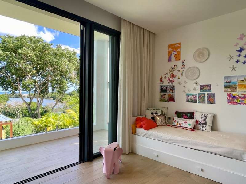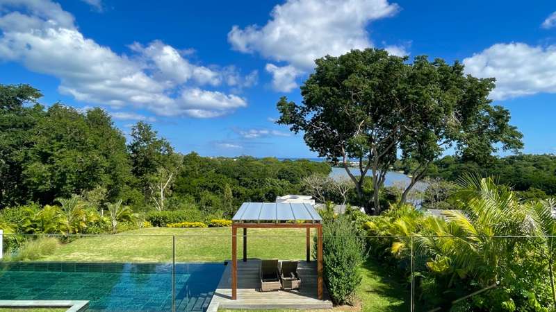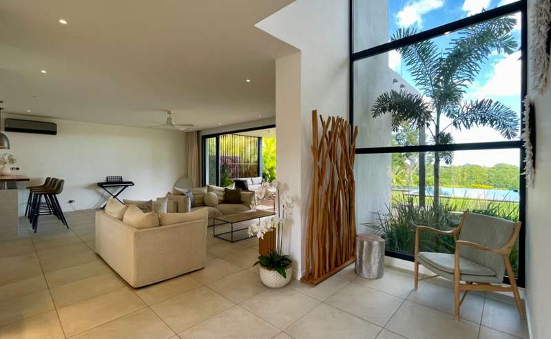 Ideally positioned in a newly built estate, this 380 m2 villa is one of the few with an incredible outlook onto the Barachois opening into Tamarin Bay. The villa boasts a wonderful garden, pool and kiosk, blessed with incredible ocean sunsets every evening. Mixing metallic, marble and clean white designs and equipment, the open-plan kitchen is semi-attached to a spacious laundry room with access to a practical courtyard. The vast living and dining room with air-conditioning opens onto a covered verandah overlooking the garden, pool and Barachois in the distance. Suitable for guests, the ground-floor bedroom includes an en-suite shower room and a private terrace giving access to the garden and pool. The three remaining bedrooms and bathrooms are found on the first floor, equipped with integrated cupboards and air-conditioning units. Boasting an exquisite walk-in closet, with automatic light fittings and customised drawers, the master bedroom benefits from the property’s exceptional views, as well as the en-suite bathroom with bathtub and double vanity. The property is fully equipped with a carport for two cars, a generator, an alarm system and garden lighting. The new owners will benefit from the estate’s club house which will open its doors at the end of 2022, as well as their private boat shuttle to Tamarin Bay. Permanent residency applicable upon purchase.