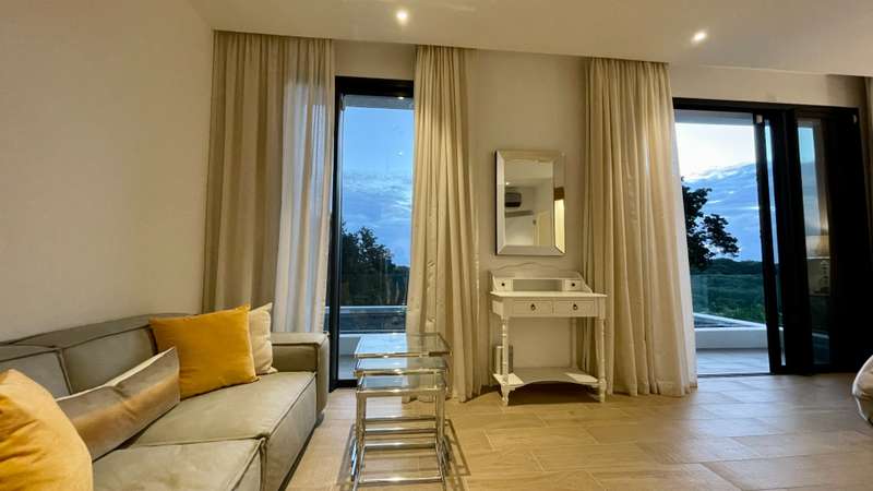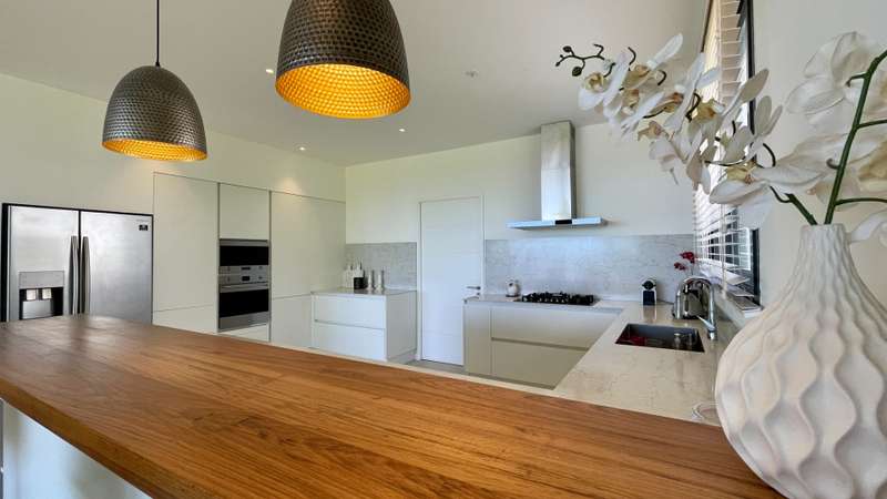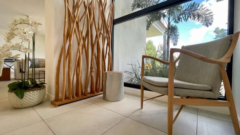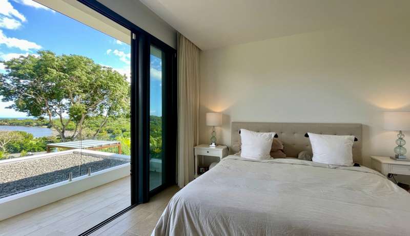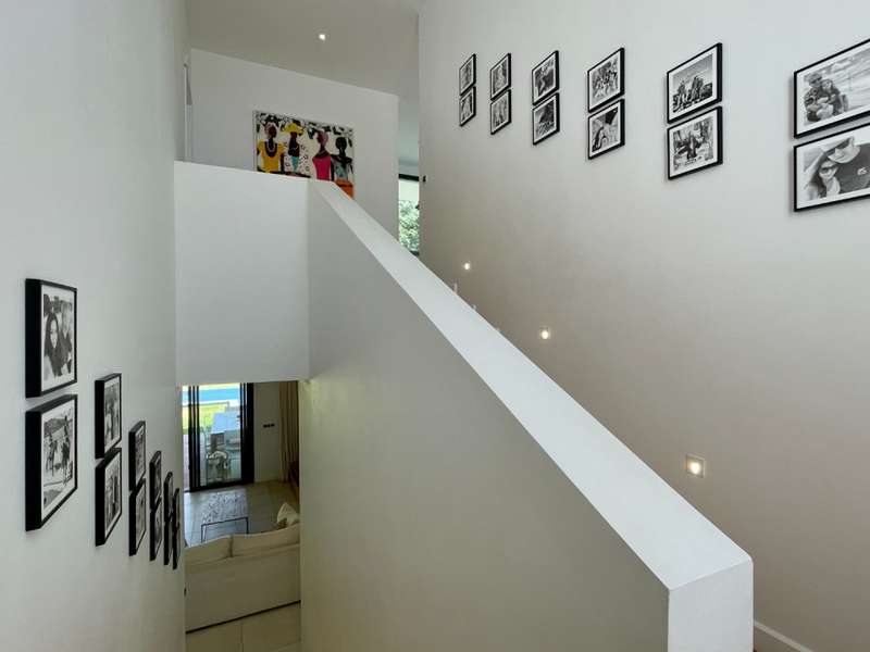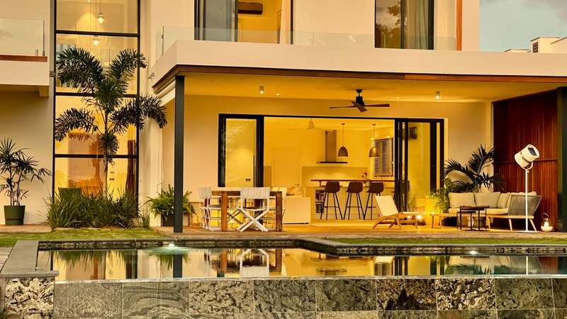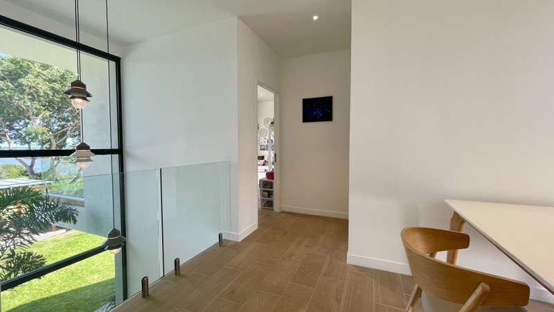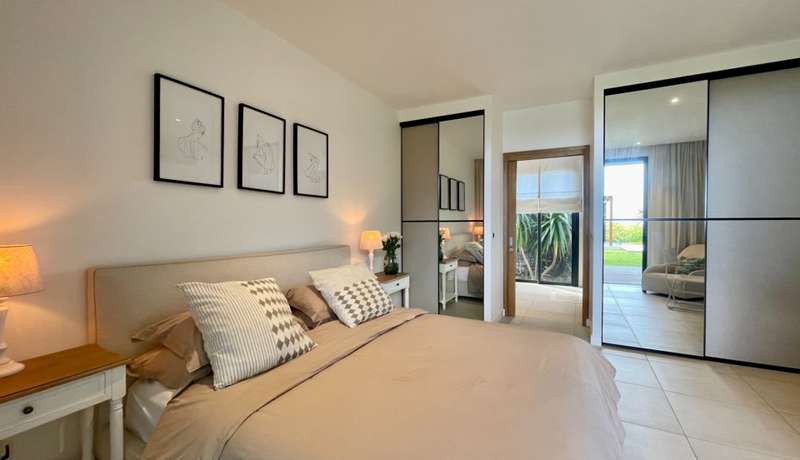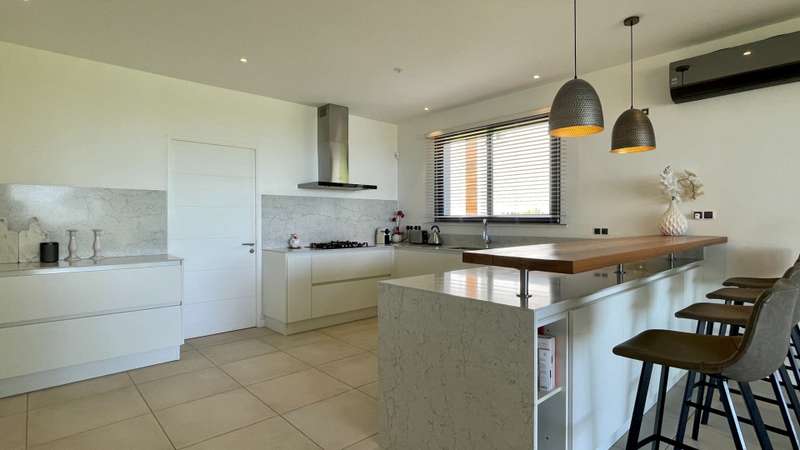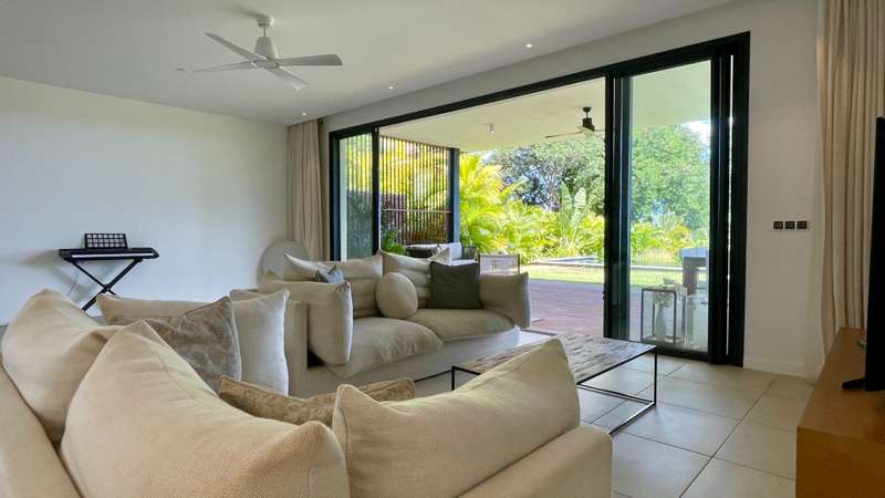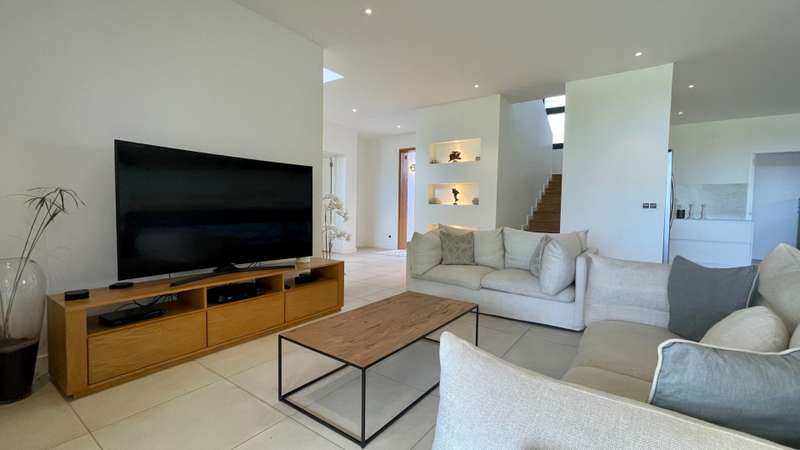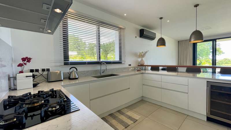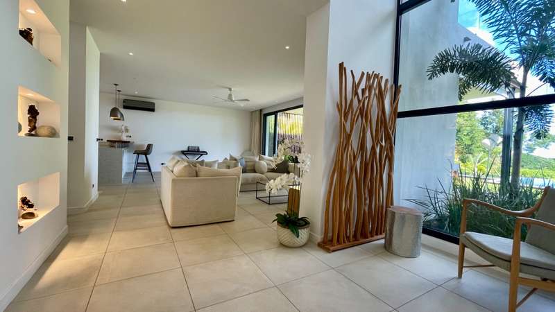 Ideally positioned in a newly built estate, this 380 m2 villa is one of the few with an incredible outlook onto the Barachois opening into Tamarin Bay. The villa boasts a wonderful garden, pool and kiosk, blessed with incredible ocean sunsets every evening. Mixing metallic, marble and clean white designs and equipment, the open-plan kitchen is semi-attached to a spacious laundry room with access to a practical courtyard. The vast living and dining room with air-conditioning opens onto a covered verandah overlooking the garden, pool and Barachois in the distance. Suitable for guests, the ground-floor bedroom includes an en-suite shower room and a private terrace giving access to the garden and pool. The three remaining bedrooms and bathrooms are found on the first floor, equipped with integrated cupboards and air-conditioning units. Boasting an exquisite walk-in closet, with automatic light fittings and customised drawers, the master bedroom benefits from the property’s exceptional views, as well as the en-suite bathroom with bathtub and double vanity. The property is fully equipped with a carport for two cars, a generator, an alarm system and garden lighting. The new owners will benefit from the estate’s club house which will open its doors at the end of 2022, as well as their private boat shuttle to Tamarin Bay. Permanent residency applicable upon purchase.