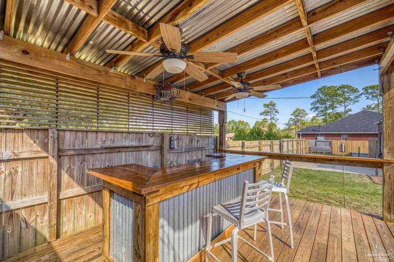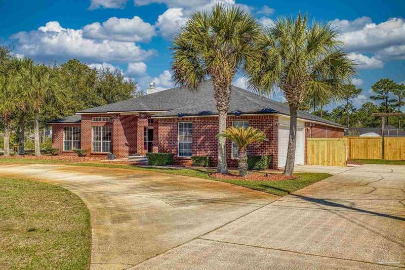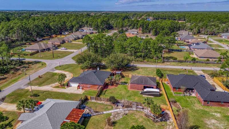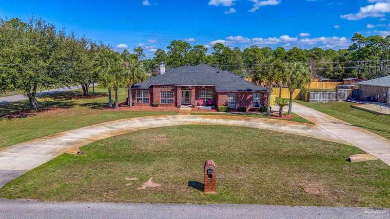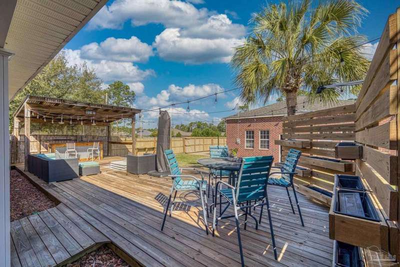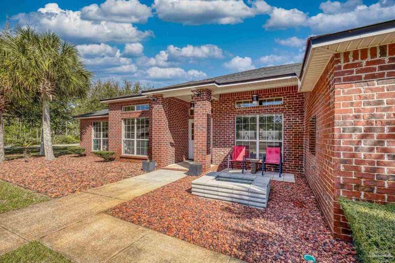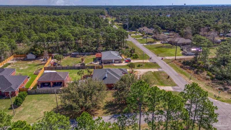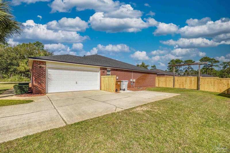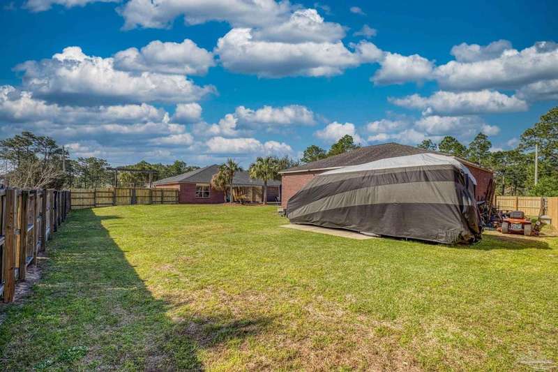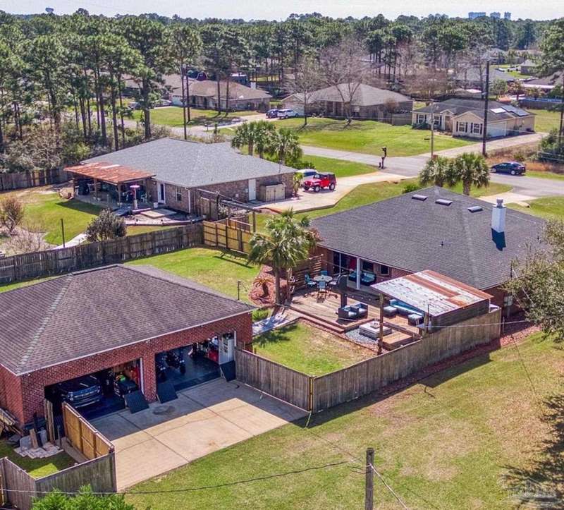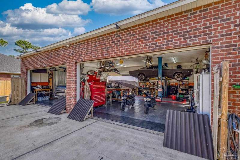 LIMITED TIME OFFERING for this home with standout feature of an additional detached - ALL BRICK - 1200 sq ft garage - perfect for the tinkerer or just to SAVE MONEY on storage. This versatile space offers endless possibilities - ideal for the ultimate game room, gym, entertainment area for holidays or other get-togethers, storing boats, classic cars, or creating a workshop or hobby area. There is a separate electrical panel, 3 large 8' tall by 16' wide roll up doors, lots of built-in storage cabinets & additional driveways. Embrace the epitome of Florida living in this expansive - meticulously maintained home, nestled on a sprawling corner lot with an on-property RV parking area in the backyard. Located off the beaten paths yet within the coveted Holley By The Sea community in Navarre. Step inside & be captivated by the generous layout, designed for seamless entertaining & comfortable living. The home boasts 4 bedrooms & 3 baths, providing ample space for everyone. There is a formal dining room & FLEX room in the front of the home that flow through to the kitchen & great room which are flooded with natural light, creating an inviting atmosphere. The interior features high smooth ceilings, hardwood flooring, updated fixtures, & open kitchen with an island & lots of counter space. The guest suite features a bath with door to the covered patio. The main suite is a true sanctuary with door to the patio & en-suite bath, offering tile flooring, 2 spacious walk-in closets, water closet, soaking tub & separate shower. Extend your living space outdoors onto the large patio & deck complete with built-in bar, NEW fire pit & planter box wall, perfect for enjoying the gentle breezes & Florida sunshine. The expansive corner .63 acre lot provides ample room for outdoor activities, gardening, or simply relaxing in your private oasis & there is plenty of shade in the back yard & also for a pool but who needs a pool since HBTS offers 3 & lots of amenities. SELLER CONCESSIONS OFFERED.
