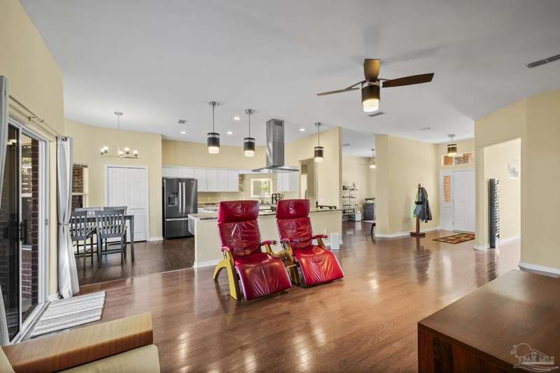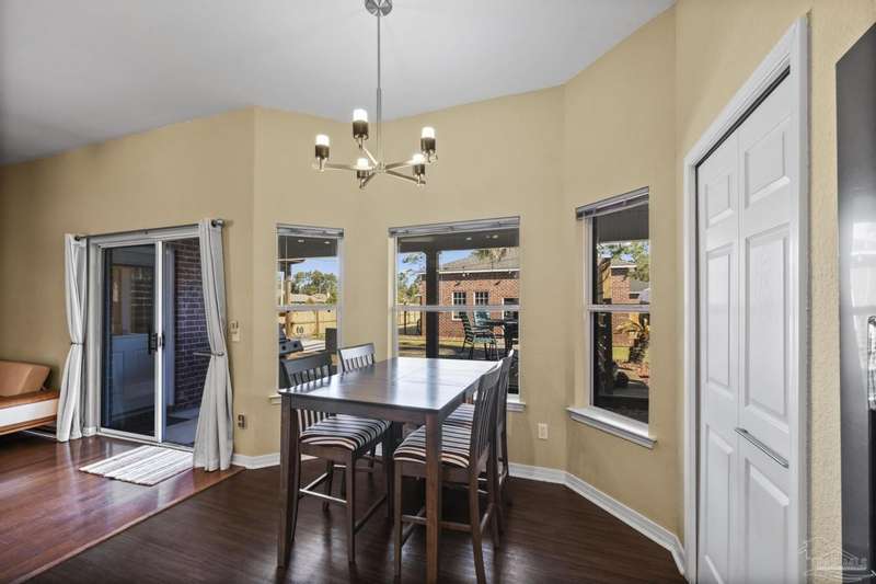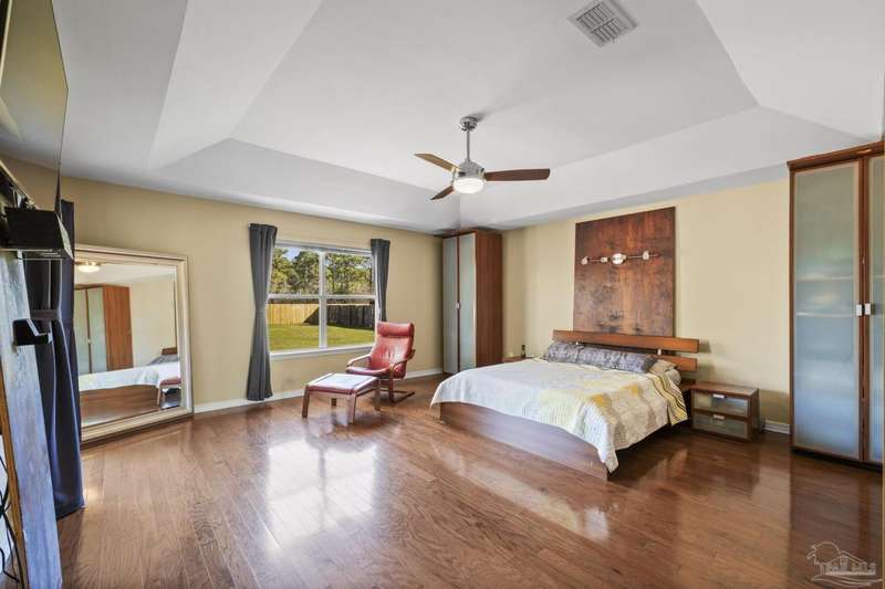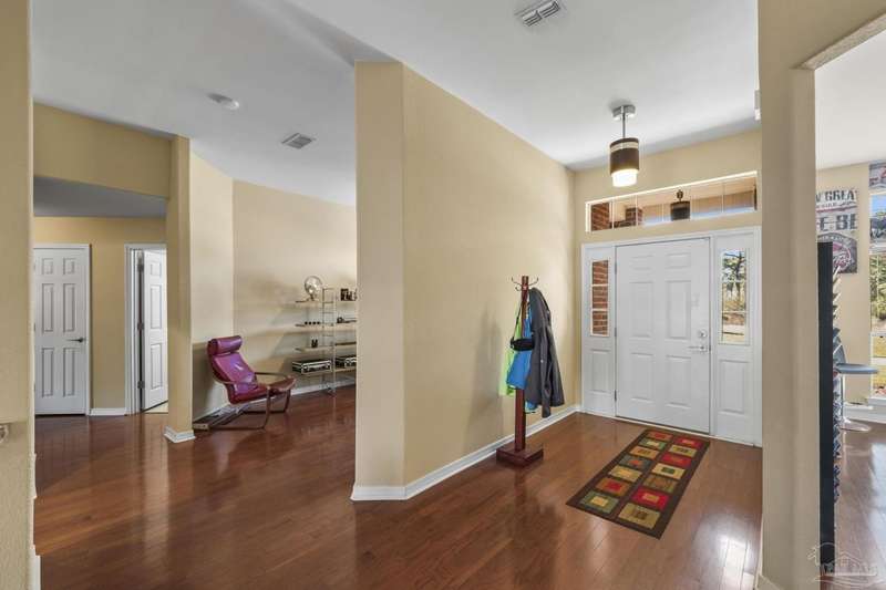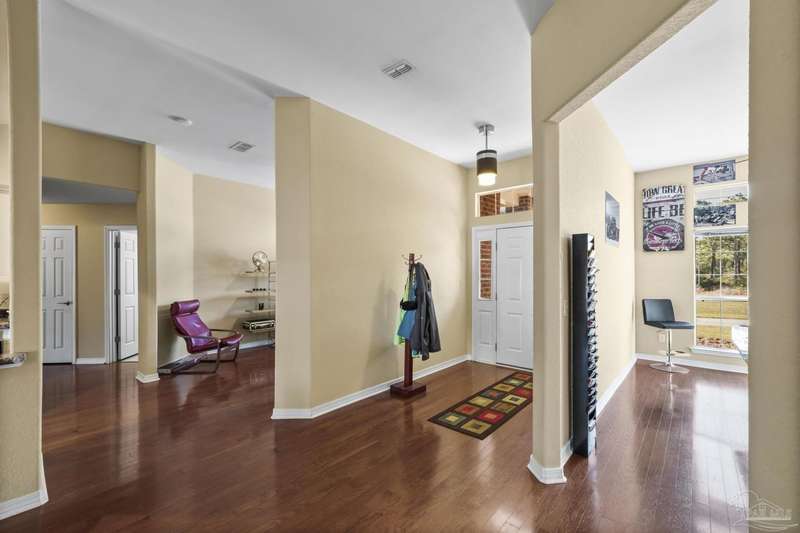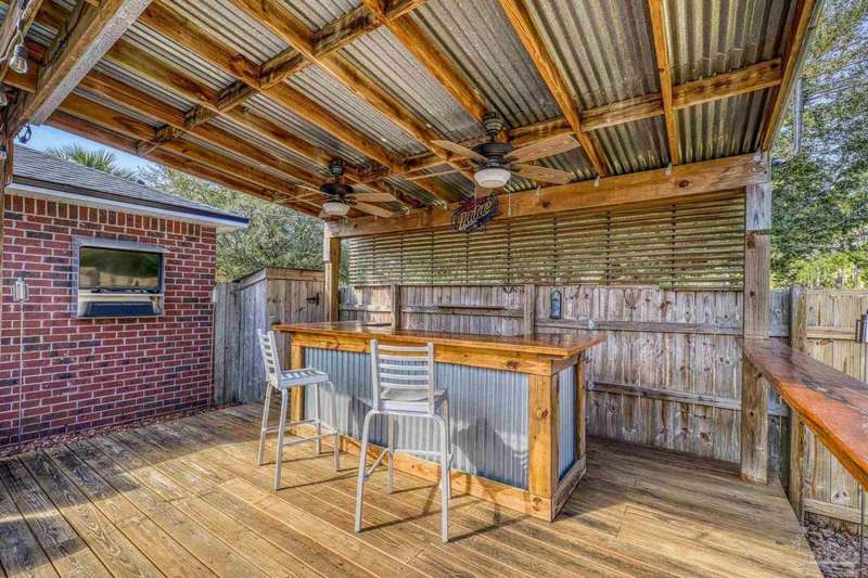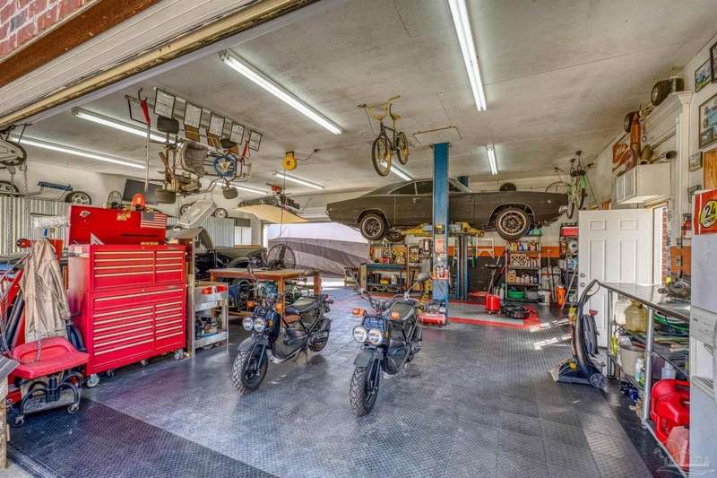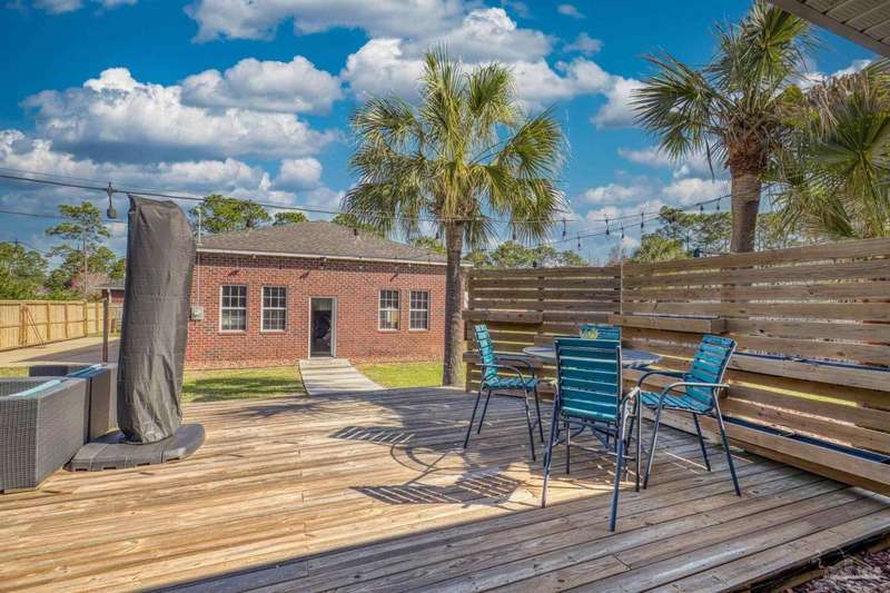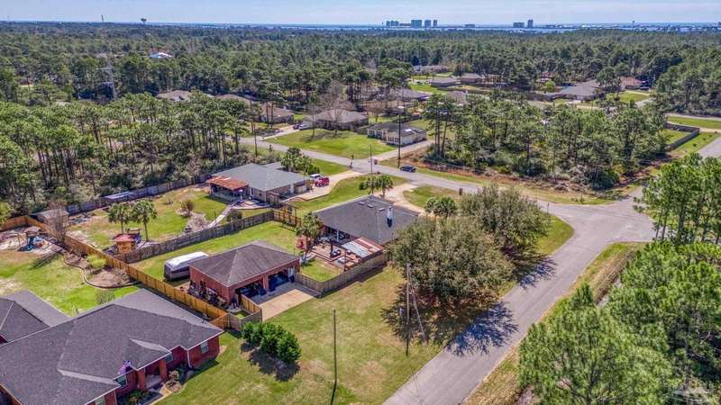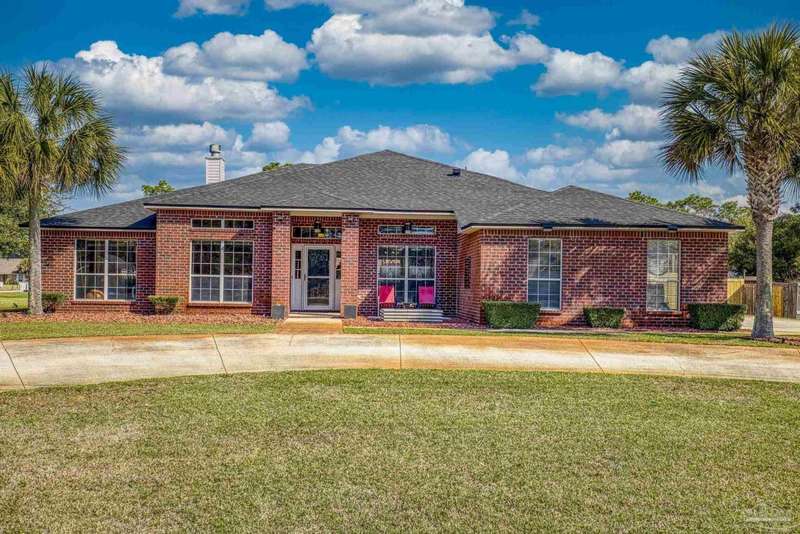LIMITED TIME OFFERING for this home with standout feature of an additional detached - ALL BRICK - 1200 sq ft garage - perfect for the tinkerer or just to SAVE MONEY on storage. This versatile space offers endless possibilities - ideal for the ultimate game room, gym, entertainment area for holidays or other get-togethers, storing boats, classic cars, or creating a workshop or hobby area. There is a separate electrical panel, 3 large 8' tall by 16' wide roll up doors, lots of built-in storage cabinets & additional driveways. Embrace the epitome of Florida living in this expansive - meticulously maintained home, nestled on a sprawling corner lot with an on-property RV parking area in the backyard. Located off the beaten paths yet within the coveted Holley By The Sea community in Navarre. Step inside & be captivated by the generous layout, designed for seamless entertaining & comfortable living. The home boasts 4 bedrooms & 3 baths, providing ample space for everyone. There is a formal dining room & FLEX room in the front of the home that flow through to the kitchen & great room which are flooded with natural light, creating an inviting atmosphere. The interior features high smooth ceilings, hardwood flooring, updated fixtures, & open kitchen with an island & lots of counter space. The guest suite features a bath with door to the covered patio. The main suite is a true sanctuary with door to the patio & en-suite bath, offering tile flooring, 2 spacious walk-in closets, water closet, soaking tub & separate shower. Extend your living space outdoors onto the large patio & deck complete with built-in bar, NEW fire pit & planter box wall, perfect for enjoying the gentle breezes & Florida sunshine. The expansive corner .63 acre lot provides ample room for outdoor activities, gardening, or simply relaxing in your private oasis & there is plenty of shade in the back yard & also for a pool but who needs a pool since HBTS offers 3 & lots of amenities. SELLER CONCESSIONS OFFERED.