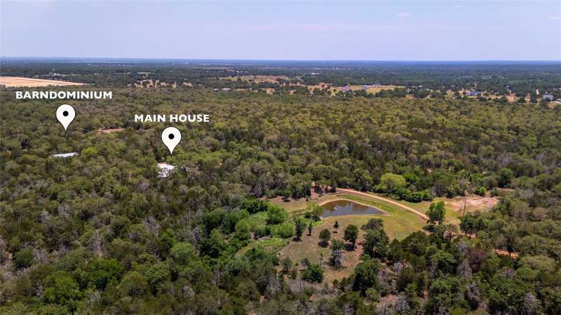 Experience the essence of Texas country living on this serene and secluded 23.45-acre retreat near charming Bastrop. Tucked among a mature tree canopy, this private estate offers a unique blend of heritage and craftsmanship. The custom-built two-story cabin evokes central Texas history with reclaimed wood flooring sourced from a historic Walburg cabin, an original 1950s stove from the Pfluger family homestead, and hand-stripped Bastrop pine columns harvested onsite to support the cathedral ceiling. These authentic details are seamlessly integrated with modern conveniences to create a residence that is both timeless and functional. The cabin is the heart of the property serving as the main dwelling and offering the primary bedroom along with another secondary bedroom and 2.5 baths all on the main level. Additional main level areas include a management center, laundry room, dedicated office/library space, a charming kitchen and large living space with foyer entry. Upstairs is one large open bedroom and bathroom originally intended to serve as a bunkroom that can accommodate multiple sleepers. A separate barndominium provides additional living space ideal for a guest house, rental opportunity, or multigenerational living, complete with an entertainment area. This flexible space offers 2 bedrooms and 2 baths with 2 separate living areas and an open kitchen to living on the main level. With 6 garage bays on property--including a dedicated RV space with hookups--there is ample room for your toys, gear, equipment and adventure essentials. Outdoors, a thoughtfully designed pond supports native wildlife, including bass and ducks, enriching the land's natural beauty. This one-of-a-kind property offers a slow and relaxed lifestyle, yet remains just a few miles from historic Bastrop, the Airport, COTA, Tesla, and the hustle and bustle of downtown Austin. Tractor may convey, see agent for details. MORE at BastropCountryCabin.com.