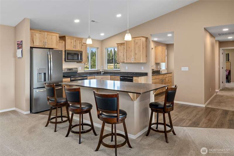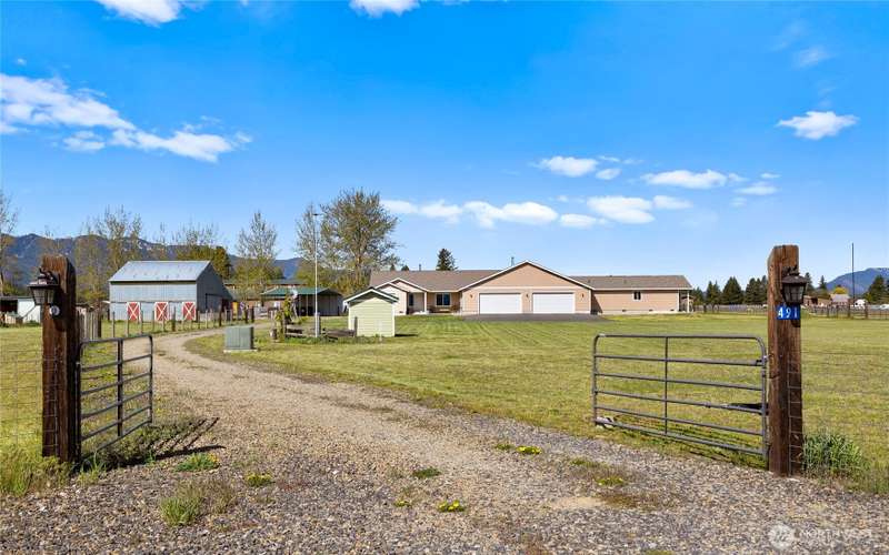 Experience the best of rural living on the outskirts of town with this 3-acre irrigated property boasting stunning, year-round Peoh Point views. The single-story home offers 2 bedrooms plus a large den/office, vaulted ceilings, and a bright open layout centered around a spacious kitchen with a large island, perfect for gatherings. Cozy up by the freestanding woodstove or retreat to the primary suite featuring a walk-in closet and dual sinks. The attached 2-bed/1-bath ADU is ideal for guests, rental income, or multi-generational living. Outdoors enjoy a 4-car attached garage, detached carport w/RV hookups, a massive shop/barn with stalls, and a fenced pasture—ready for horses or hobbies. A true blend of comfort, versatility, & country charm!