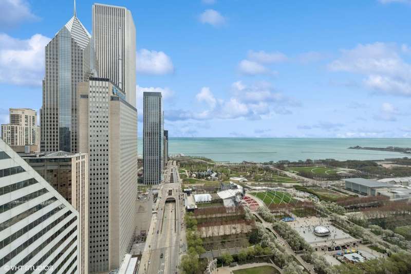 Discover urban elegance in this highly upgraded 3BR/3BA residence on the 41st floor of the Heritage, perfectly positioned on Chicago's Cultural Mile for downsizers and second home buyers seeking proximity to theater, Millennium Park, Lake Michigan, and the Museum Campus. Breathtaking North/East/West corner views of the city skyline, lake, and park unfold through floor-to-ceiling windows, amplifying the 2157 sq ft layout. Custom motorized shades, cove lighting, and bespoke cabinetry elevate the sophisticated interiors. The open kitchen, dining, and living areas feature upgraded hardwood flooring, abundant counter space, a breakfast bar, and access to a spacious recessed balcony-ideal for relaxing or entertaining. The primary suite boasts a Jacuzzi bath, separate shower, walk-in closet, and custom Abitare cabinetry. A dedicated laundry room (not a closet), guest suite, and third bedroom/home office with tailored desk and shelving add practicality and charm. Enjoy Crestron-controlled Lutron lighting and Boston Acoustics surround sound for effortless ambiance. Building amenities include an indoor pool, hot tub, saunas, fitness center, community rooms & co-working space, dog run, 24/7 door staff, and direct pedway access to rail transit for seamless O'Hare connections. Steps from world-class theater, Symphony Center, Art Institute, Museum Campus, and lakefront trails, this home offers vibrant city living with the serenity of a well-appointed retreat. Stroll to Millennium Park's Lurie Gardens, sail from Monroe Harbor, or dine along the Magnificent Mile-all just outside your door.