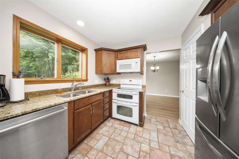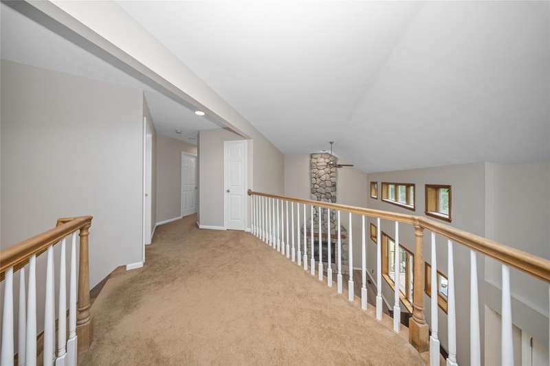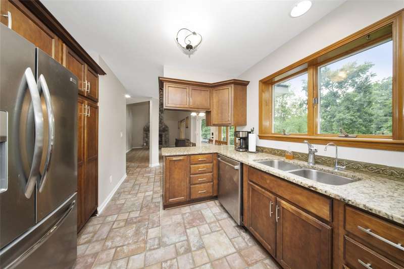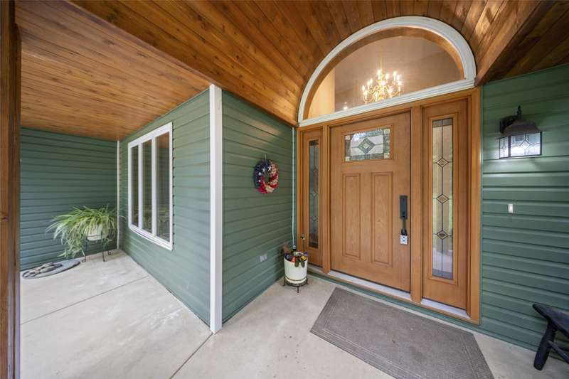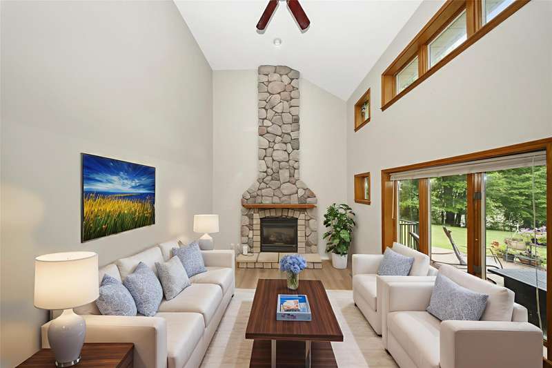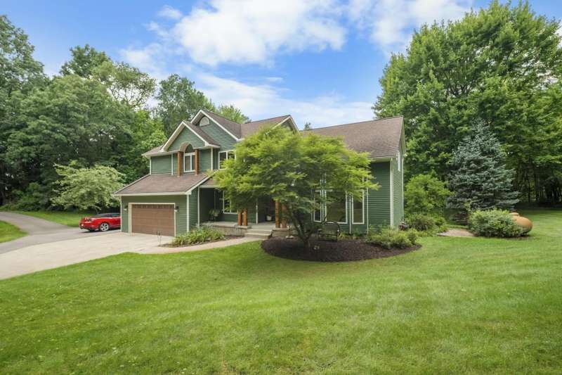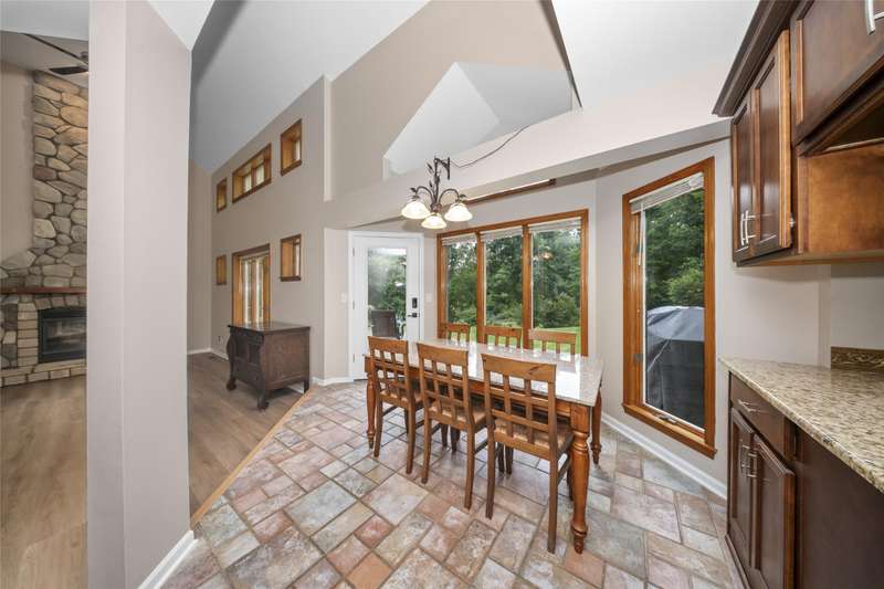 **Beautiful Contemporary Home on Over 5 Acres with Scenic Water and Wooded Views** Nestled on more than five acres of lush woods and tranquil water views, this four-bedroom contemporary residence offers a wonderful open floor plan. The soaring cathedral ceilings accented with wood beam details and unique angular design create an inviting atmosphere. A stunning floor-to-ceiling stone fireplace adds warmth and charm, perfect for cozy evenings overlooking the spacious backyard. The kitchen and bathrooms feature elegant granite countertops, combining style with durability. Recent upgrades include brand-new vinyl plank flooring and fresh interior paint throughout, enhancing the home's fresh appeal. The expansive, high-end truck deck provides ample outdoor space, complemented by a newer circular driveway for easy access. A generous 60x30 pole barn offers plenty of room for storage and hobbies, ready to accommodate your toys and projects. This exceptional property combines natural beauty with thoughtful design—truly a must-see!