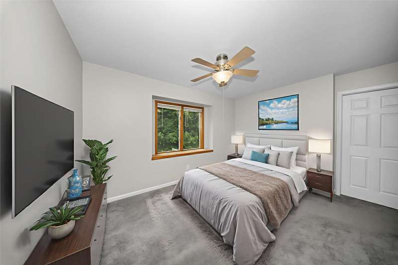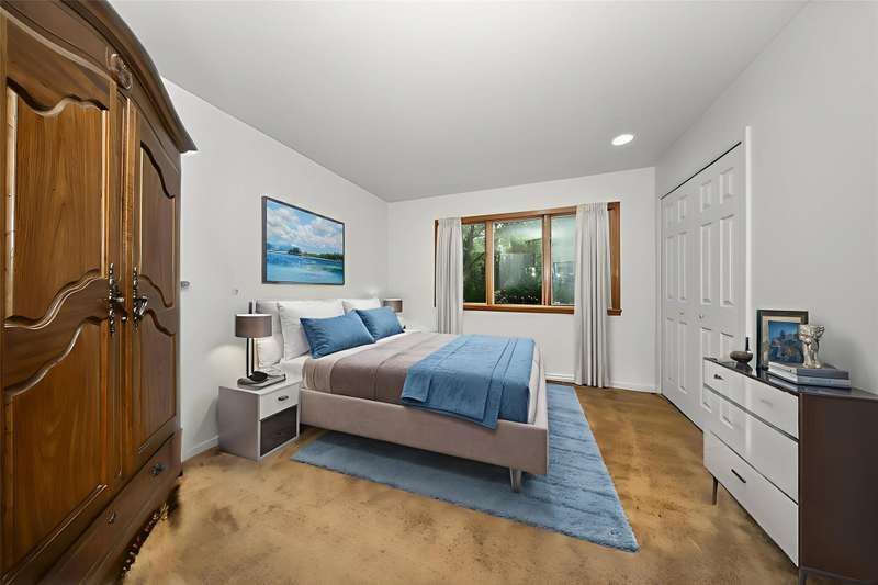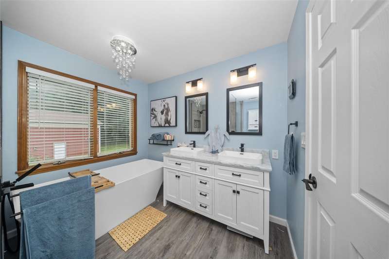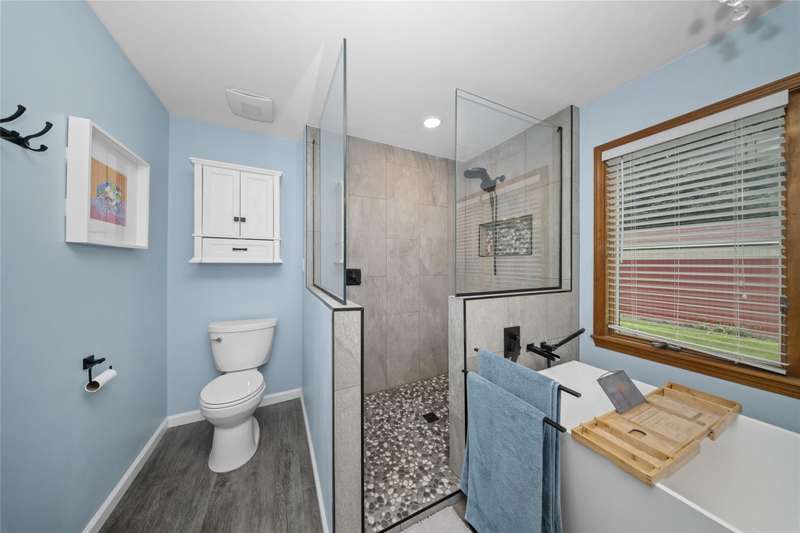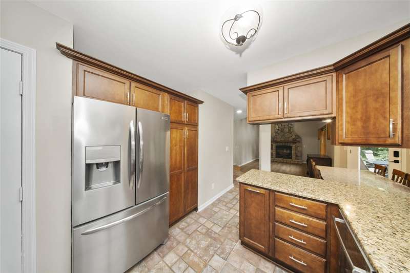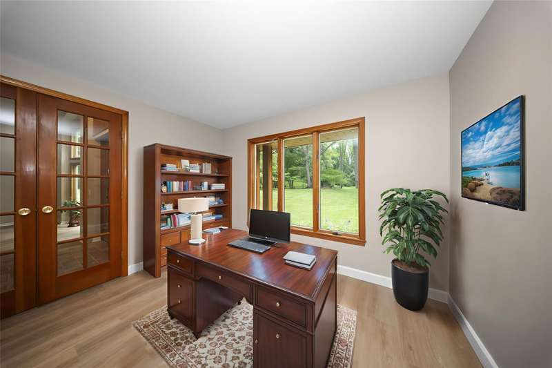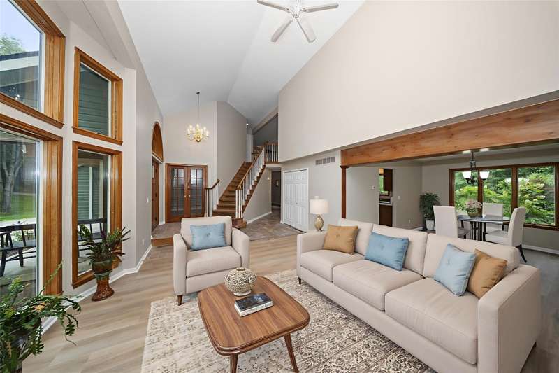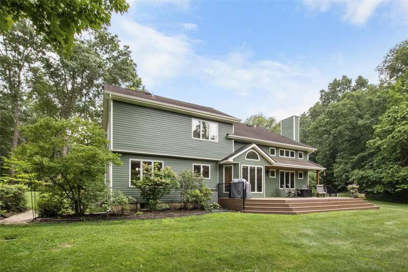 **Beautiful Contemporary Home on Over 5 Acres with Scenic Water and Wooded Views** Nestled on more than five acres of lush woods and tranquil water views, this four-bedroom contemporary residence offers a wonderful open floor plan. The soaring cathedral ceilings accented with wood beam details and unique angular design create an inviting atmosphere. A stunning floor-to-ceiling stone fireplace adds warmth and charm, perfect for cozy evenings overlooking the spacious backyard. The kitchen and bathrooms feature elegant granite countertops, combining style with durability. Recent upgrades include brand-new vinyl plank flooring and fresh interior paint throughout, enhancing the home's fresh appeal. The expansive, high-end truck deck provides ample outdoor space, complemented by a newer circular driveway for easy access. A generous 60x30 pole barn offers plenty of room for storage and hobbies, ready to accommodate your toys and projects. This exceptional property combines natural beauty with thoughtful design—truly a must-see!