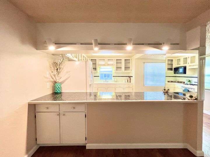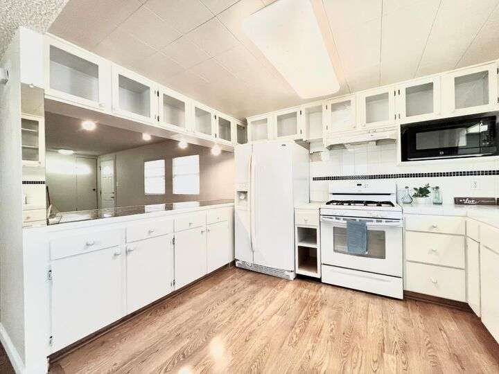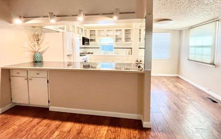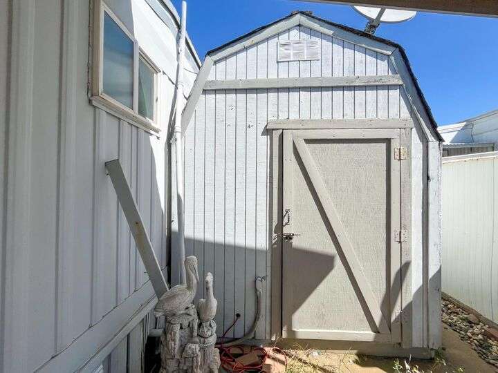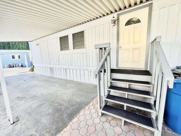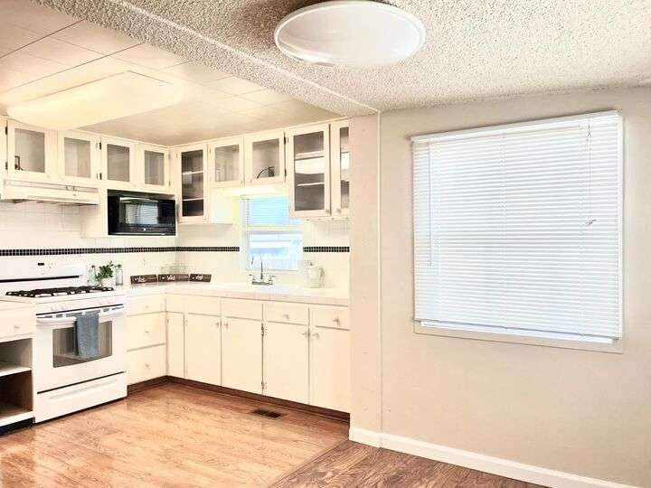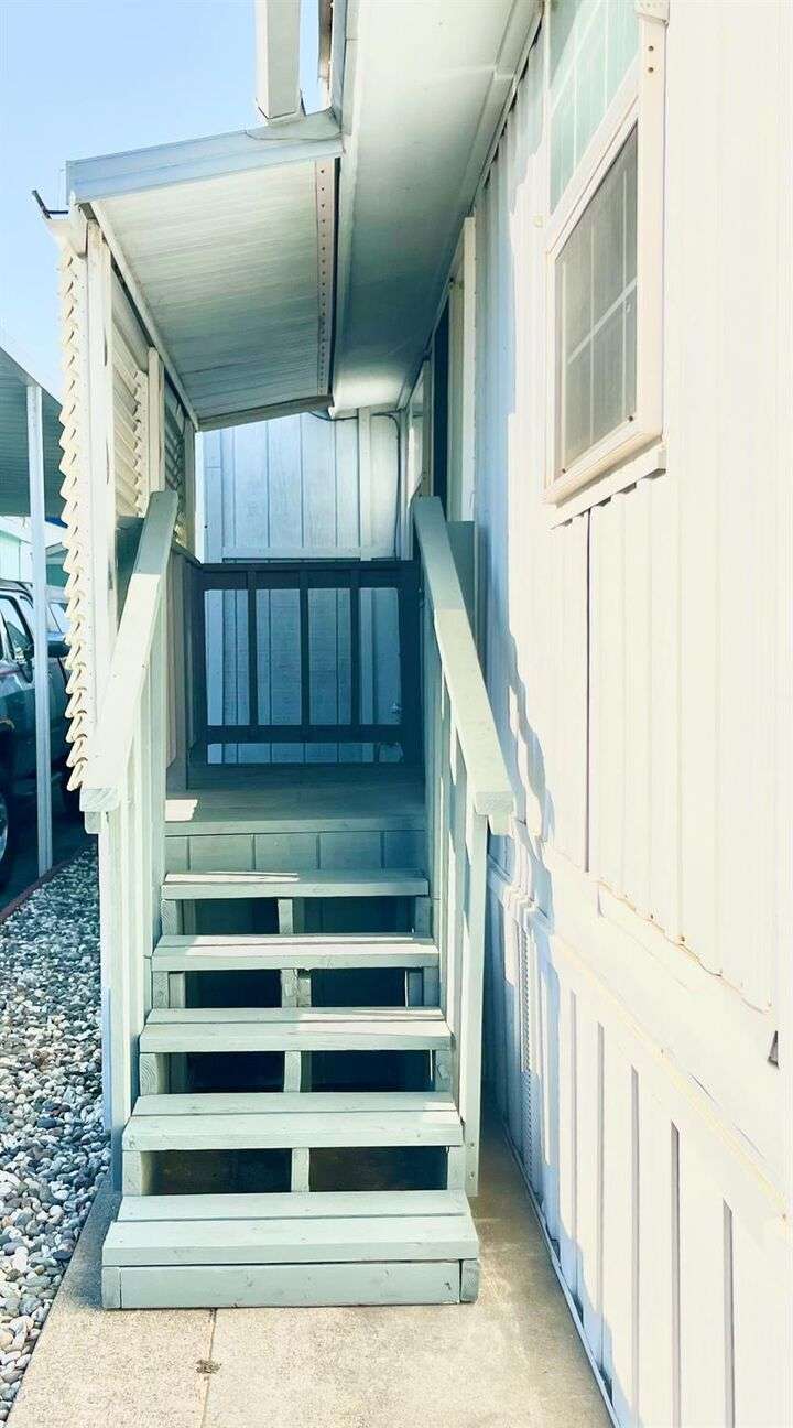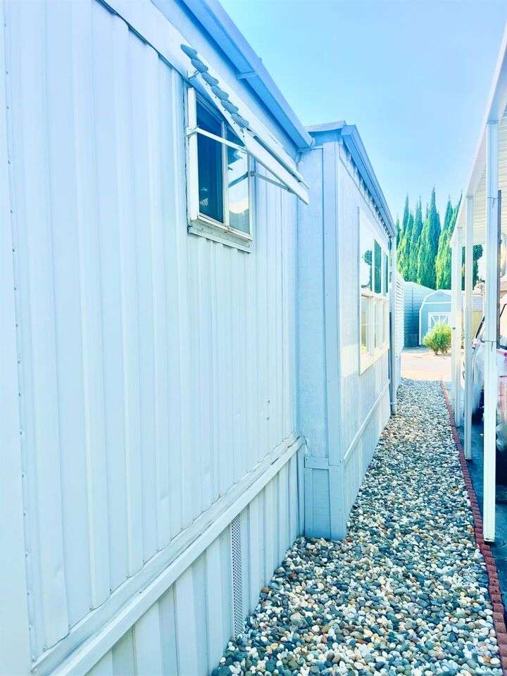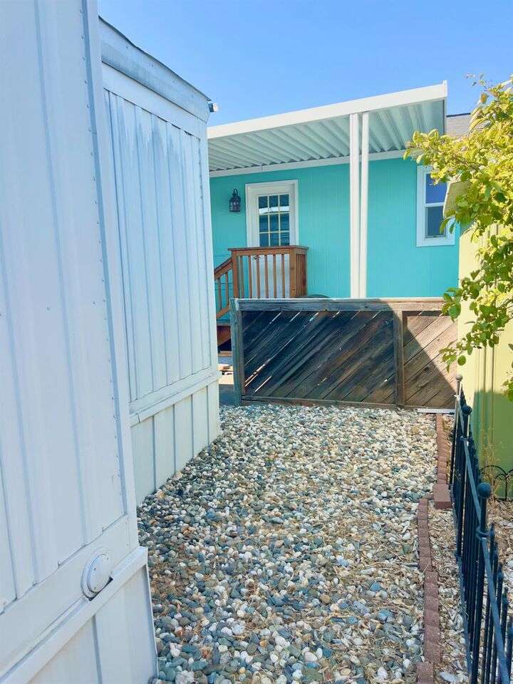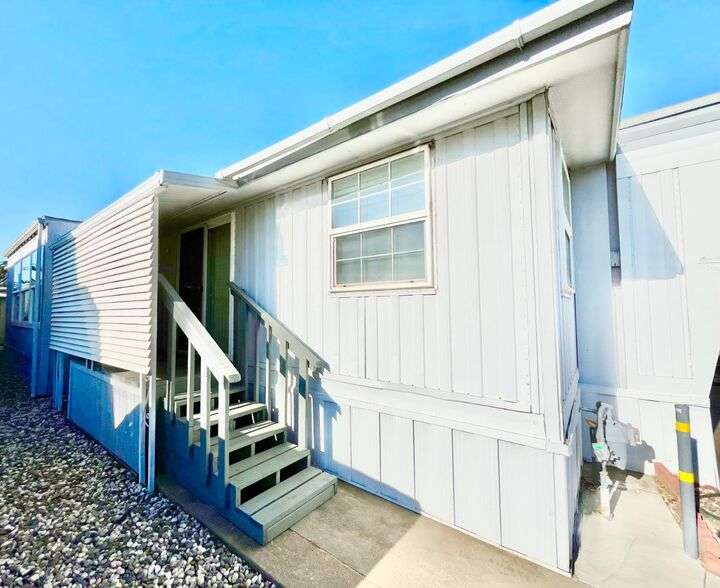 This delightful 2-bedroom, 1-bath home is situated in Mobil Country Club, a quiet and well maintained 55+ community in Rancho Cordova. It features beautiful flooring throughout, with plush new carpet in the spacious primary bedroom, which includes three closets with mirrored doors. The kitchen is open and inviting, offering a granite-top dining bar with overhead lighting, a gas range, and a charming farmhouse sink. The bathroom has a large vanity, fresh paint, a new toilet, step-in shower, and grab bars for added safety. Dual pane windows fill the home with natural light, and the A/C keeps it cool with floor vents throughout. Bedroom two offers tile flooring, three large windows, and a mirrored closet. Outside, enjoy a low-maintenance yard with brand-new stairs to the front door and a large storage shed. The community offers a pool and clubhouse, and is conveniently located near shopping and freeways.