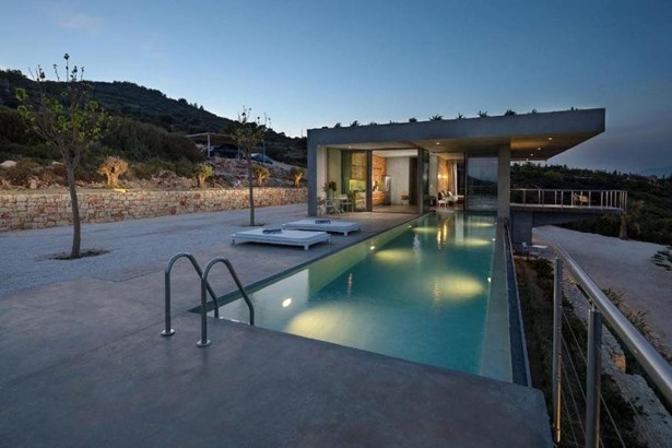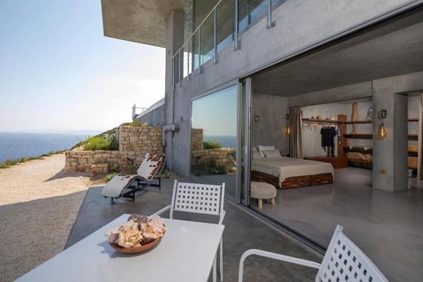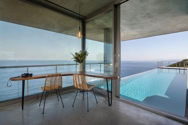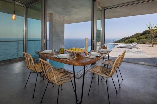 This modern design villa has been finished with locally sourced concrete, glass, wood and limestone. It boasts 180° panoramic views of the Ionian Sea; leading onto the neighbouring island of Kefalonia. A 15m long infinitiy pool compliments the different shades of blue given from the summer skies and Mediterranean Ocean. Private sea access make this villa that ever more desirable.