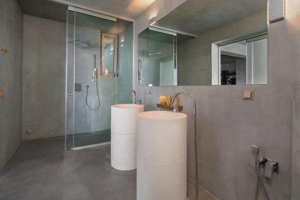The spacious one bedroom villa of 150sqm is split over two levels. The large en-suite bedroom with walk-in closet has large glass doors with direct views to the sea. There is ample space to create a further two bedrooms on the lower ground floor if desired. Upstairs you can find a large open-plan kitchen/living area with immediate access to the pool. The living room is backed by a 3D Greek walnut wood wall and illuminated by local olive wood luminairies. There is a second bathroom also located on the upper storey; the free-standing sinks in both of the bathrooms have been made using Zakynthian limestone. An incredible walk-out balcony sits adjacent to the living room and leads you even closer to the sounds of the waves. The wooden pergola creates the perfect setting for some sun-rise yoga, or late night relaxation in the hammock.