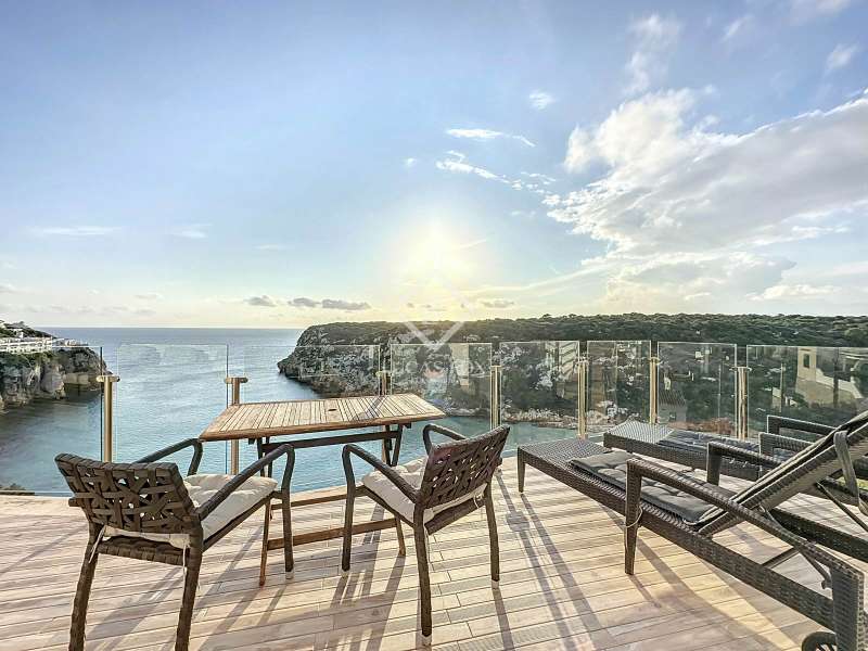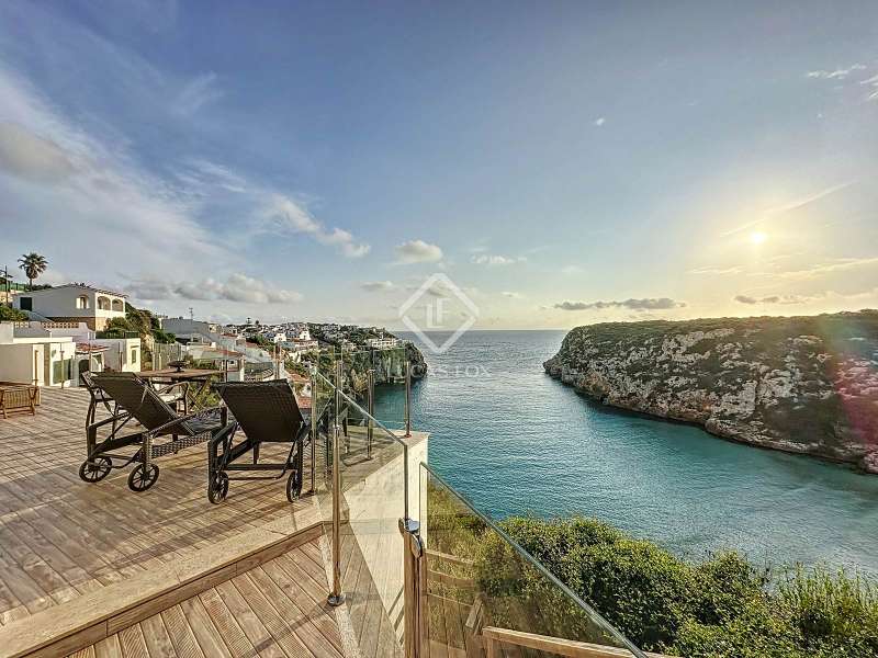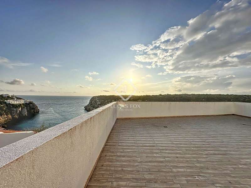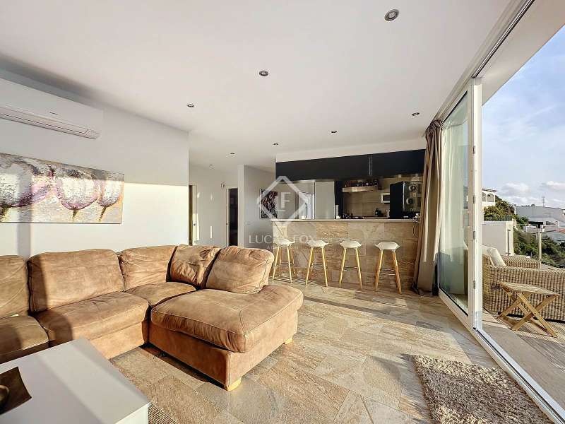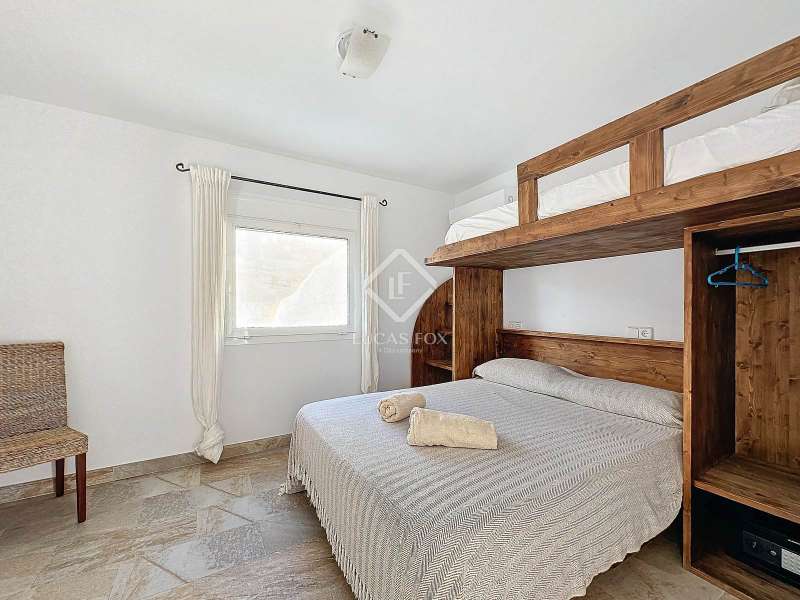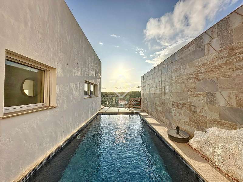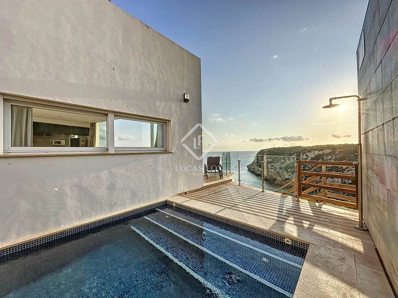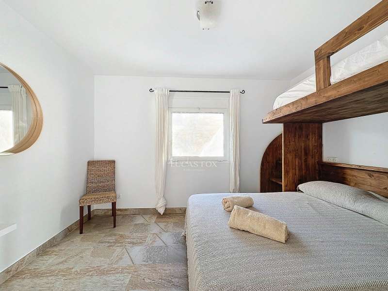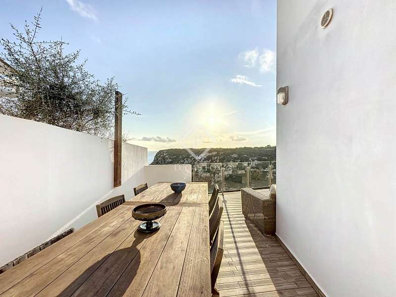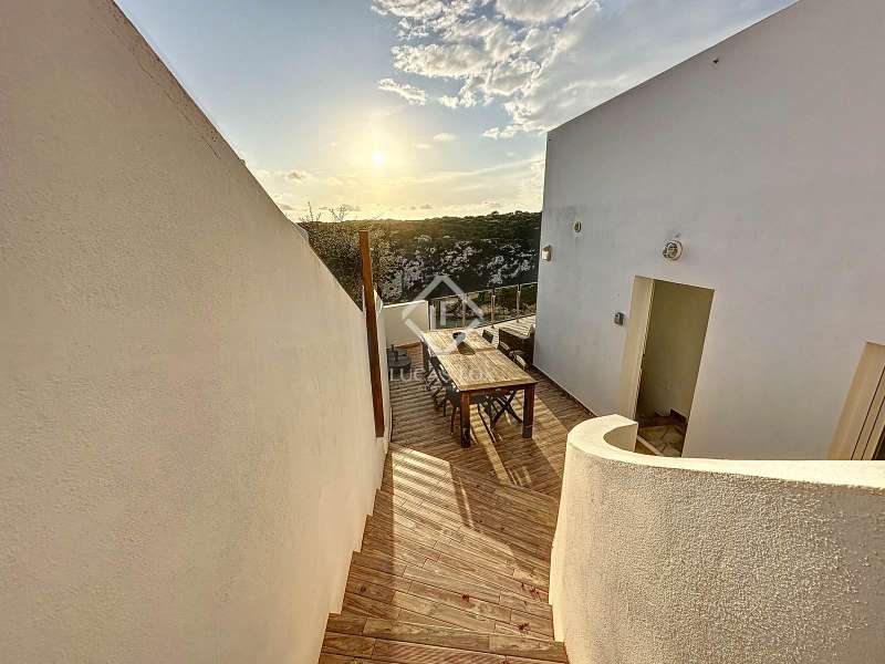 Lucas Fox presents this impressive 69 m² villa , with a modern design, located on a 313 m² plot in Cala'n Porter, within the municipality of Alaior. The property, built on the ravine, is located at a height that offers spectacular views. The property, built in 2015 and recently renovated, is in impeccable condition and ready to move into. It is distributed over three floor. Going down from the street, we access a main terrace located on a lower level. From here, the 180º panoramic views towards the beach and the Cala'n Porter ravine are simply stunning. Upon entering the house, we find a spacious and bright living-dining room integrated with the fully equipped American-style kitchen. On this same level, there are two cozy bedrooms: both with a double bed and a single bunk bed, which can comfortably accommodate up to six people. In addition, the shared bathroom with a bathtub has been renovated with modern materials, maintaining a high quality standard. Going out onto the terrace, we come to a modern rectangular swimming pool, which also enjoys spectacular views. From here, a curious wooden staircase leads us to a lower floor in the process of renovation, where we find a complete bedroom with a double bed and a single bed and a curious complete bathroom with a shower. In addition, there is another room in the process of renovation that could be converted into a fourth bedroom. On the upper floor , at street level, we have a large solarium that has the same surface area as the lower level, ideal for enjoying the sun and the views. Among the outstanding facilities of the property are cold/hot air conditioning splits, fireplace, ceiling fans and exterior enclosures with double glazing. One of the most distinctive elements of the villa is the transparent glass railing that surrounds the terrace. This detail allows you to enjoy an unobstructed view of the surroundings: the beach, the sea, the natural park and the Cala'n Porter ravine. A unique and elegant property, with exceptional details that make it an ideal place to live all year round or enjoy unforgettable stays with family and/or friends. Please contact us for more information or to arrange a visit.