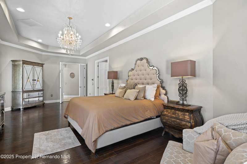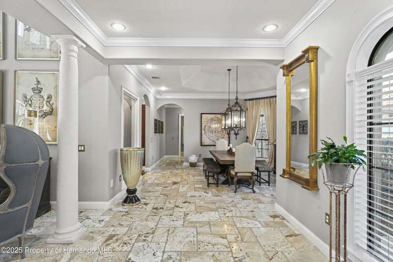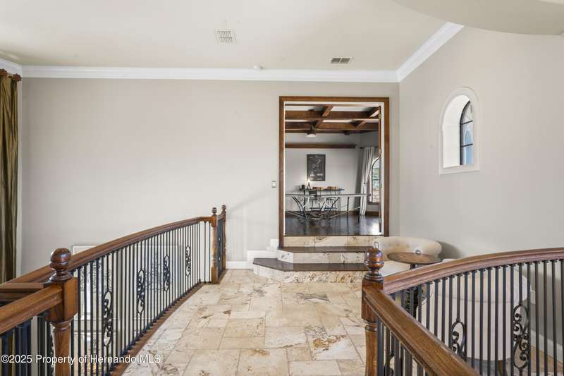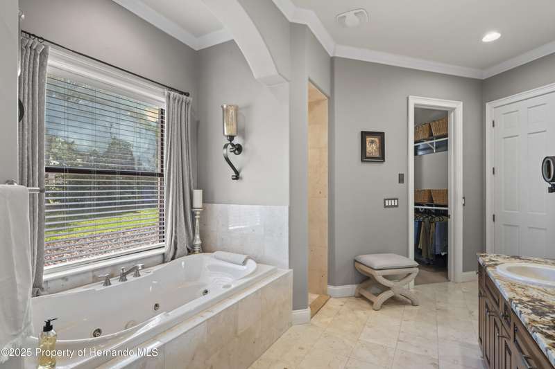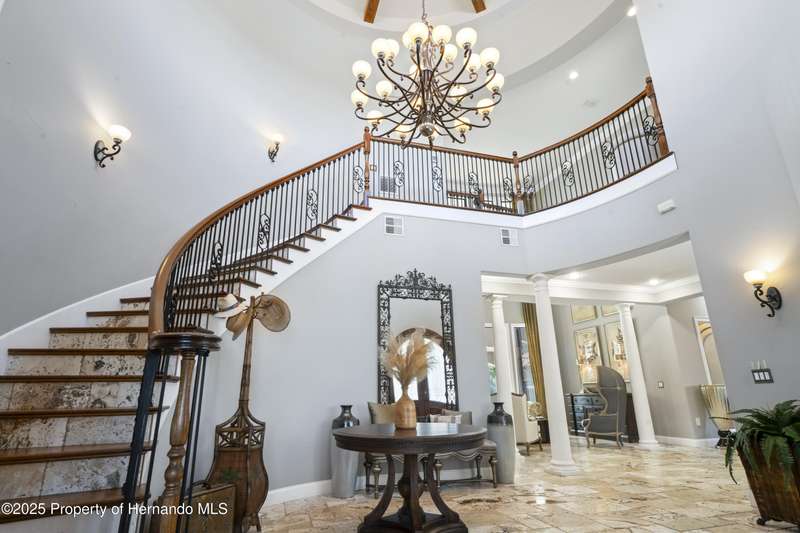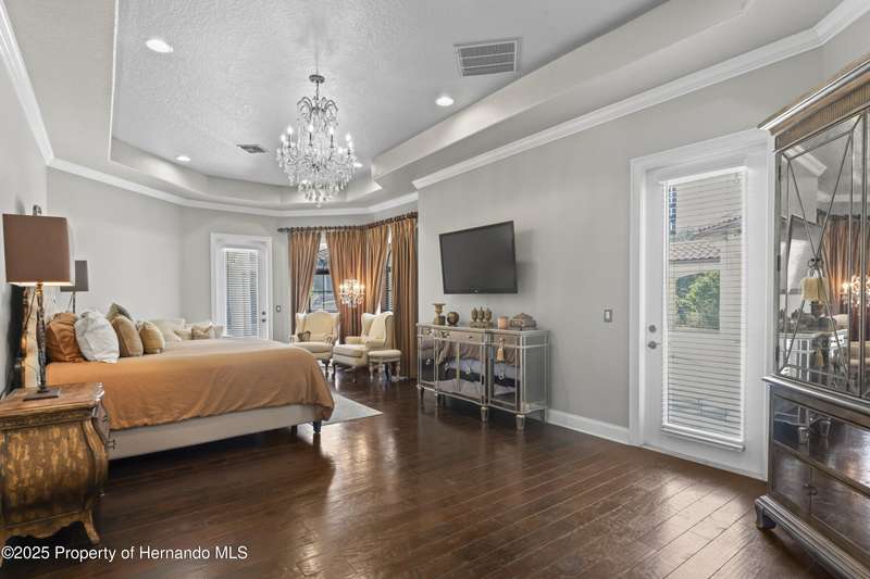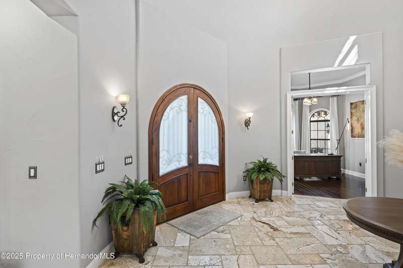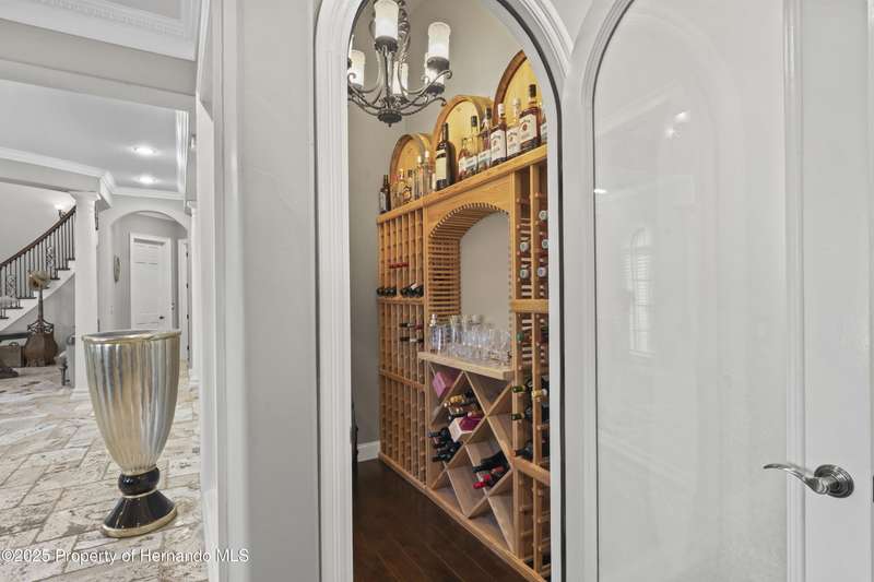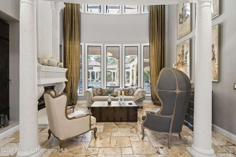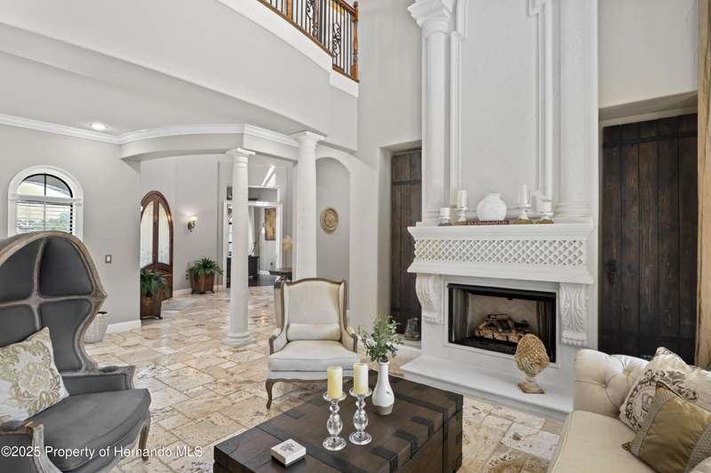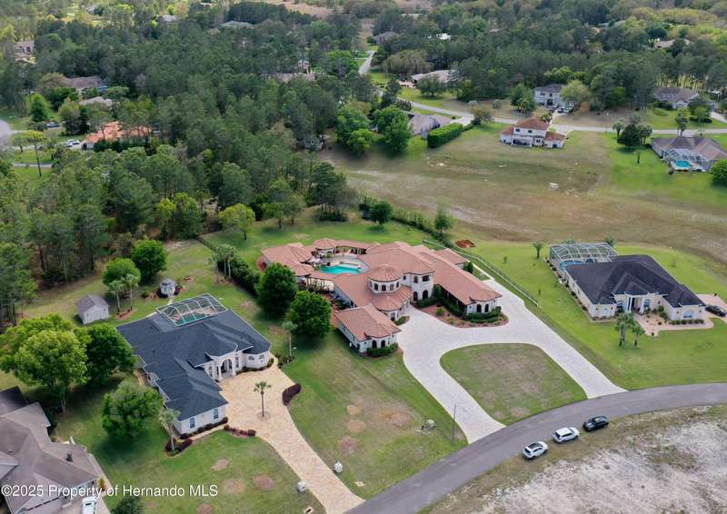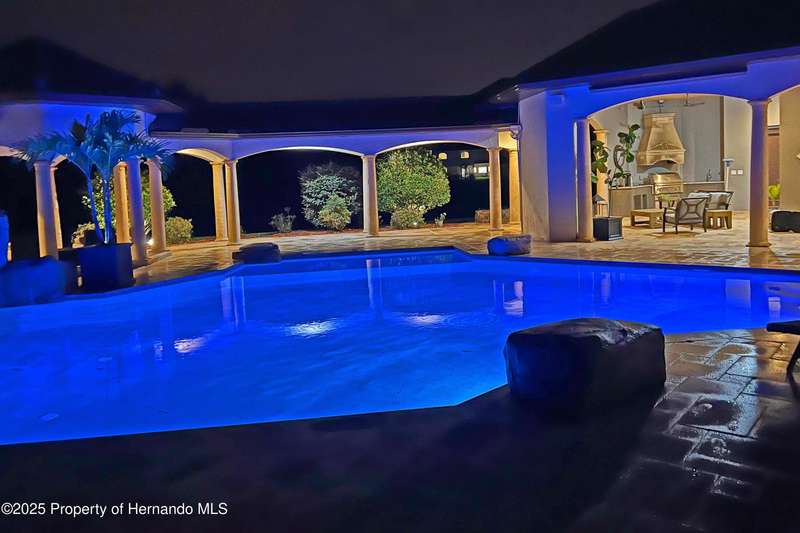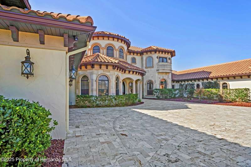 This Mediterranean inspired, resort-themed home sits on a quiet street in Woodland Waters, an exclusive subdivision of estate sized parcels. With over one acre of manicured grounds this property is the ultimate residence if you are looking for perfection and privacy. The architect, builder and designer created a residence that blends natural light, soaring ceilings with exquisite architectural details in a manner that is grand in stature but at the same time, warm and inviting. The residence encompasses 6266 sf. of heated/AC space with 4000+ of outdoor entertainment space. The interior is bespoke with an array of cabinetry, top-grade sourced granite, imported marbles and tile, fine hardwoods and plastering. The Property includes a pool house/guest house with high ceilings, a full bath and kitchenette. Architectural details in the main residence feature soaring ceilings, hand scraped wood floors, a chef's kitchen with 6 burner gas stove and a 72'' refrigerator/freezer, walk in wine room, attached pantry and exquisite lighting. In the living room, both the windows and fireplace rise from the floor to the ceiling and are overlooked by a sitting room from the second story. There are four en suite bedrooms on the main floor, three connected with a gathering/office/work study area. Dine in either the striking dining room, the breakfast alcove or seated bar area. Numerous doors lead to the outdoor pavilion/pool area including from the family room, two from the primary bedroom and one from an additional bedroom bath. The upstairs sitting area leads to a Media/Rec room (or other creative use) with high beamed ceilings and a full bath, Juliet balcony, with covered outside patio area and spiral staircase. The backyard pavilion includes a resort-like heated pool with nighttime lighting, several fountains and waterfalls. Adjacent and under roof is an outdoor kitchen, dining space and fireplace with TV. The connecting guest suite encompasses 700+ sf and has a kitchenette, full bath and Clive Christian cabinetry. The suite can be used for entertaining as well as sleeping. Each of two oversized garages can hold 3 cars on PVC commercial grade flooring (6+ vehicles total) with one garage having a rear entrance. The backyard of the property is totally fenced and landscaped for privacy. A 12 zone irrigation system utilizes well water covering lawn/gardens. Special in wall insulation,4 zone HVAC, central vacuum, landscape lighting and many recent utility and appliance upgrades. Home also features UV water filters and double tankless water heaters. Sitting high on a rolling hill and safely inland (low insurance and no flood requirement) this home is less than 10 mi. to Weeki Wachee Spring State Park, Pine Island and Hernando Beach. Tampa International Airport is only 51 minutes away and every shopping convenience is nearby. If you enjoy living in quiet privacy, security and beautiful surroundings this home is for you. The residence defines perfection. Walk around the low-maintenance yard and lava rock gardens, then take a nap in the hammock... before swimming in the large heated pool in total privacy with no neighbors' residences in sight...then change (or put on clothes) in the guest/pool house (using the second washer/dryer for towels) before returning to the main residence to relax in what may be the most Exquisite Living Experience in all of Hernando County. Showings with 12-24 hour notice to qualified buyers only. Call to schedule.