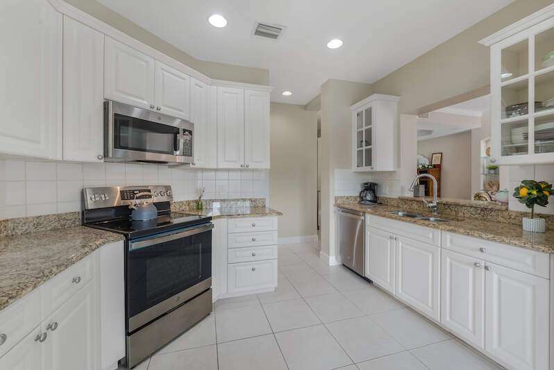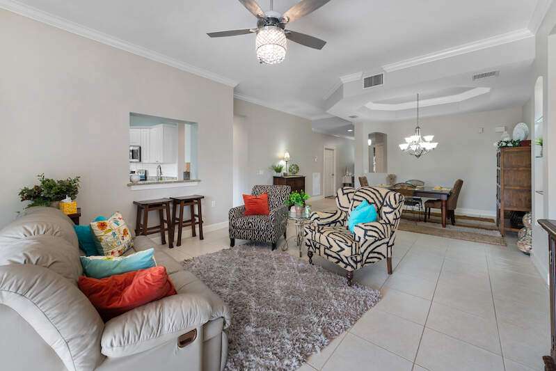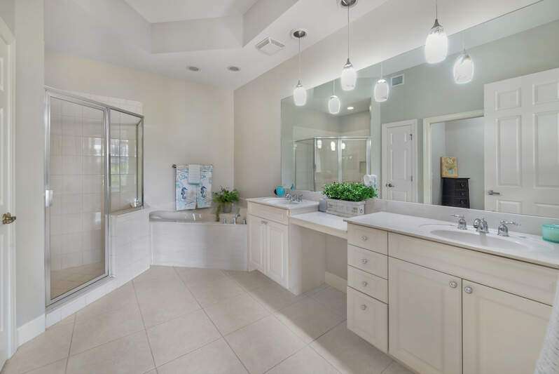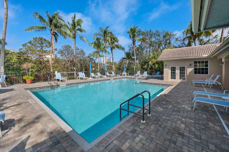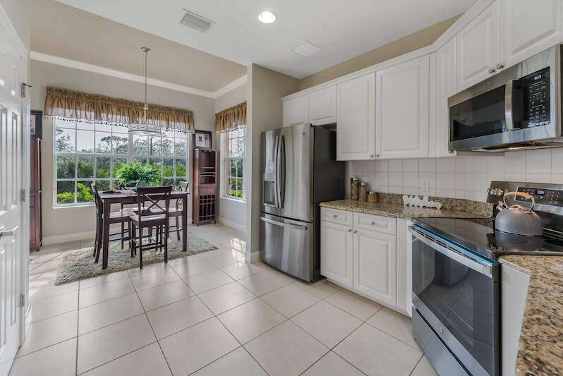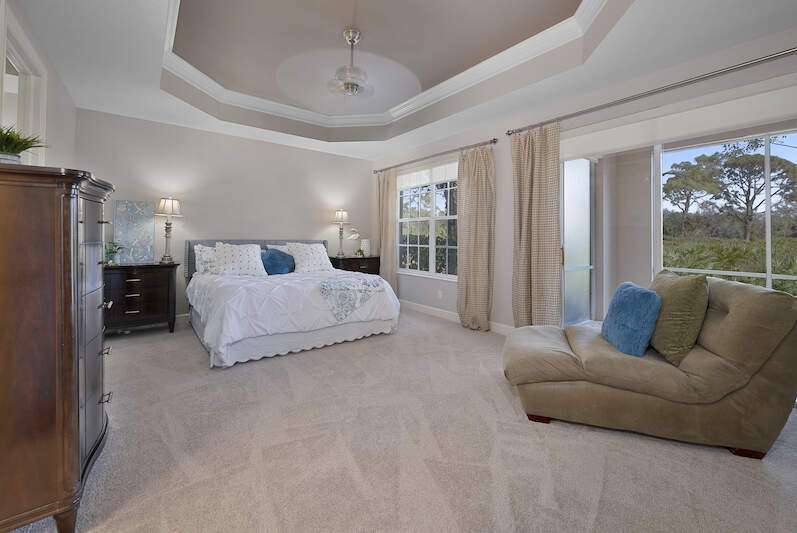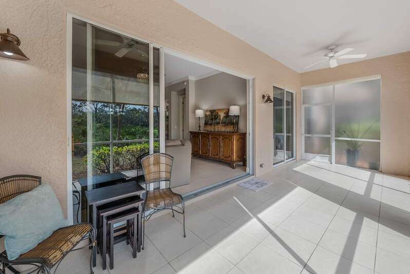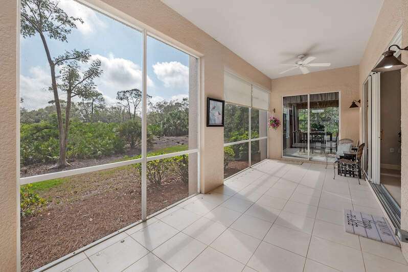 ALSO AVAILABLE FOR SEASONAL RENTAL See MLS#225064664 - Golf (6th hole tee box view) & Preserve views await you from this ground floor end unit with nothing but trees beyond your windows; including your side windows, no neighbor. Great location across from the swimming pool and mailboxes. Triple Sliders from Great Room lead to extended Lanai with tiled floor & peaceful views of the tee box at 6th hole. Improvements include: Freshly painted interior, new carpeting in all bedrooms, new interior door hardware & some new lighting. New high profile toilets. HVAC system, Hot Water Heater, Refrigerator, stove, microwave & dishwasher all new in 2022. Master Suite with huge walk in closet. Master Bath with dual vanities, walk in shower & Corner soaking tub. Guest Bed with en-suite Bathroom. Large closet in entryway for additional storage plus convenient powder room for visitors. Laundry room with sink & hanging space. Cabinets & Overhead Storage Racks in Garage. Other features include coffer ceilings & Crown molding. Enjoy The Colony's unique resort lifestyle with abundant amenities including your private membership to The Bay Club, or take the shuttle to the private beach park. 2 Canoe/Kayak parks, Butterfly Garden, Bocce Ball, Sailing club, Community & Fitness Centers, Pickleball Courts and one of the area's biggest Tennis programs. Convenient to shopping, entertainment, dining, airport & beaches.