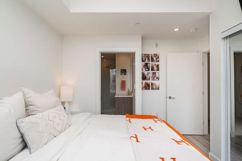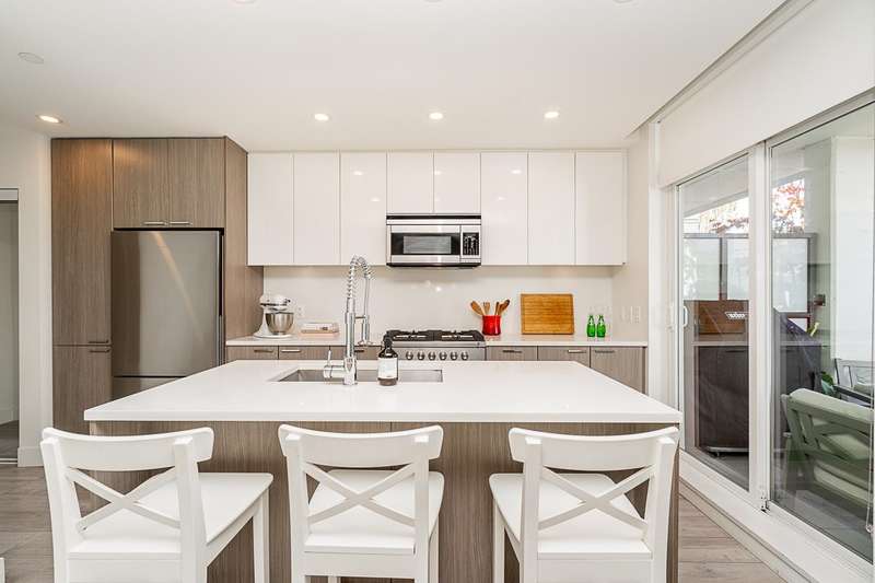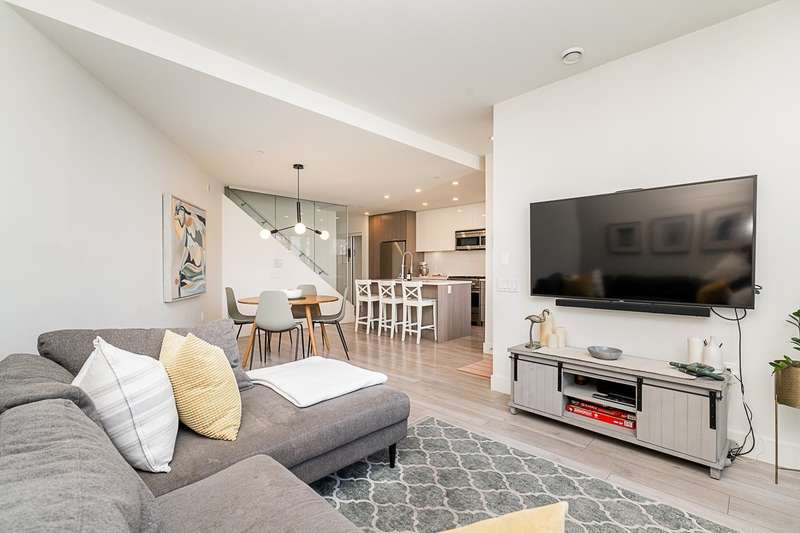 This gorgeous townhome offers a private walk-up entry, 2-beds + den, 3-baths, & 1,102 sqft of sophisticated interior space. Main level boasts a thoughtfully designed open-concept layout w/ wide-plank flooring throughout; powder rm; kitchen w/ luxury appliances, including gas range, excellent cabinet & counter space, island w/ breakfast bar, & sliding door access to the private covered front patio that offers year-round space for al-fresco entertaining. Floor-to-ceiling windows in the living rm offer W-exposure & welcome in abundant natural light. Upper level features primary bed w/ ensuite; secondary bed & bath; den/potential 3rd bed; &, conveniently located laundry. Includes U/G parking, storage locker, & balance of new home warranty.