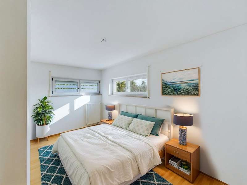 This charming detached house on Birkenberg in Landshut offers a unique combination of modern architecture, a quiet location and impressive views. On a generous plot of 713 m², the house extends over 3 floors with a living area of approx. 170 m² and an additional usable area of 60 m². Built in 2006 and equipped to a high standard, the house impresses with its clear lines and classic flat roof, which harmonizes perfectly with the modern design. The hillside location creates a special room layout, with the main entrance on the first floor (EG) and the garden accessible via the basement (UG). This design not only provides bright, light-flooded rooms, but also a breathtaking panoramic view from the living area and the upper floors. The sunrises and sunsets are particularly impressive, giving the house an incomparable atmosphere. The house has 6 rooms, including 5 bedrooms and 2 modern tiled bathrooms, which create a harmonious overall picture. High-quality parquet flooring in the living and sleeping areas and generous window fronts ensure a bright, warm living ambience. The fireplace in the living room creates a cozy, feel-good atmosphere. Another highlight is the garden, which was redesigned in 2019, is easy to maintain and beautifully ingrown. The garden with terrace offers plenty of privacy and invites you to spend relaxing hours outdoors. The house also has a practical garage and 4 parking spaces, providing ample parking space. The quiet and green location on Birkenberg combines rural flair with proximity to the city. Shopping facilities, schools and excellent transport links make this residential area particularly attractive. The center of Landshut and the A92 freeway with a direct connection to Munich can be reached in just a few minutes. This hidden gem on Birkenberg combines modern functionality, a harmonious living ambience and a fantastic location - perfect for anyone looking for a high quality of life and stylish living. Arrange a viewing appointment now and let this exceptional property convince you!