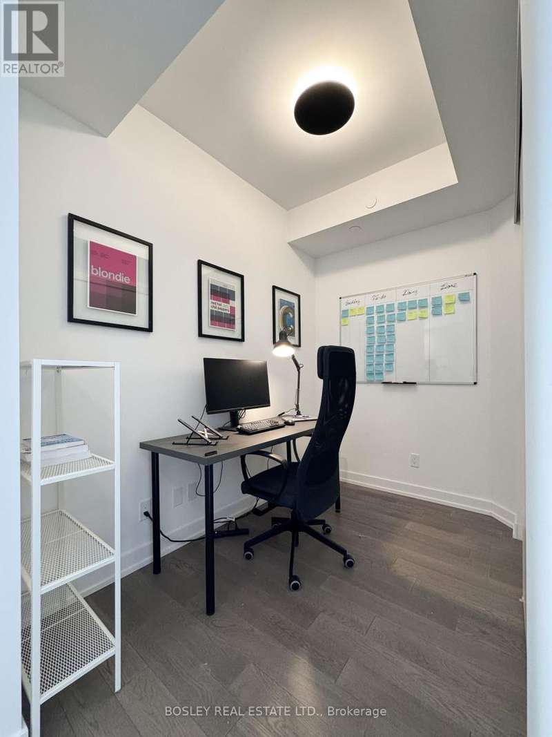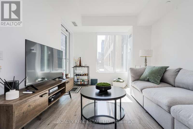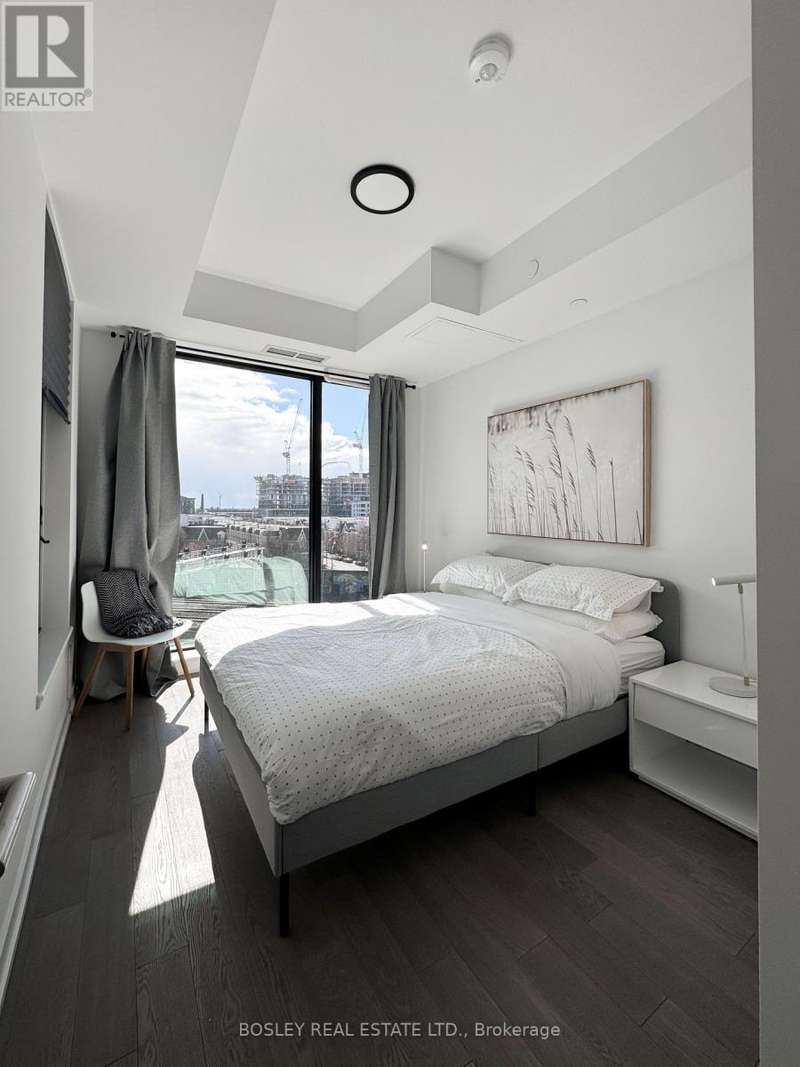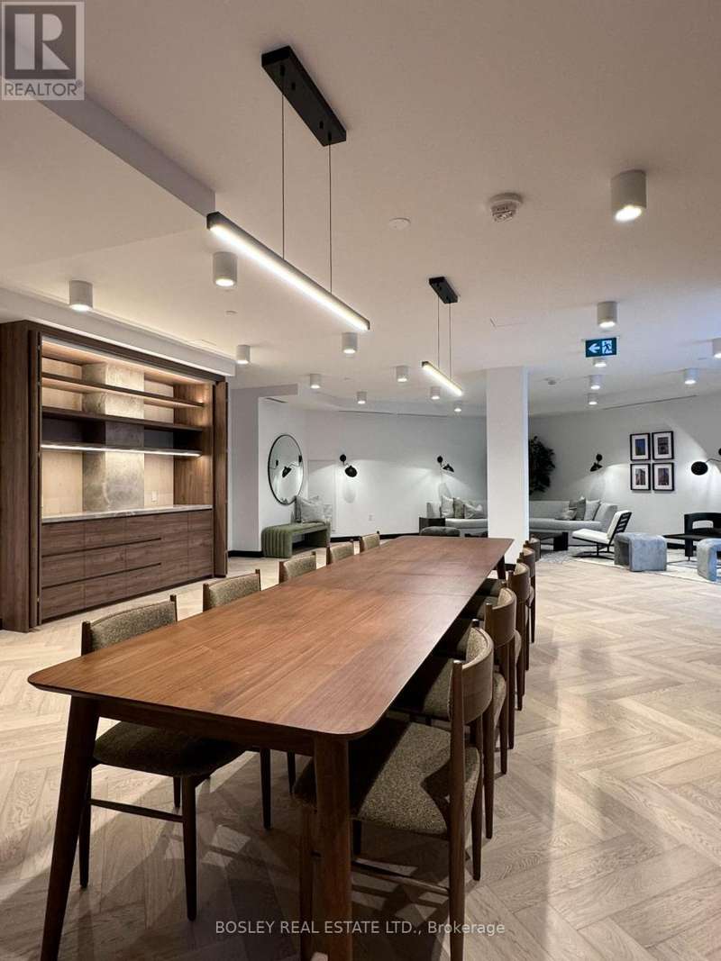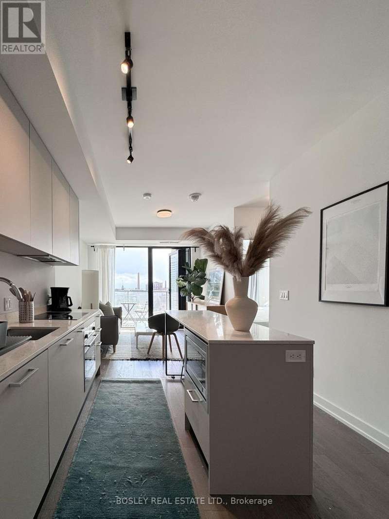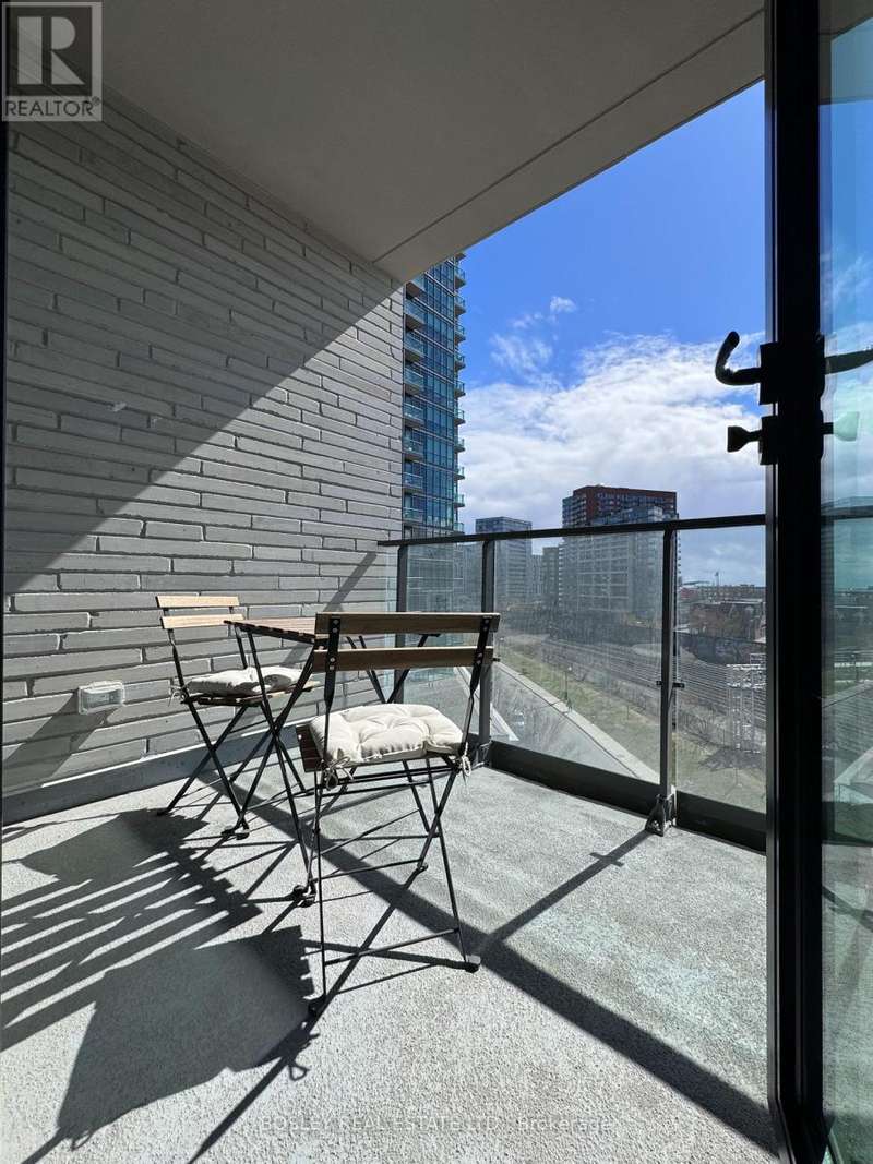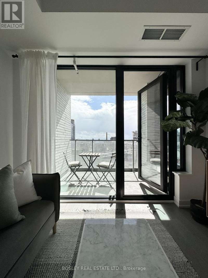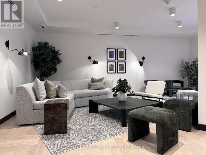 Offered for sale for the first time since the building's inception, this well-balanced and efficiently planned 624 sq ft suite is a rarefied find (just like you). Suite 602's mindfully-chosen interior design and finishes offers simplicity, functionality, and nuanced indulgence. Warm grey-oak engineered hardwood floors run throughout, grounding the open living/dining space; a setting that works as easily for solitary evenings as for small, familiar gatherings. A brick alcoved balcony extends the living space outdoors - a quiet nook perfect for summer reading, slow mornings, and moments of pause. The expansive black-framed windows draw in daylight + perfectly frames the suite's unobstructed & cinematic view of the open horizon from dawn to dusk. The Scavolini-designed kitchen is all buttery matte finishes and crisp white quartz + integrated appliances and a versatile island. The bedroom is bright and unhurried, wrapped in large windows, with a walk-in closet that quietly absorbs the evidence of daily life. A modern bathroom offers a tiled alcove tub + a sleek skirted toilet - details that are clean and simple, just like your daily cleansing rituals. The separate den is flexible: it can hold a generous desk for deep work, or a twin bed for the occasional guest (who never quite leaves on time). Amenities include a gym with thoughtfully designed equipment; a lounge setting - styled with organic-modern pieces - that invites conversation or quiet, depending on the hour; and an expansive chef's kitchen + dining setting that is perfect for larger gatherings and fêtes. The suite's calm atmosphere is quietly removed - yet is mere steps away - from the hum of West Queen West's galleries, coffee bars, buzzy eateries + late-night spots. For those longing for a home that embodies simplicity and warmth - and where the city naturally falls into the backdrop - suite 602 awaits. (id:7434)