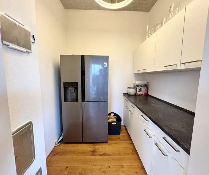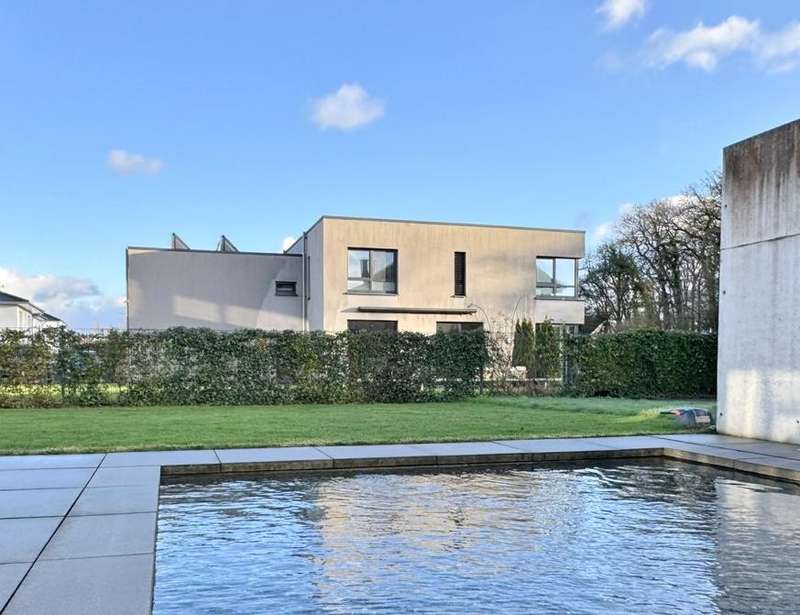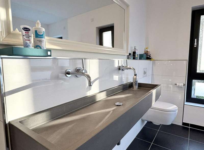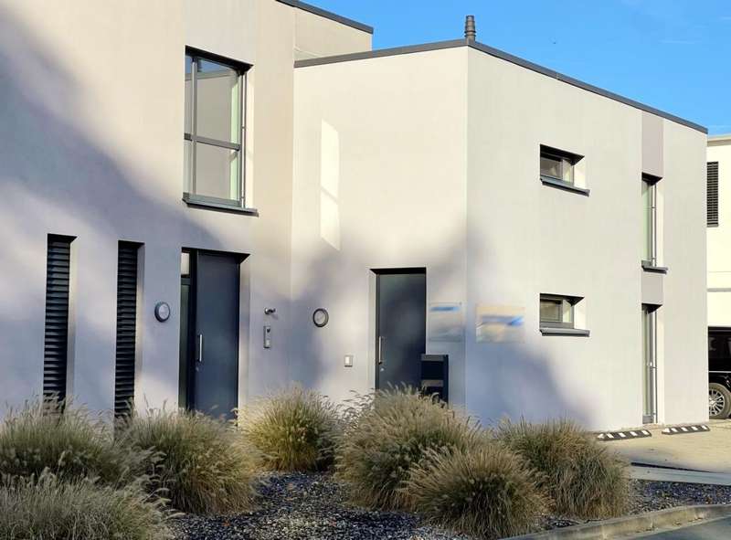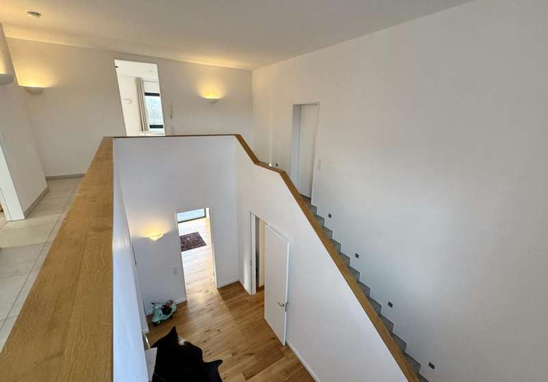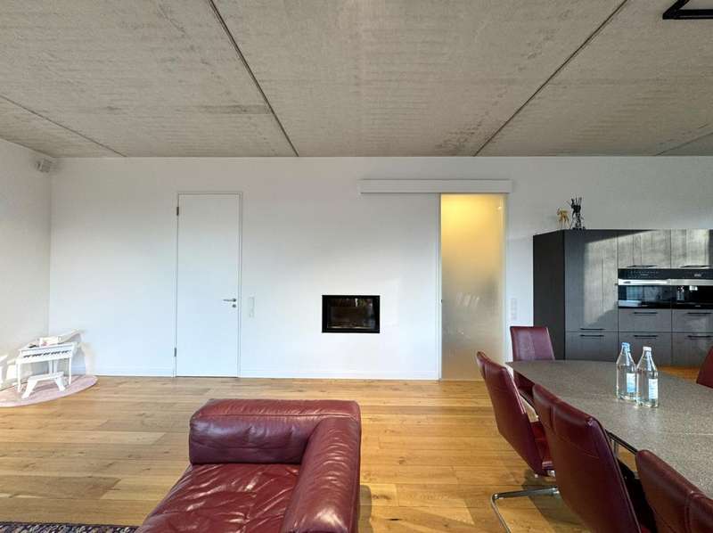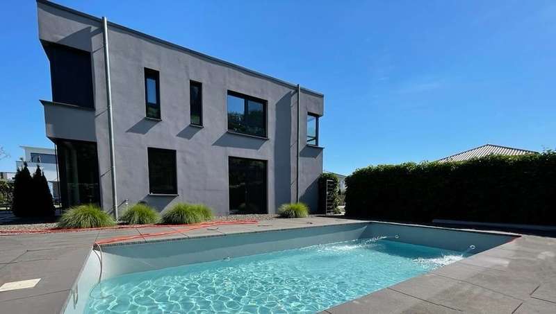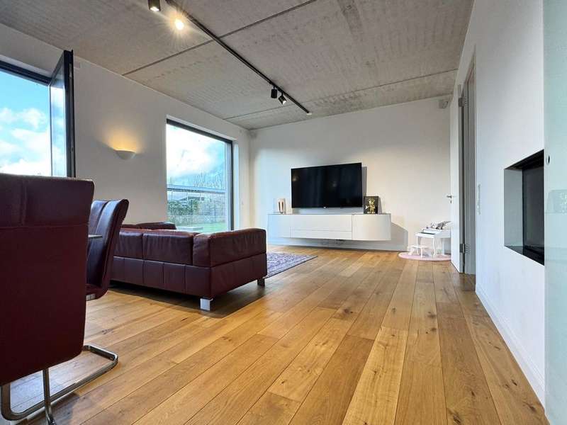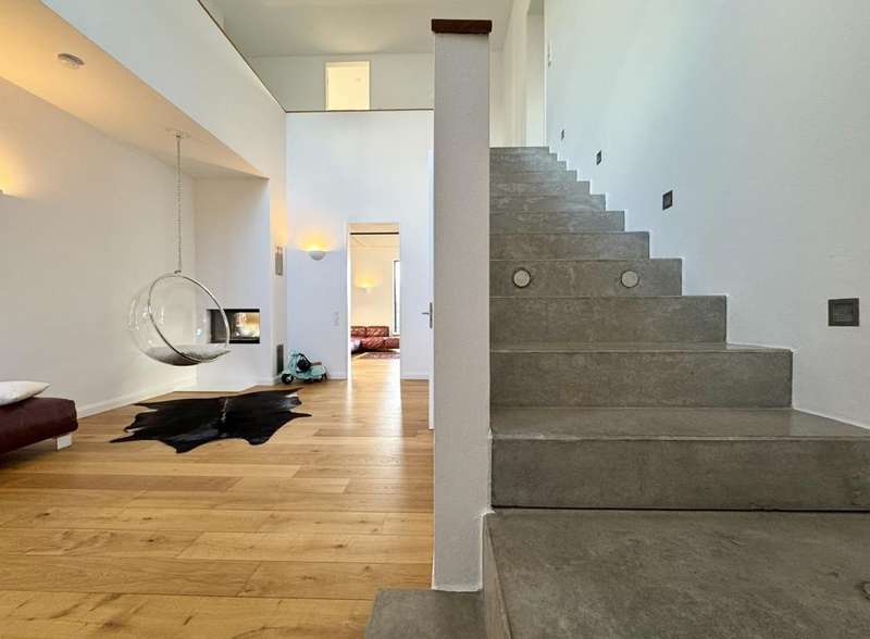 This modern and well thought-out house combines clear, elegant architecture with sustainable energy technology and an impressive room layout. Designed by a renowned artist known for his precise design language, this cube-shaped building impresses with high-quality materials, light-flooded rooms and a sophisticated combination of functionality and design. With a photovoltaic system, solar-assisted heating technology and energy-efficient construction, the property sets standards in terms of sustainability and contemporary living. + Ceiling heights that impress: The generous ceiling height creates an open, light-flooded ambience that impresses as soon as you enter the house. + Full-length windows: In the living room, dining and kitchen areas, floor-to-ceiling windows open up the house to the outside world and ensure a seamless connection between indoor and outdoor spaces. + Mix of materials at the highest level: The contrast between the exposed concrete ceiling, high-quality oak floors and modern design elements gives the house an extraordinary aesthetic. Particular attention was paid to the cladding of the concrete ceiling, the perfect appearance of which was achieved through extremely professional workmanship. + Concrete staircase as an architectural highlight: The staircase was cast in exposed concrete and reflects the same aesthetics and precision as the concrete ceiling. Its simple elegance blends harmoniously into the overall design. + Gallery with air space: The staircase leads to a gallery on the upper floor, from which you can look down into the impressive air space. The currently installed, high-quality kitchen is not included in the scope of sale. However, a takeover can be discussed if required. This offers the flexibility to either use an already perfectly integrated solution or to realize your own vision of a dream kitchen. Two converted overseas containers with power connections and parquet flooring have been placed in the garden area, which are used as practical storage space for pool equipment, garden furniture, lawnmowers, barbecues or accessories. These containers blend harmoniously into the modern overall concept of the house thanks to their deliberately untreated, rough appearance and offer an interesting contrast to the clear architecture of the building. Container solutions are currently in vogue and underline the well thought-out and contemporary design of this house. In addition to the residential unit, the property offers a spacious commercial space that is perfectly separated from the living area by a separate entrance. This division not only offers tax advantages, but also maximum flexibility of use: - Space for a studio, studio or office: the high ceilings allow a second level to be converted to create additional space. - Parking directly at the property: Ideal for customers or employees. - Business-friendly environment: Many neighbors combine living and working in this area, creating a pleasant, business-friendly climate. In this project, the artist has translated his flair for aesthetics, structure and modern functionality into the architecture. His clear design language and attention to detail characterize the style of the building. The result is a well thought-out and elegant home that is both visually and functionally impressive. This house combines spectacular design, energy efficiency and exceptional details. The impressive ceiling heights, the aesthetic concrete staircase with gallery, the photovoltaic system and the creative integration of the overseas containers make the property an ideal home for people who are looking for something special. Experience a home that perfectly combines elegance, sustainability and modern living.