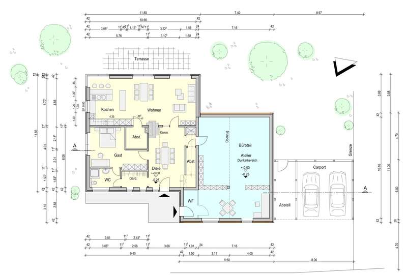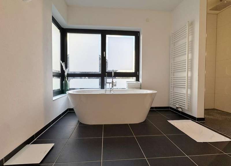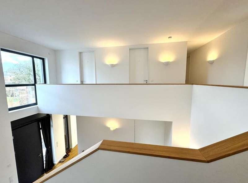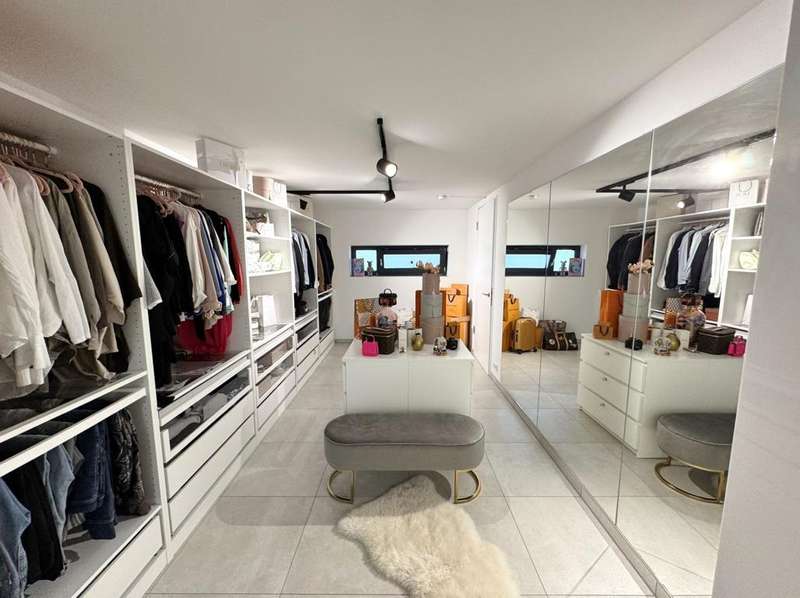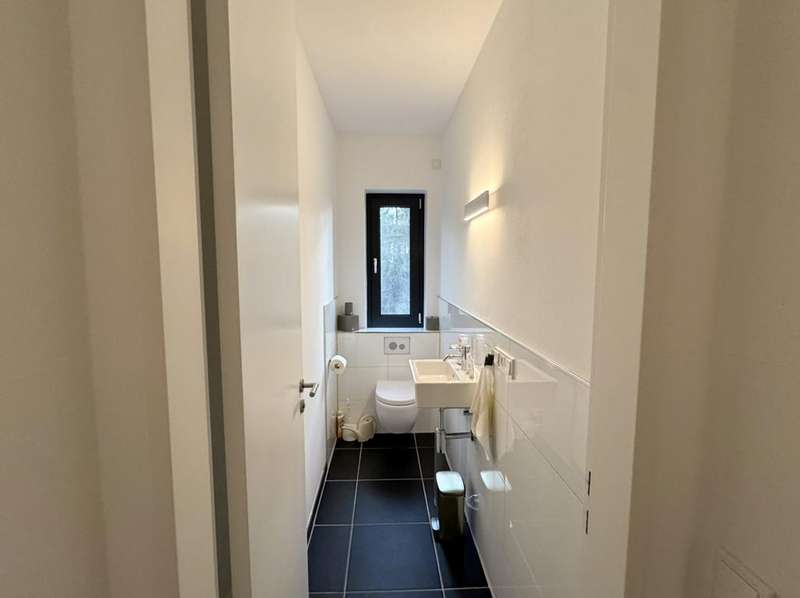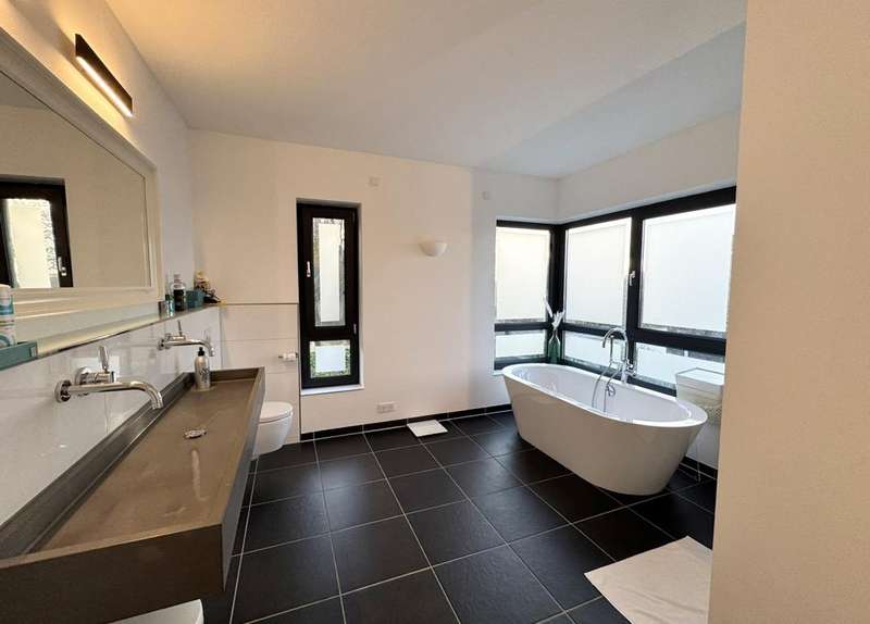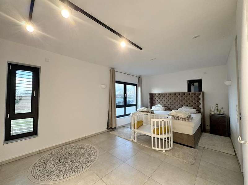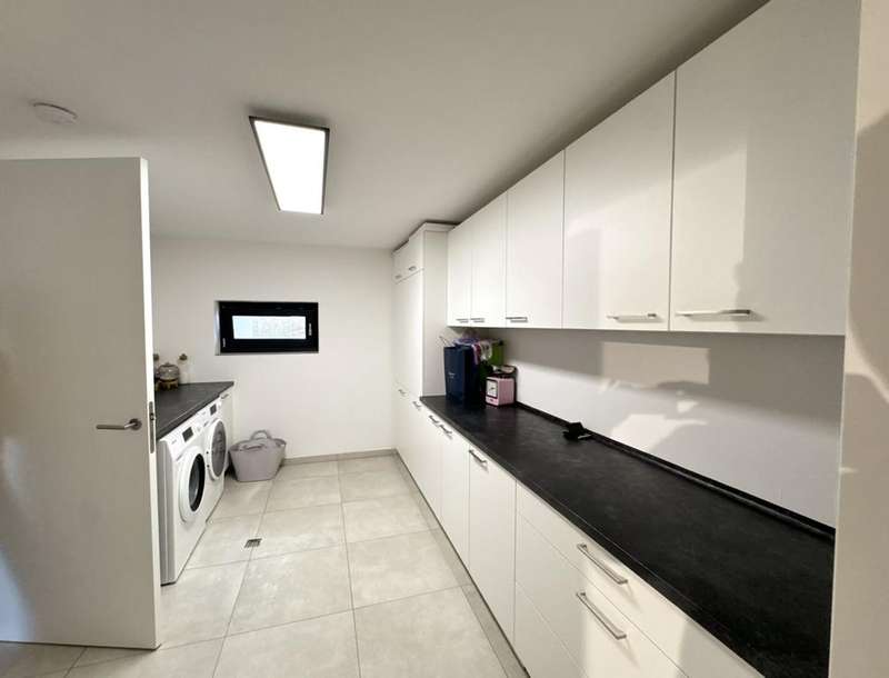 This modern and well thought-out house combines clear, elegant architecture with sustainable energy technology and an impressive room layout. Designed by a renowned artist known for his precise design language, this cube-shaped building impresses with high-quality materials, light-flooded rooms and a sophisticated combination of functionality and design. With a photovoltaic system, solar-assisted heating technology and energy-efficient construction, the property sets standards in terms of sustainability and contemporary living. + Ceiling heights that impress: The generous ceiling height creates an open, light-flooded ambience that impresses as soon as you enter the house. + Full-length windows: In the living room, dining and kitchen areas, floor-to-ceiling windows open up the house to the outside world and ensure a seamless connection between indoor and outdoor spaces. + Mix of materials at the highest level: The contrast between the exposed concrete ceiling, high-quality oak floors and modern design elements gives the house an extraordinary aesthetic. Particular attention was paid to the cladding of the concrete ceiling, the perfect appearance of which was achieved through extremely professional workmanship. + Concrete staircase as an architectural highlight: The staircase was cast in exposed concrete and reflects the same aesthetics and precision as the concrete ceiling. Its simple elegance blends harmoniously into the overall design. + Gallery with air space: The staircase leads to a gallery on the upper floor, from which you can look down into the impressive air space. The currently installed, high-quality kitchen is not included in the scope of sale. However, a takeover can be discussed if required. This offers the flexibility to either use an already perfectly integrated solution or to realize your own vision of a dream kitchen. Two converted overseas containers with power connections and parquet flooring have been placed in the garden area, which are used as practical storage space for pool equipment, garden furniture, lawnmowers, barbecues or accessories. These containers blend harmoniously into the modern overall concept of the house thanks to their deliberately untreated, rough appearance and offer an interesting contrast to the clear architecture of the building. Container solutions are currently in vogue and underline the well thought-out and contemporary design of this house. In addition to the residential unit, the property offers a spacious commercial space that is perfectly separated from the living area by a separate entrance. This division not only offers tax advantages, but also maximum flexibility of use: - Space for a studio, studio or office: the high ceilings allow a second level to be converted to create additional space. - Parking directly at the property: Ideal for customers or employees. - Business-friendly environment: Many neighbors combine living and working in this area, creating a pleasant, business-friendly climate. In this project, the artist has translated his flair for aesthetics, structure and modern functionality into the architecture. His clear design language and attention to detail characterize the style of the building. The result is a well thought-out and elegant home that is both visually and functionally impressive. This house combines spectacular design, energy efficiency and exceptional details. The impressive ceiling heights, the aesthetic concrete staircase with gallery, the photovoltaic system and the creative integration of the overseas containers make the property an ideal home for people who are looking for something special. Experience a home that perfectly combines elegance, sustainability and modern living.