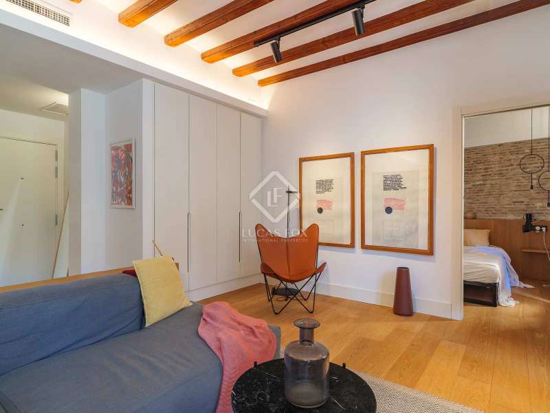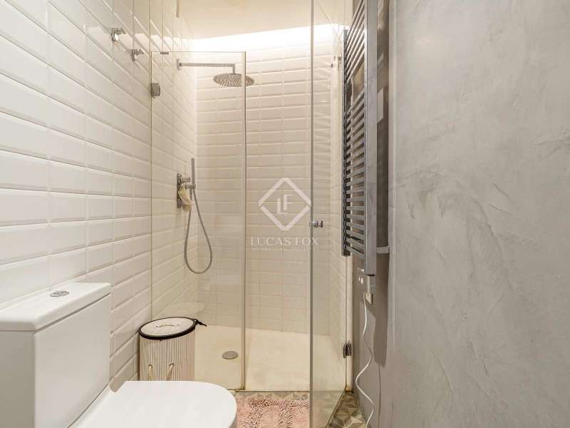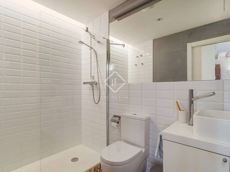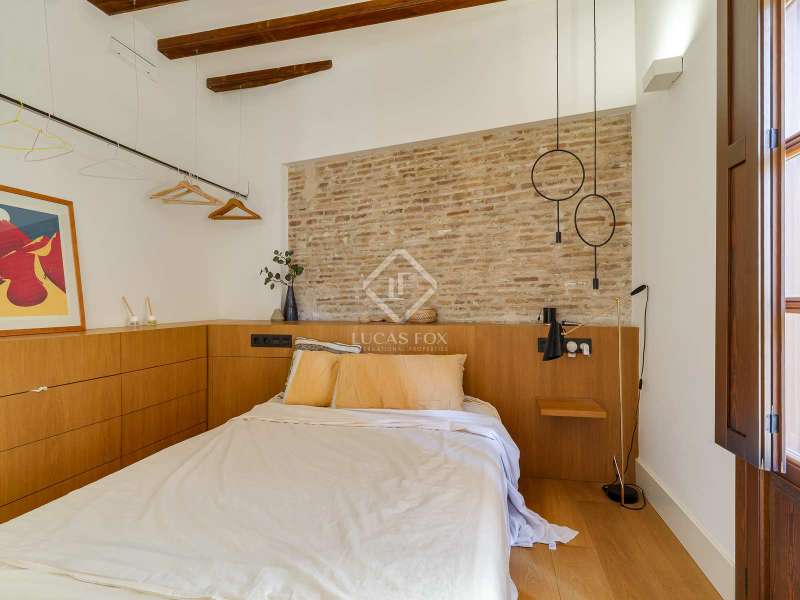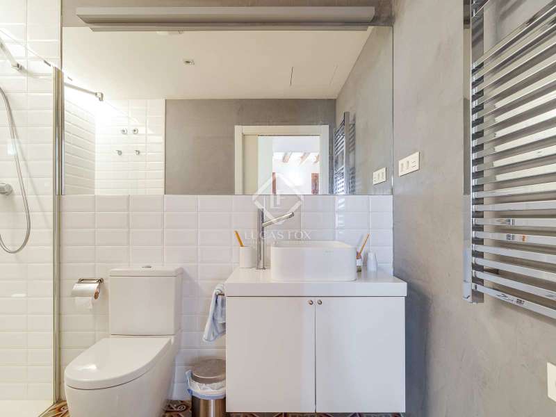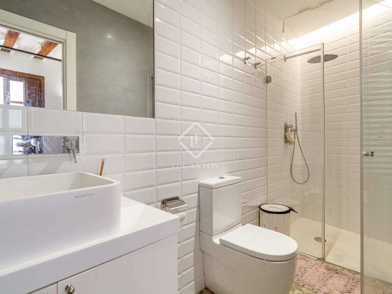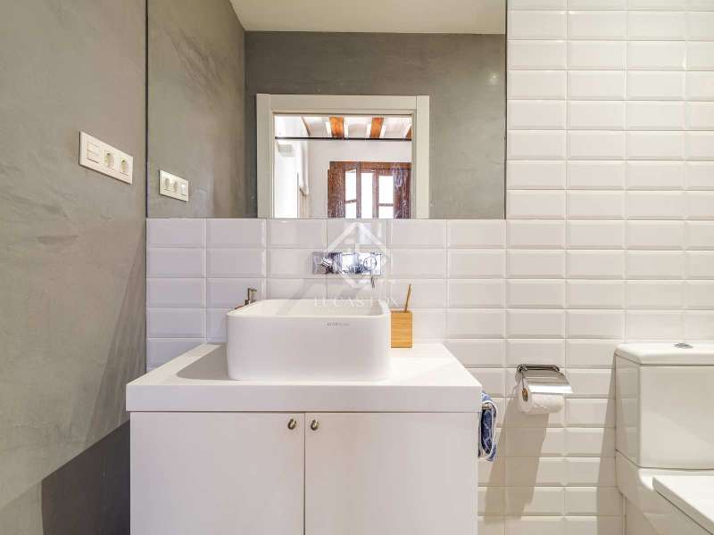 Beautiful apartment completely renovated with a current, modern and cozy style. The kitchen opens to a spacious living room with lots of light, where we see three windows with access to a pleasant 9 m 2 terrace. In addition, the apartment has a full bathroom and two bedrooms, one of them (the main one) exterior and with an en-suite bathroom . Thanks to the layout of the property, the space is used to the maximum. As for the qualities, we find wooden beams in the living room, huge renovated wooden windows, parts of mosaic floor tiles that give a cozy style with personality, air conditioning for greater comfort and ducted heating. The apartment is located in a magnificent renovated building with a lift . This property is ideal as a second residence in the city or also as an investment.