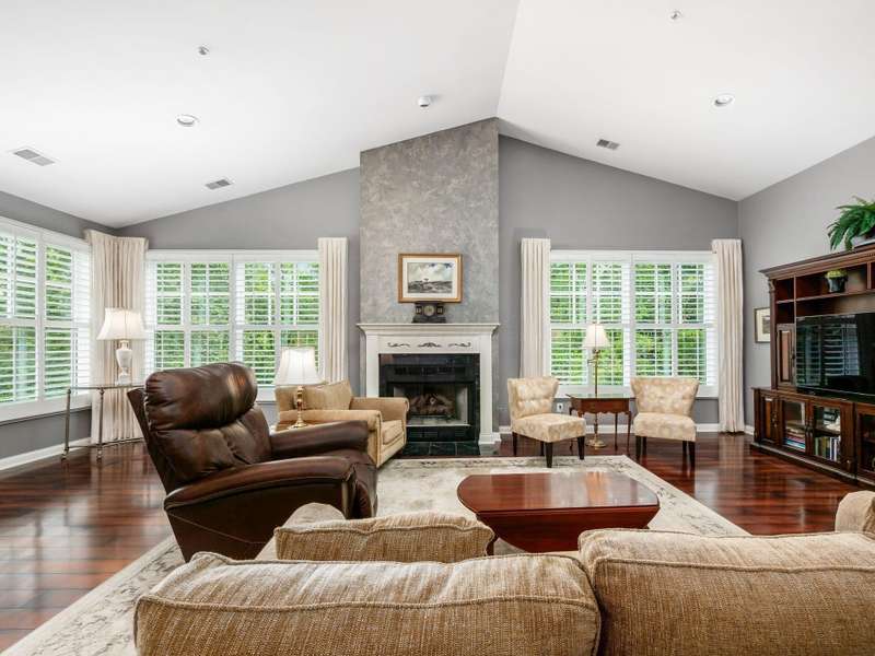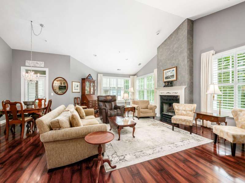 Nestled along the tranquil banks of the Olentangy River, this beautifully appointed Mount Air condo offers the perfect blend of nature, comfort, and style. Bathed in natural light and framed by peaceful wooded views, the home welcomes you with gleaming wood floors that flow through the central living area. The expansive great room is a showstopper, featuring an elegant arched ceiling, a walls of windows, and a cozy fireplace that anchors the space with warmth and charm. The open-concept design creates a seamless flow, ideal for both relaxing and entertaining. The stylish and functional kitchen boasts abundant cabinetry for all your storage needs, complemented by charming glass knobs that add a touch of character. A generous counter with seating invites casual dining and conversation. Recent upgrades include a new refrigerator (2025), ensuring modern convenience. Two sizable bedrooms offer excellent storage, while the luxe primary suite is a true retreat. Enjoy a large walk-through wardrobe complete with built-in drawers, a desk nook, and ample closet space. The ensuite bath features double sinks and a luxurious walk-in shower for a spa-like experience. Step out onto the screened balcony to take in the serene wooded views and gentle river breeze-perfect for morning coffee or evening unwinding. This home also includes two garage parking spaces and a dedicated storage locker for added convenience. Enjoy the benefits of a new water heater and HVAC system installed in 2023, along with a newer LG washer and dryer to round out the list of thoughtful upgrades. With its peaceful setting, modern amenities, and single-story ease, this Mount Air condo is a rare gem that offers both tranquility and practicality in one elegant package.