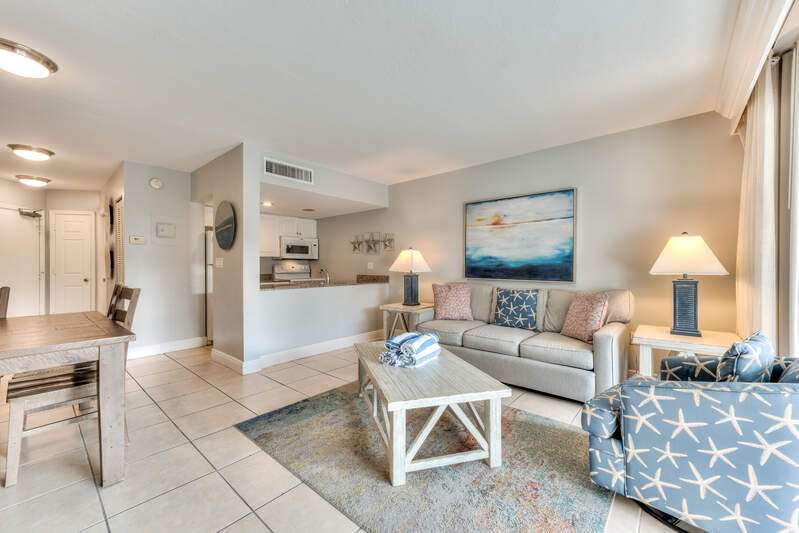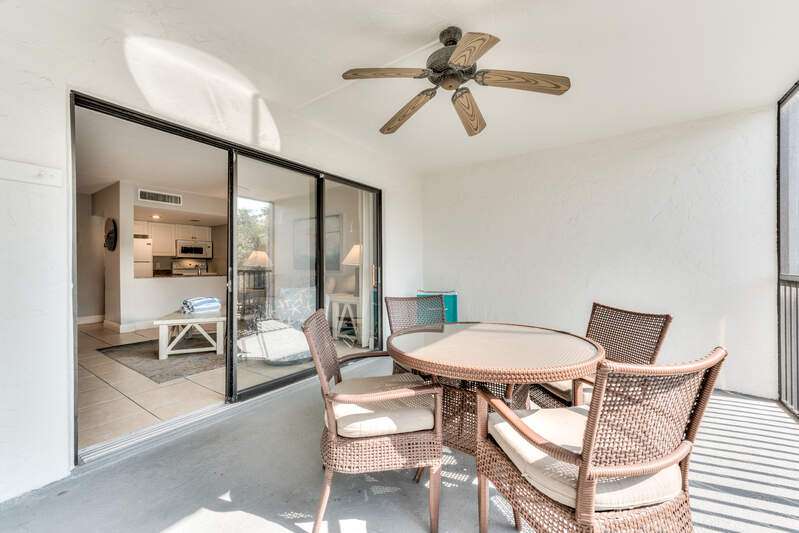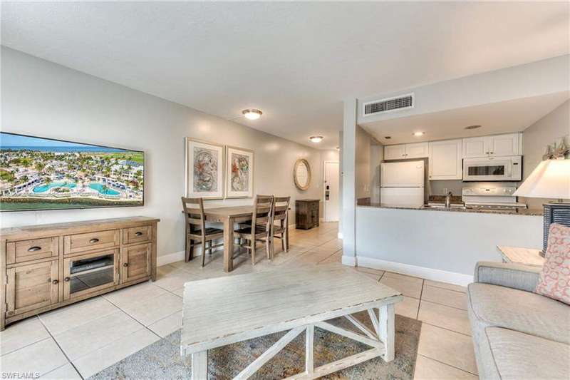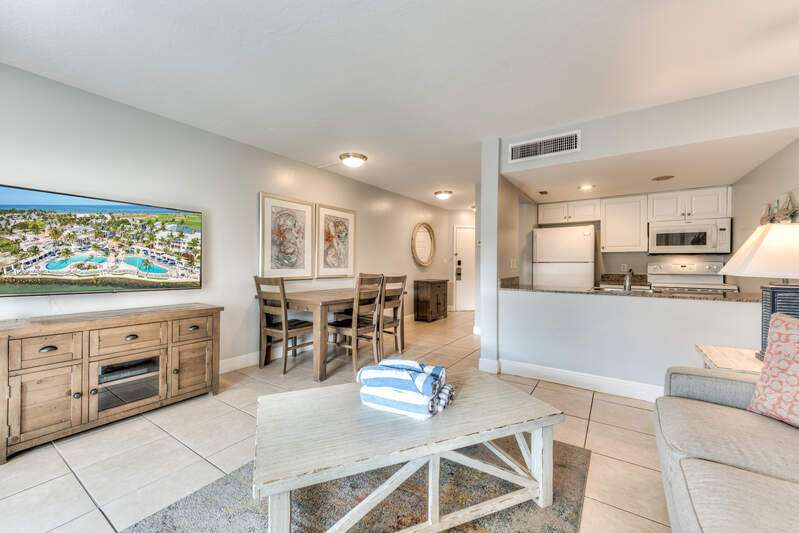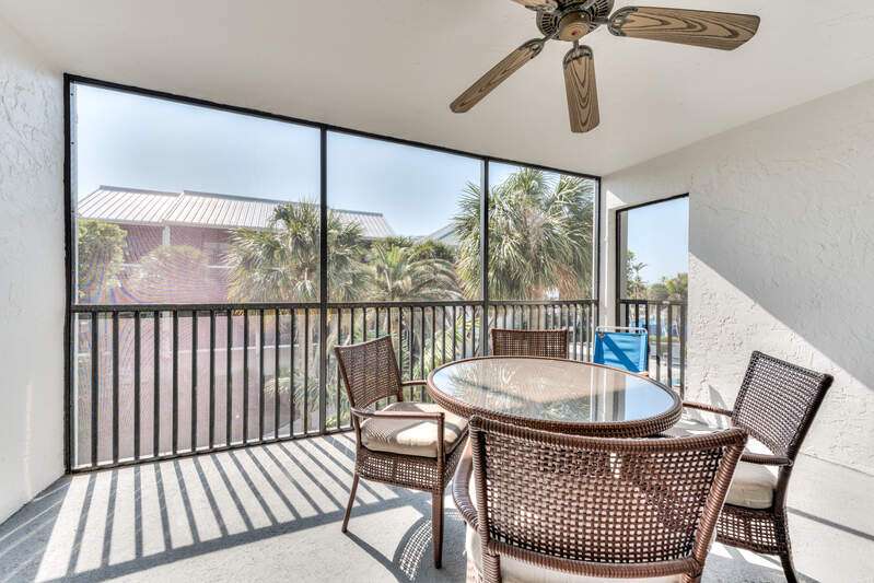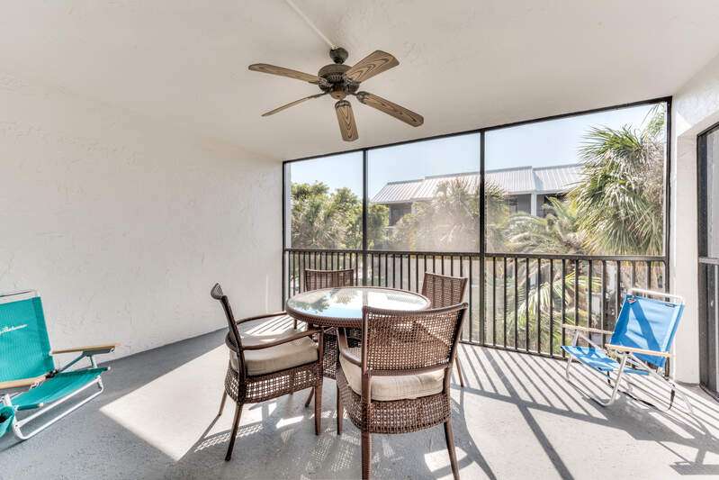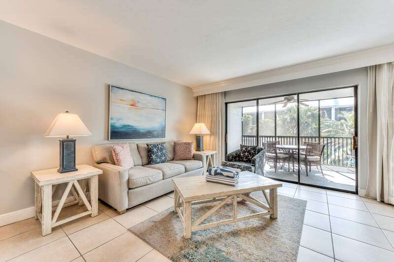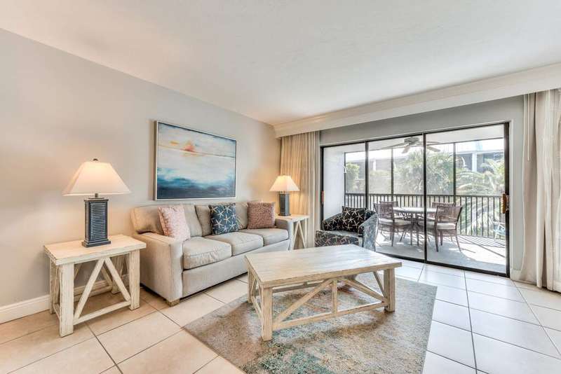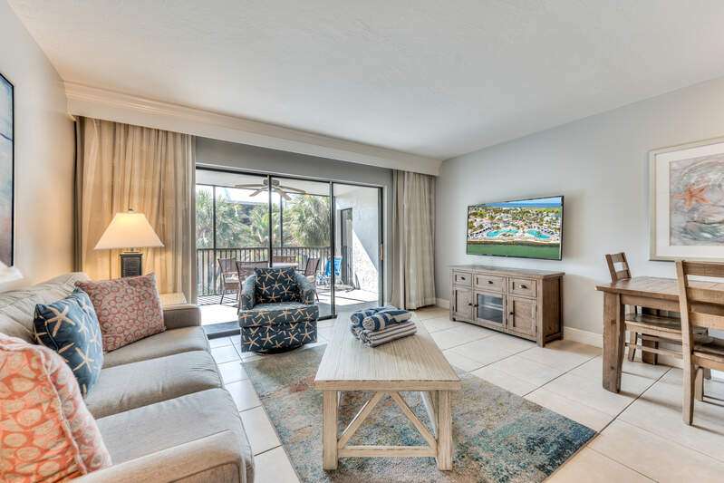 Experience island living in this charming 1-bedroom, 1-bath South Seas Villas condo on Captiva. Located on the second floor and sold fully furnished, it's ready for personal use or rental income. The open layout features coastal-inspired decor, granite countertops, tile flooring, and a comfortable living and dining area that opens to a screened lanai with views of the lush landscaped courtyard-perfect for enjoying the island breeze. The bedroom is a peaceful retreat with soft-toned furnishings, 6-panel interior doors, and much more. This condo is part of an off-site rental program, offering flexible options and solid income potential for investors or seasonal residents. Take a short stroll to Captiva's world-class beach to catch a breathtaking sunset, or start your day under the community pergola with a sunrise painted in blues, oranges, and yellows. Residents enjoy access to a private pool, BBQ area, and more in this welcoming South Seas Villas community.