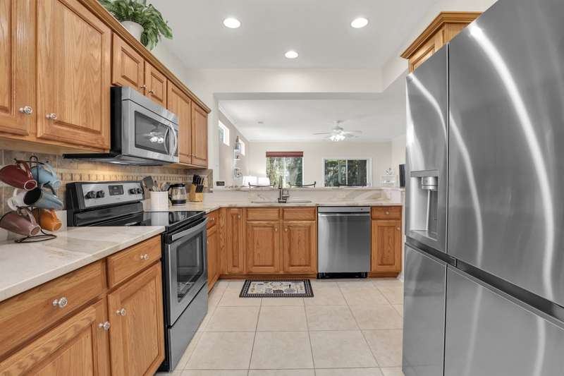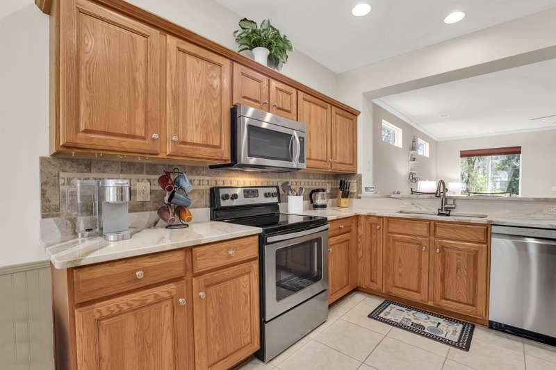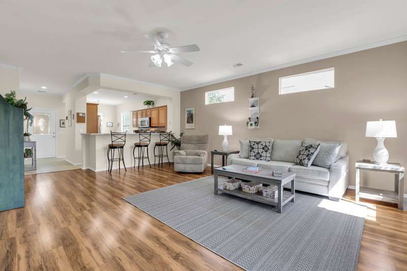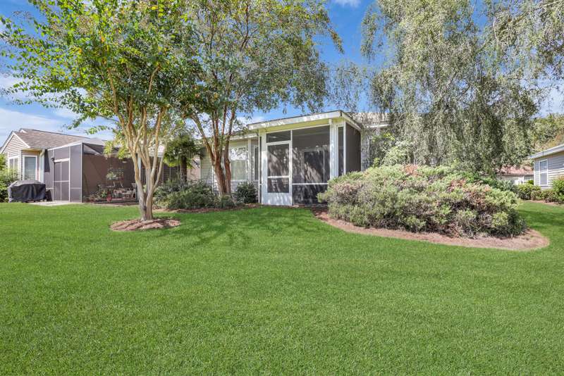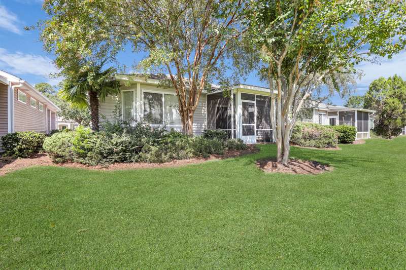 Welcome to your charming Sun City Hilton Head retreat! This delightful Chesapeake cottage combines comfort, style, and convenience in one perfect package. Light fills the Great Room through dramatic clerestory windows, enhanced by crown molding and rich LVP flooring. The eat-in kitchen shines with quartz countertops, stainless appliances and a breakfast bar open to the Great Room. A screened porch creates an ideal flow for indoor-outdoor living. A bay-windowed primary suite offers a walk-in closet and private bath with tiled shower. The guest room is adjacent to a full bath. Laundry Room abuts the 2-car garage entry. The cottage is in a prime location near the end of the cul-de-sac and has a fabulous lagoon view.