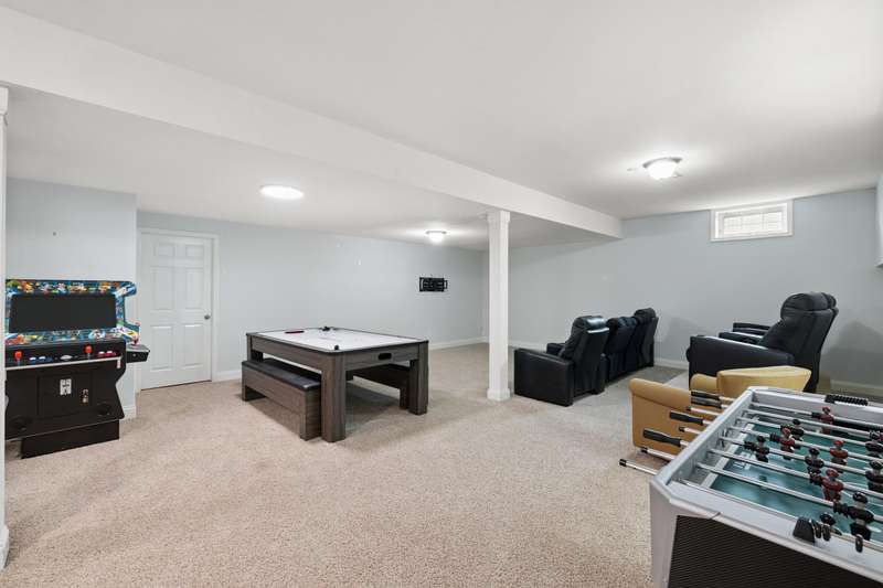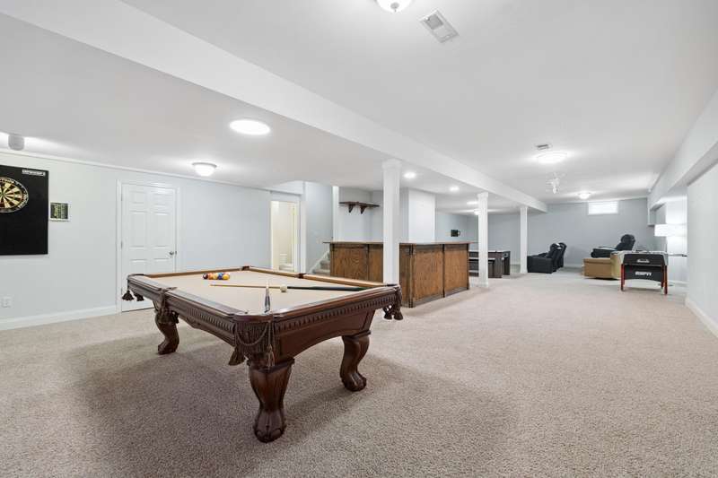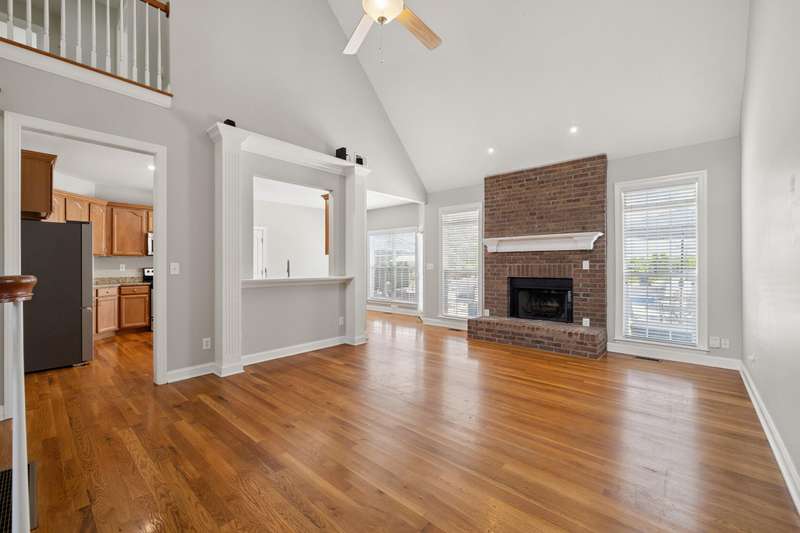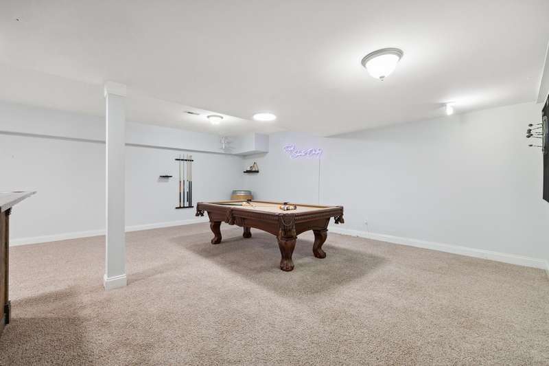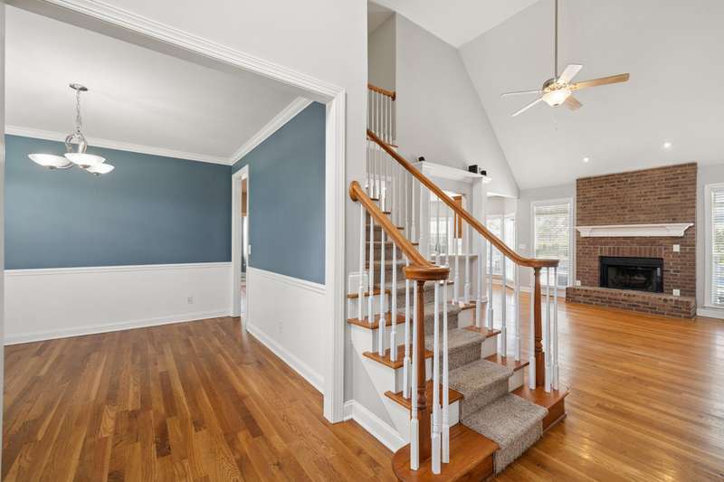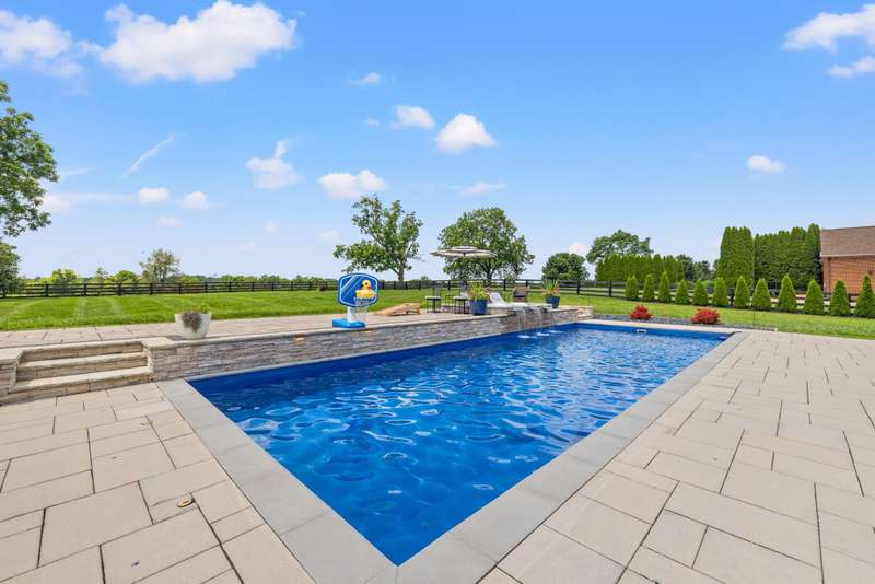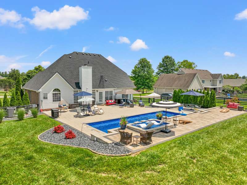 Set on a picturesque one-acre lot in Nicholasville's quiet Hickman's Point neighborhood, this spacious home offers comfort, functionality, and room to relax both inside and out. A welcoming two-story foyer and hardwood floors set the tone upon entry, leading into a vaulted living room filled with natural light and anchored by a brick fireplace. The kitchen features granite countertops, an eat-in area, and direct access to the expansive backyard. Outside, enjoy summer days on the large patio, complete with a heated saltwater pool, multiple seating areas, and a tanning deck, ideal for gatherings or quiet evenings. The first-floor primary suite is a true retreat with a double tray ceiling and accent lighting, dual closets, double vanities, a soaking tub, and a tile shower. Also on the main level, you'll find a second bedroom, a full bathroom, a formal dining room, a laundry area, and access to the three-car garage. Upstairs, three additional bedrooms share a full bathroom. The finished basement expands your living space with a bar area, pool table, theater-style seating, a full bathroom, and two large unfinished rooms perfect for storage. Offering space, updates, and an inviting layout, this home is ready to enjoy in a peaceful, established neighborhood, just minutes from local amenities and an easy drive to Lexington.