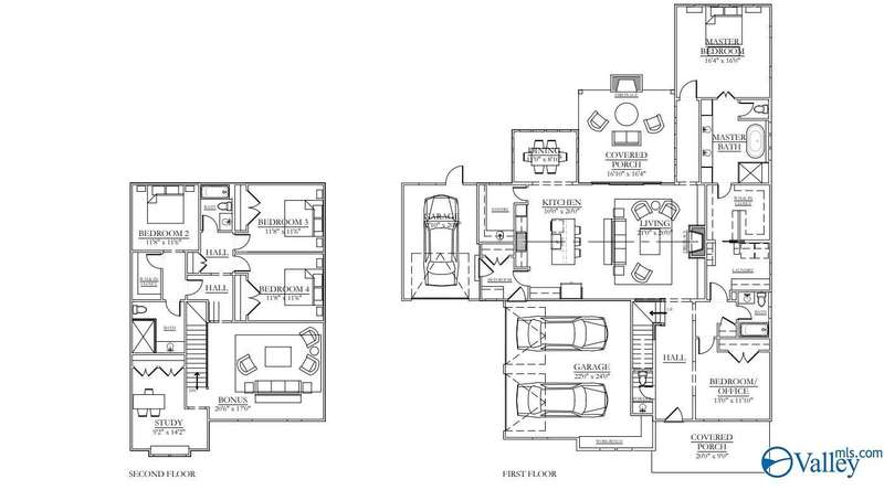 Proposed Construction-This spacious and elegant home has an open concept great room and kitchen with adjacent light-filled dining room with yard view. The large covered side porch with a gas log fireplace is the perfect spot for unwinding at the end of the day The owner's suite features an oversized closet and a luxurious bathroom with dual vanities that connects the laundry room for utmost convenience. A flex room on the main level can be used as an additional bedroom or office space. Upstairs, there are three more bedrooms, a bonus room, and a delightful study or office space.
