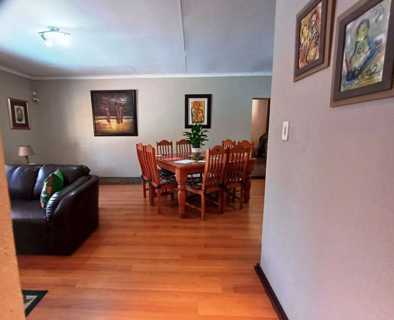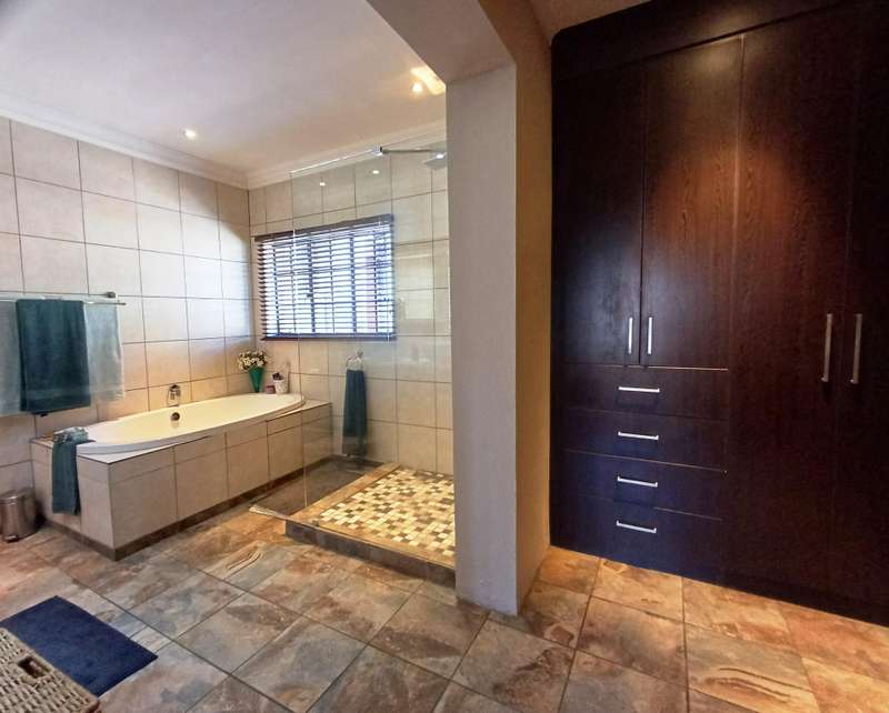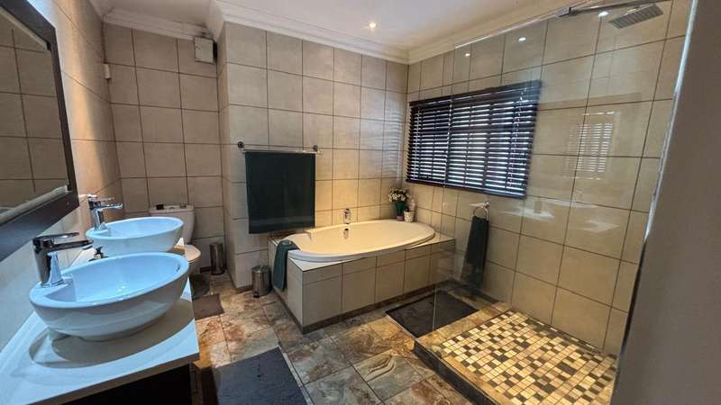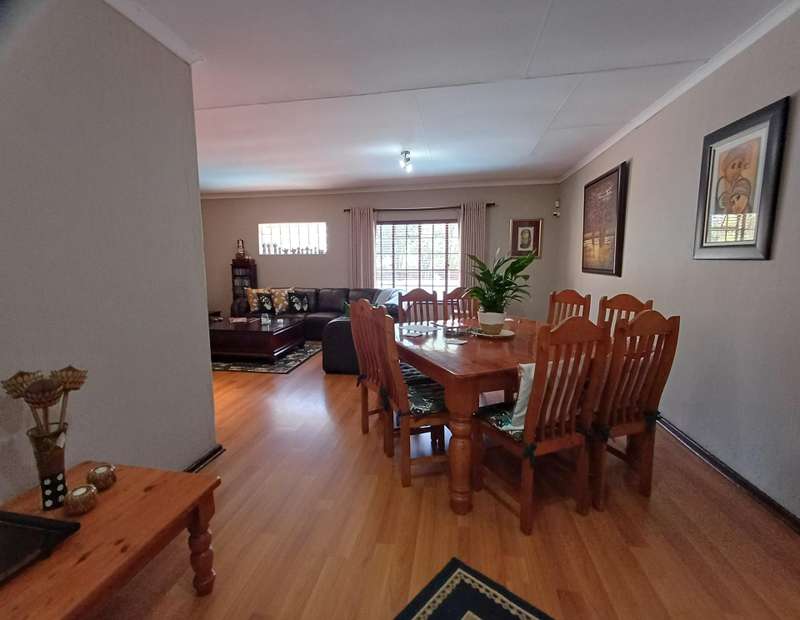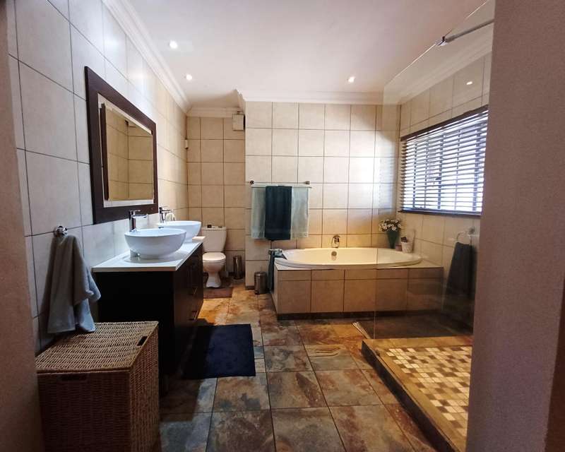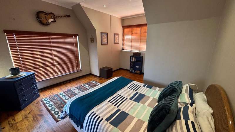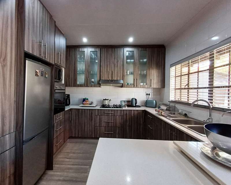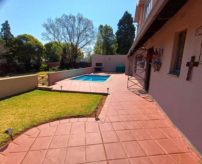 Spacious 4 bedroom home with pool and entertainment area. This home comprises of 4 bedrooms with built-in cupboards Two en-suite bathrooms, one upstairs and one downstairs Upstairs and downstairs en-suite bedrooms which is ideal for guest accommodation Spacious open plan lounge and dining area Modern kitchen with a breakfast nook, granite tops and loads of cupboards for all your storage Entertainment area with a built-in braai overlooking a sparkling pool Spacious pet friendly garden with a Wendy house for extra storage Staff accommodation and a separate laundry room Single garage plus a double carport