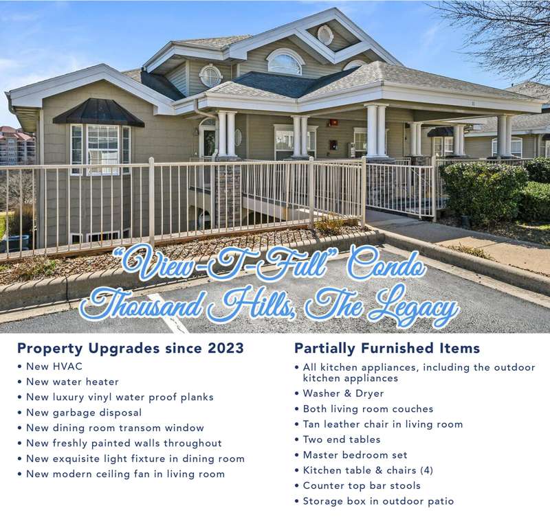 VIEW-T-FUL GOLF FRONT VILLA. Located in the heart of downtown Branson, sits this newly updated open layout floor plan, 2 bed, 2 bath condo.Welcome to ''The Legacy'' at Thousand Hills. Sit on the back patio and enjoy the views of this premium location. Just around the corner from the Branson 76 strip with shows, shopping and spectacular restaurants. 10 minutes to ''The Landing'' ''Downtown Branson'' & ''Lake Taneycomo''. The owners have meticulously updated and maintained their home with ''Pride Of Ownership''. A few of the features include:- Outdoor kitchen- New HVAC- New water heater- New luxury vinyl waterproof planks - New garbage disposal- New dining room transom window- New freshly painted walls through out- New light fixture in dining room- New ceiling fan in living room.- All appliances stay, including washer & dryer.- An enclosed heated/cooled sunroom.- All electric home including natural stone fireplace.- High Quality Furniture - Beautiful crown moldingDID I MENTION THIS CONDO COMES PARTIALLY FURNISHED? Owners have enjoyed the clubhouse and indoor pool, and you can too. This is an amazing, perfected condo and won't last long. Call your Realtor today for a showing before it's gone. NO NIGHTLY RENTALS ALLOWED IN GOLF VILLAS BUILDING 10,11 & 12.