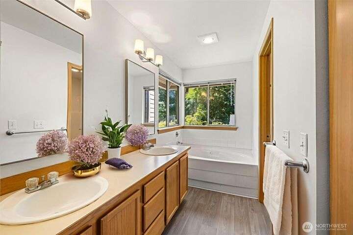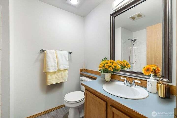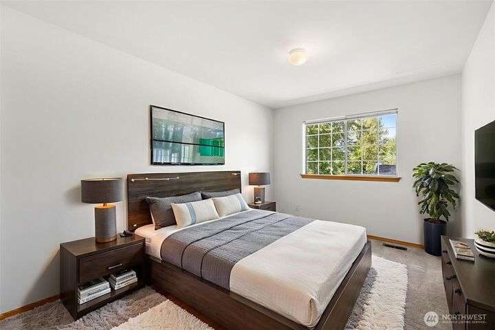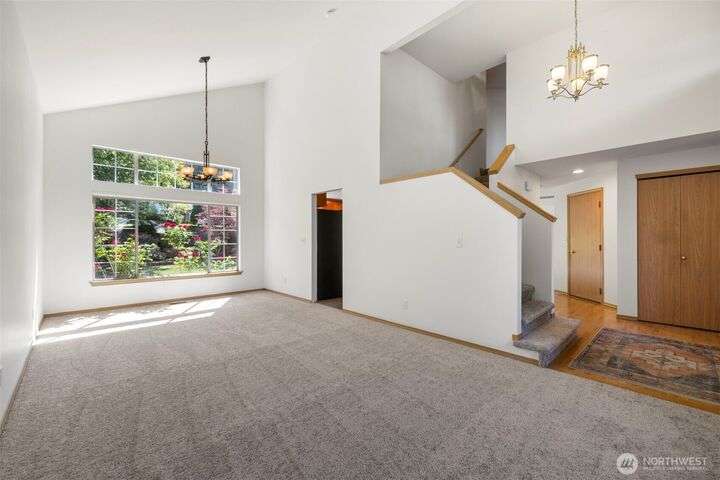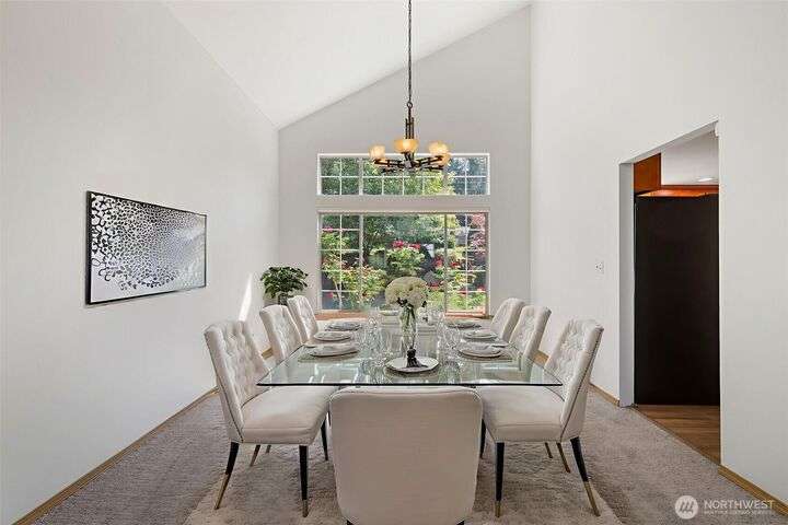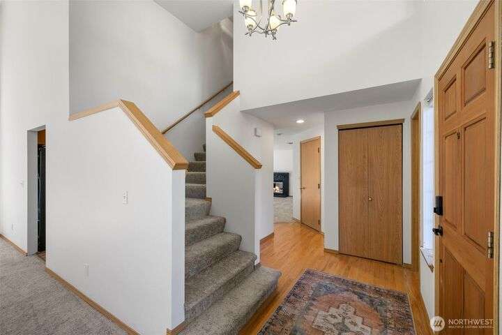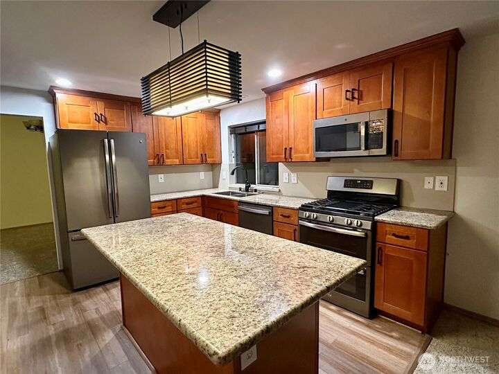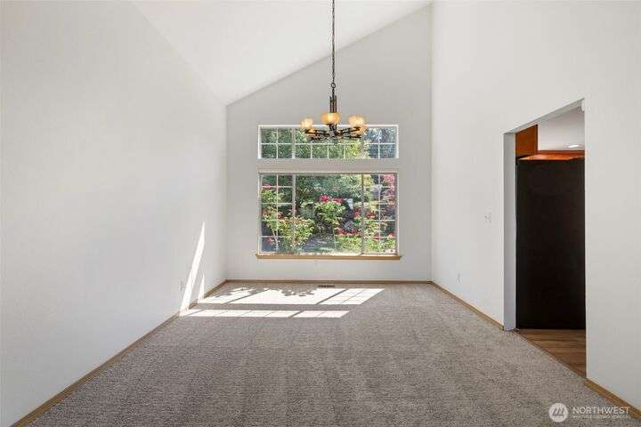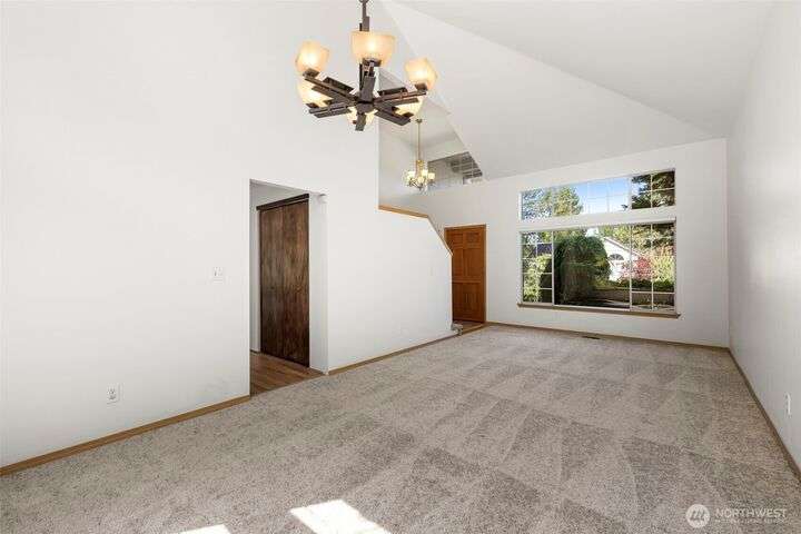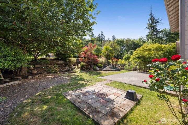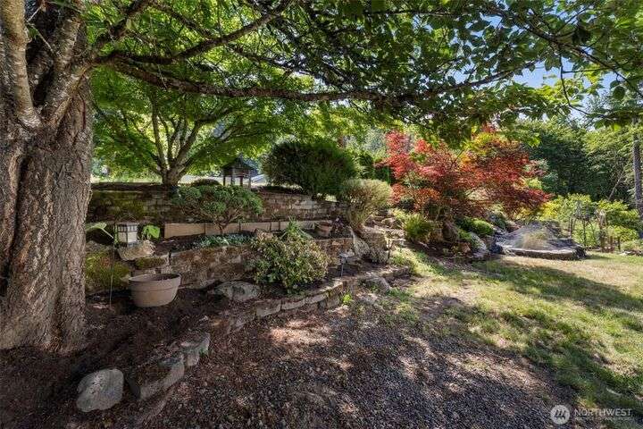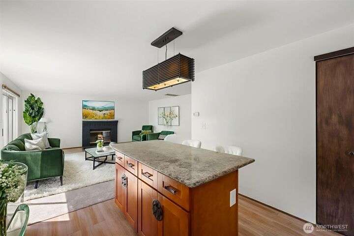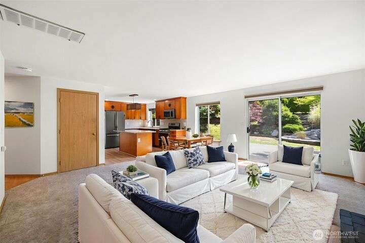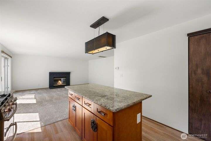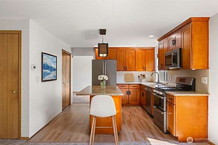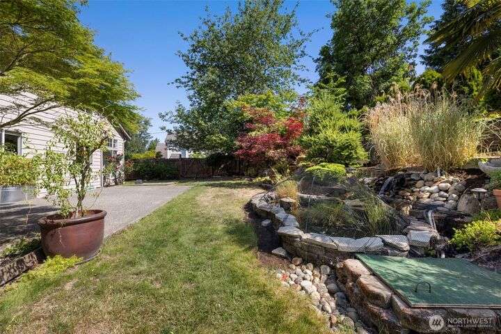 Beautiful 3-bedroom, 2.5 bath gem located in a desirable Kent neighborhood. Step inside to vaulted ceilings in the spacious living room that create an open, airy feel. Stylish kitchen w/ sleek quartz countertops, ss appliances, gas cooktop, soft-close cabinets & drawers, and ample storage-perfect for any home chef. Relax in the cozy family room with a classic wood-burning fireplace, or retreat to the primary suite complete with an attached ensuite bath. Step outside to your own backyard oasis with large patio, tranquil koi pond w/waterfall, and lush landscaping with mature trees—ideal for entertaining or quiet relaxation. Garage w/built-in overhead storage. New carpet, and paint throughout the entire home—truly move-in ready! And no HOA!