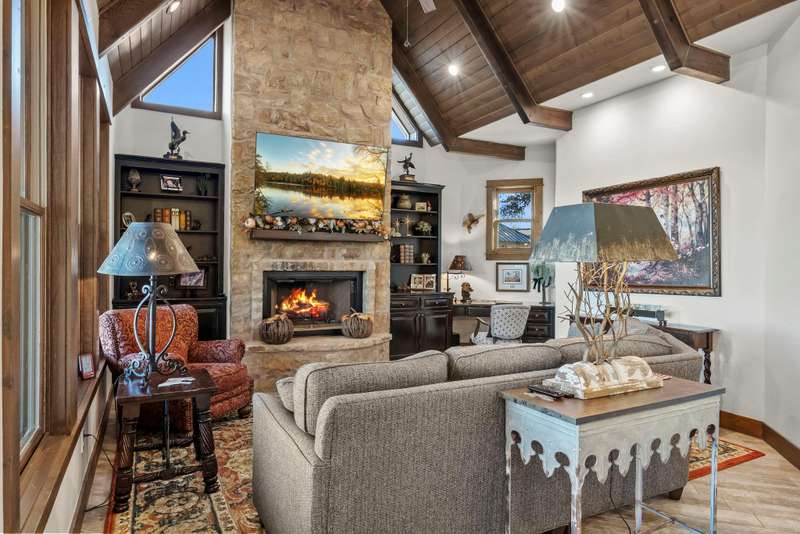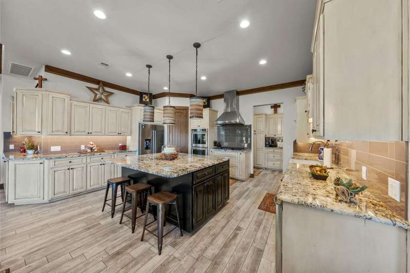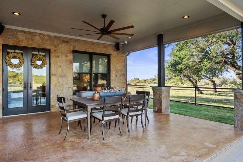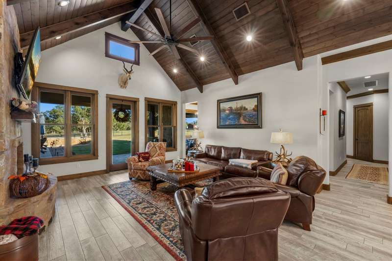 Gorgeous one story flowing home with premier features and finishes. Huge covered back porch, faces East and overlooks pool area and fire pit seating area. Multiple living and dining areas give potential floorplan flexibility. Separate and private primary suite. Potential for additional living square footage with large, conditioned attic space. Separate detached equipment garage, additional heated and cooled garage currently set up as hobby/man cave. Plus, additional barn set up with 4 stables, bathroom, tack room area, storage loft, and covered equipment storage out back. Separate fenced areas provide setup for pets, horses and cattle. Plenty of flat space for vehicle and trailer storage. Ideal setup for family, entertaining, while also being private. Views for miles, see views of Lake Buchanan, sunsets, stars and wildlife. Neighborhood features 15+ acre tracts. This one features 500+ acre ranch behind the property, and 195 acre ranch across from it. Yet, all of this is located within easy access to Burnet, Marble Falls, and Kingsland.