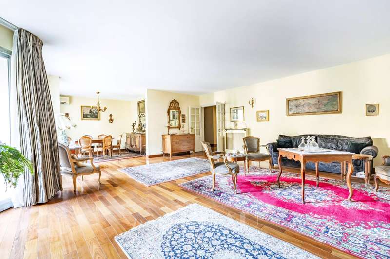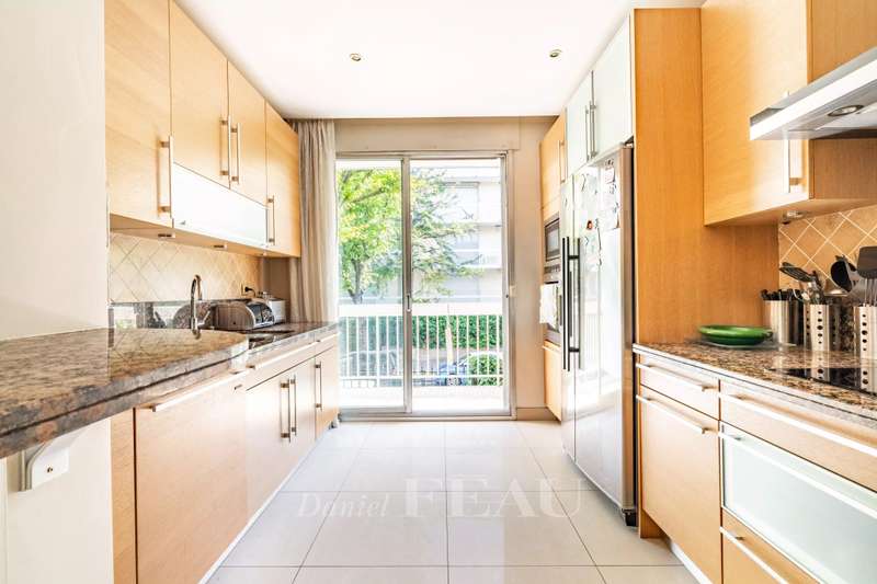 Saussaye neighbourhood. This bright and peaceful family apartment is in a luxurious residence in the immediate vicinity of the shops, the schools and the transport networks. It includes a spacious double living/reception room opening onto a wide balcony overlooking the residence’s leafy gardens, a kitchen with dining facilities, three suites each with a bathroom/wc or shower room/wc, and a guest wc. The bedrooms open onto a continuous balcony. A 4th would be possible. Air conditioning. With a parking space and a cellar. A second parking space may be acquired for a further 30000€. Pasteur catchment area. An ideal family apartment on the north-western edge of the capital.