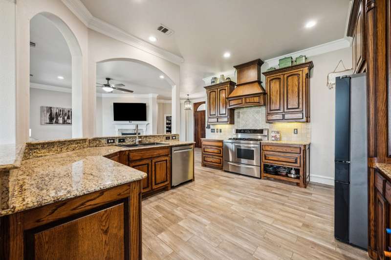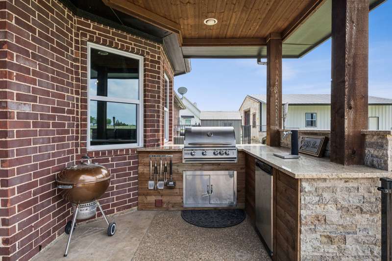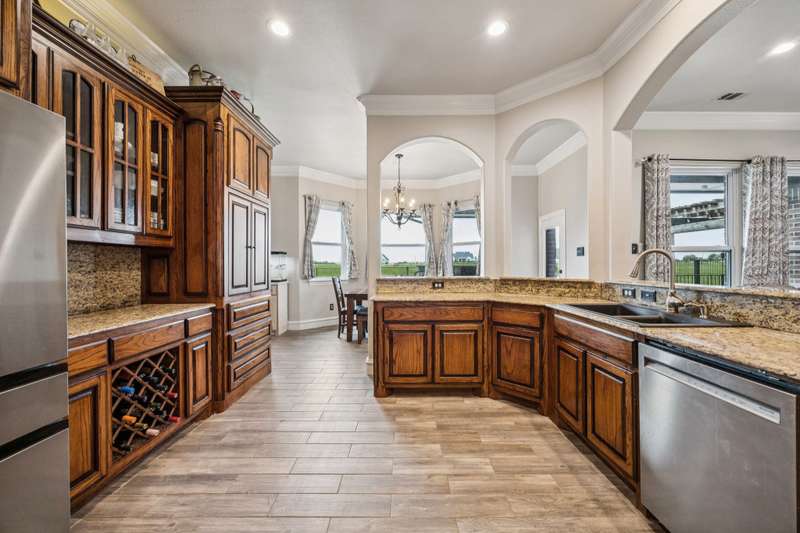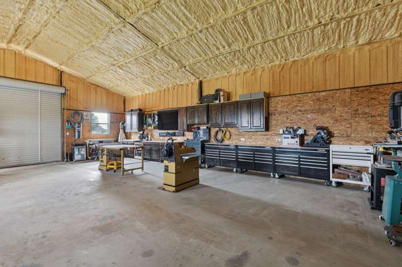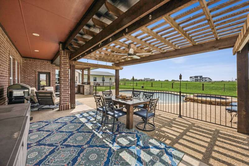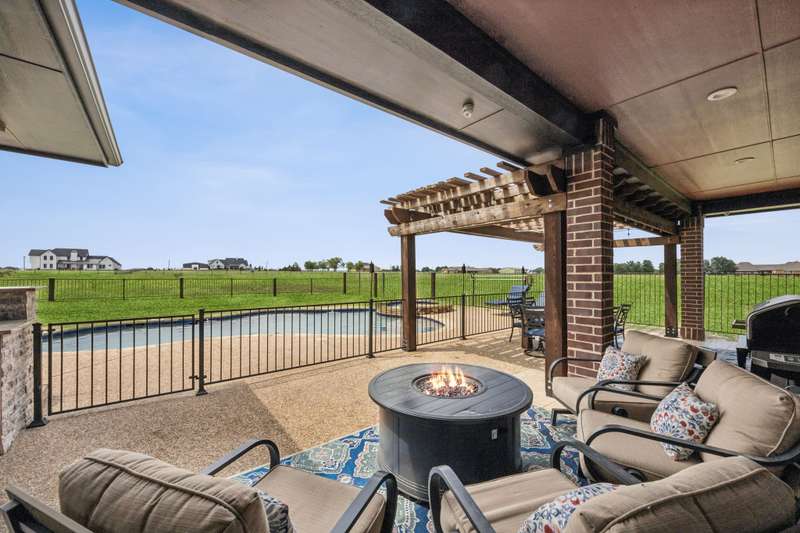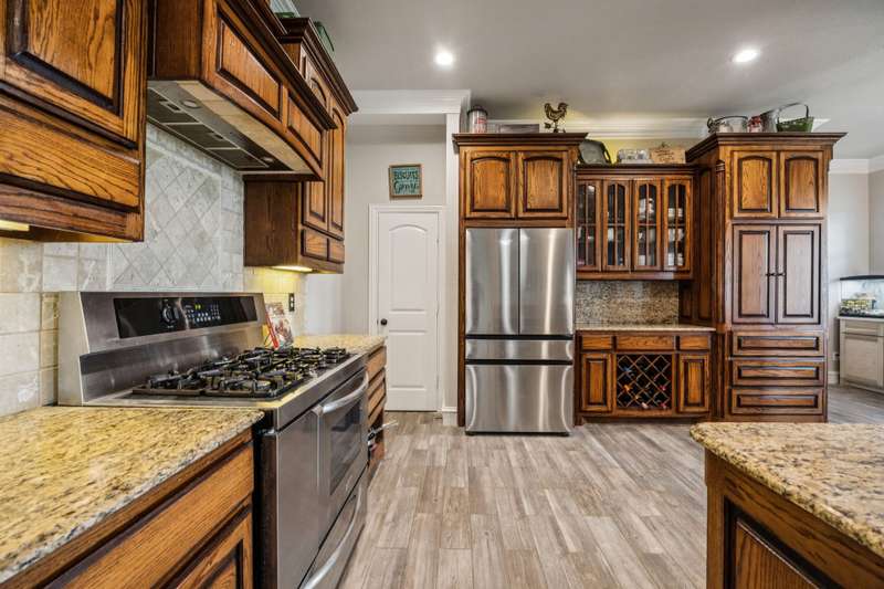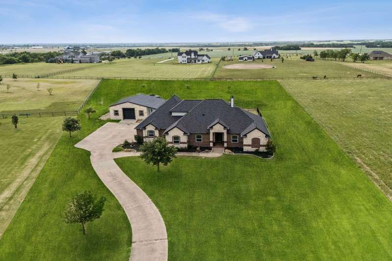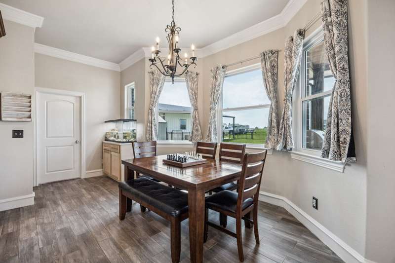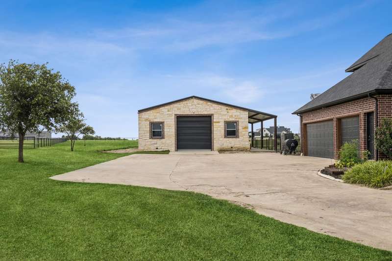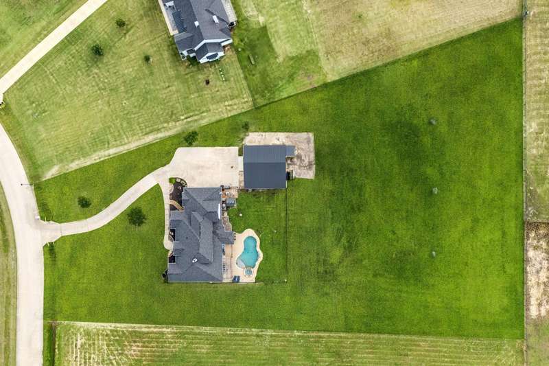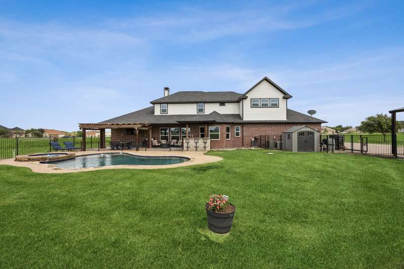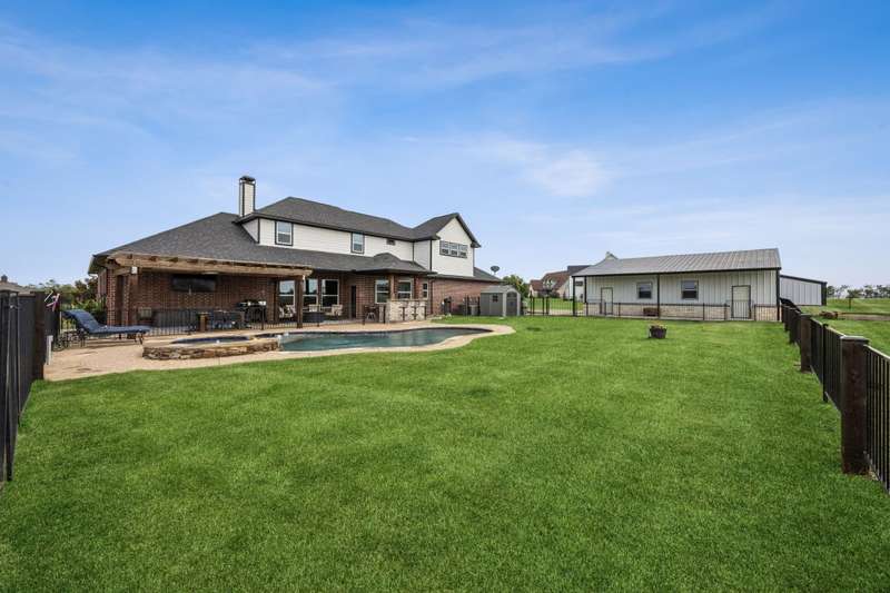Experience the perfect blend of luxury, functionality, and space set on two acres. Thoughtfully designed, the home features a well-appointed floor plan accented by updated tile and wood flooring throughout. Just off the entryway, a flexible formal dining room or den opens into a welcoming living room complete with a cozy fireplace and scenic views of the expansive backyard. Kitchen is a chefs delight, offering granite countertops, custom wood cabinetry with built-in wine storage, a gas cooktop, and spacious walk-in pantry. The adjacent breakfast nook comfortably accommodates a full-size table for casual dining. A private home office just off the main living area provides a quiet workspace with closing doors. The primary suite is generously sized, easily fitting large furniture and a sitting area. The luxurious en-suite bath includes dual vanities, a large tile walk-in shower, a private water closet, and a spacious walk-in closet. Upstairs, enjoy versatile living with a media or workout room, two additional bedrooms, a full bath, and access to two fully decked atticsideal for abundant, convenient storage. Throughout the home, tinted windows enhance energy efficiency while welcoming natural light. A standout 7.5' x 19' laundry room on the main level offers extensive cabinetry and space for an additional refrigerator. Step outside to your backyard retreat, featuring a saltwater pool with tanning ledge, hot tub, and an outdoor kitchen complete with a kegerator, built-in grill, mounted TV, and pergola. Additional highlights include a 3-car garage, double fencing, and a long driveway leading to a massive 32' x 40' shop with 16-ft ceilings, dual drive-thru doors, multiple windows, spray foam insulation, and full electrical wiring. An 8-ft covered patio extends from the shop, offering even more functional outdoor space. Community features a nature preserve with walking trail, covered playground, pond to launch your own paddle boat or fish, along with a picnic area.