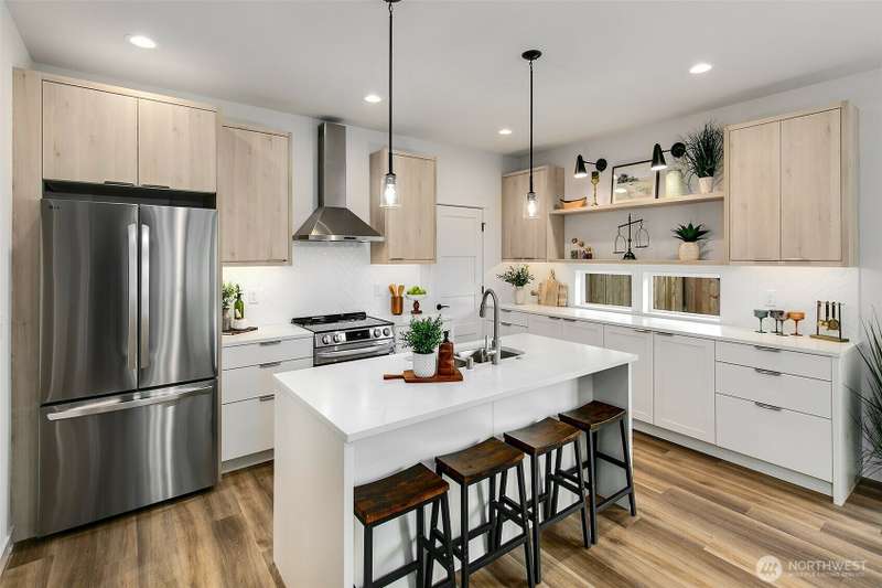 Idyllic Interurban Living! Beautiful, new home w light-filled spaces, high ceilings & modern finishes! Open concept living/dining create seamless flow. Stunning kitchen w quartz countertops, generous island, slow-close cabinetry, LG appliances. Fenced yard w lawn/patio for your summer soirees. 3 good-sized bds, full ba, laundry on 2nd level. Striking primary suite w walk-in closet, luxe bath + flex room up (office, nursery, art studio, exercise room). Easy parking/storage right off kitchen. Sited on a designated 'Healthy Street’, across from park & one block to the Interurban Trail, this gem hits all the marks! Your dream home in a picturesque setting - close to dining, shopping, transit, freeways. Come see what all the excitement is about!