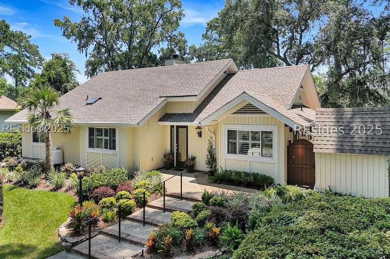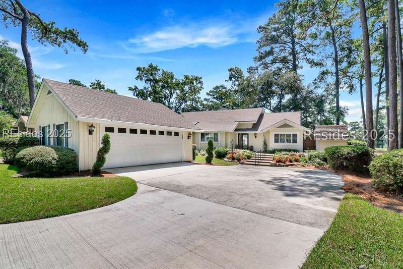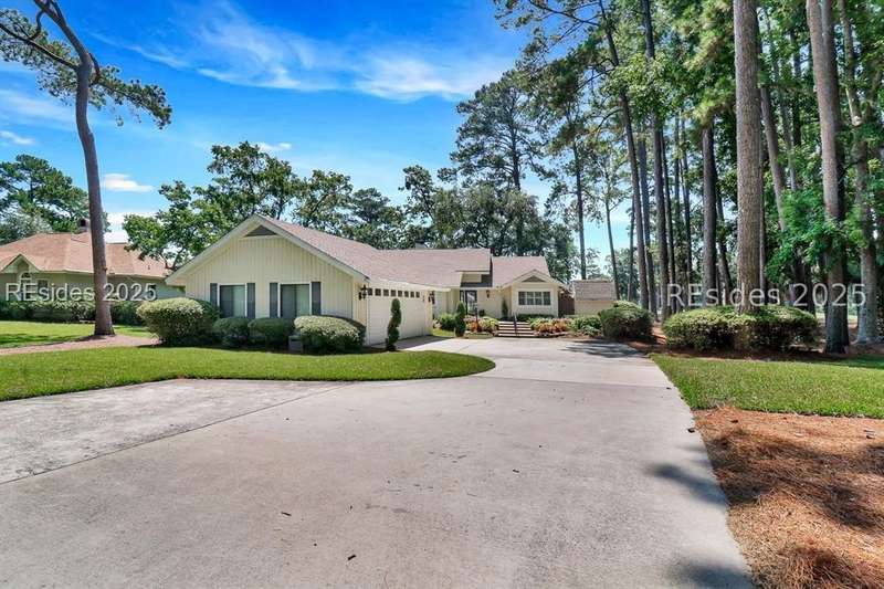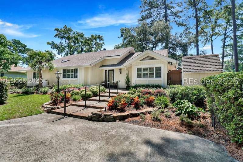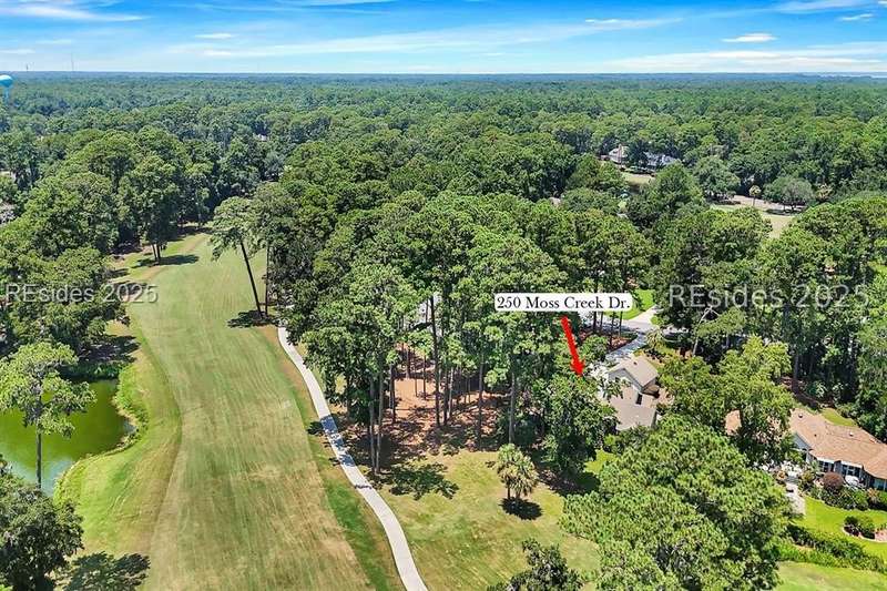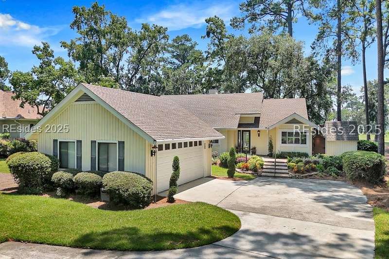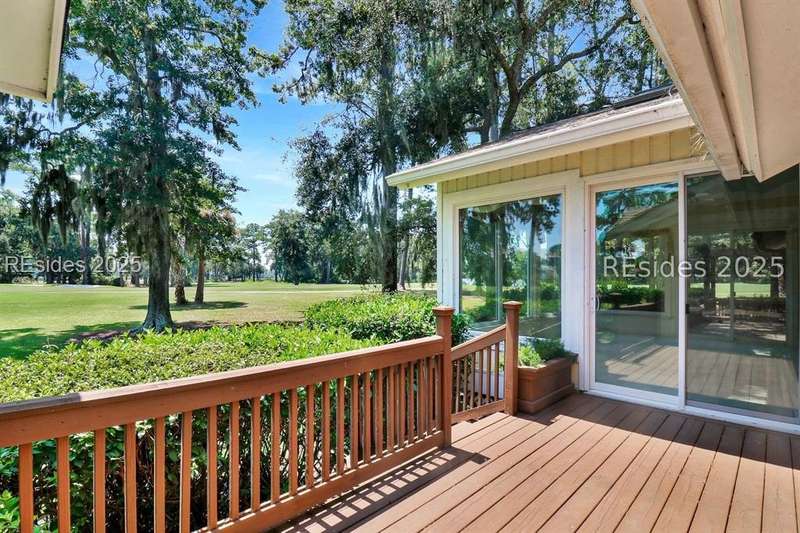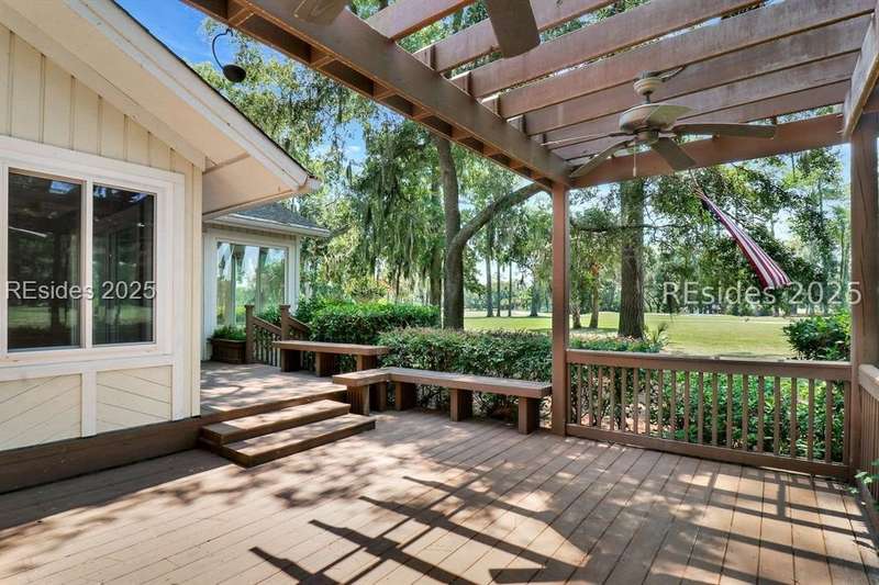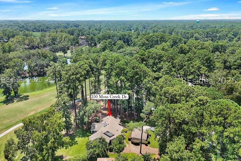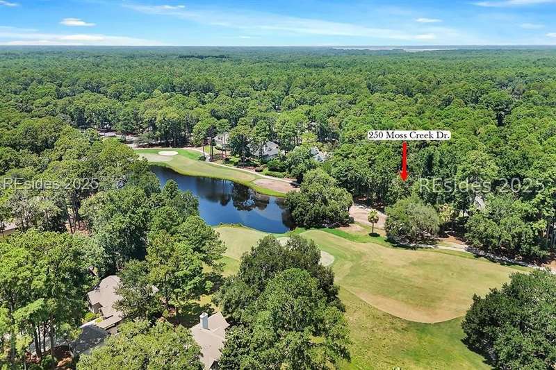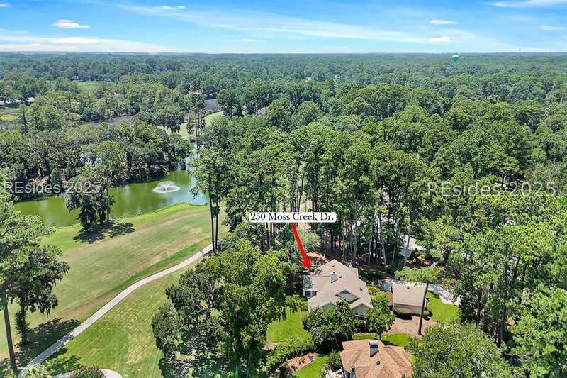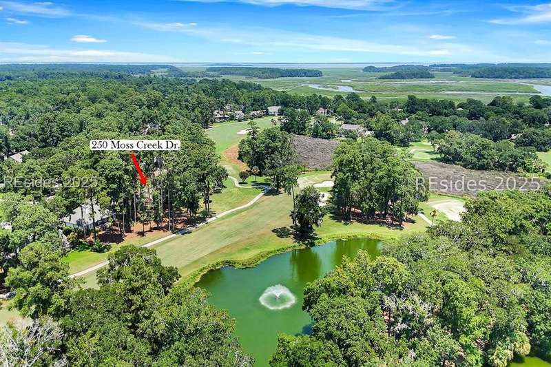 Value priced, superbly maintained, triple fairway, lagoon & marsh view residence in private, amenity rich Moss Creek. Features include wood flooring, smooth ceilings, custom detailed millwork & built-ins, granite counters, gas FP, plantation shutters, walls of windows to view, 2-tiered wrap around rear deck, max storage space incl. spray foamed attic storage, specimen trees, mature plantings, etc. Very livable floor plan offers great room, much desired Carolina room, formal/casual dining, wet bar w/frig & ice machine, kitchen with breakfast bar & walk-in pantry, 3 BRs including expansive primary suite w/ dual oversize walk-in closets w/built-ins, well-appointed bath, laundry room, office nook & 2 car garage. All on oversize lot offering maximum privacy and central locale close to all community amenities.
