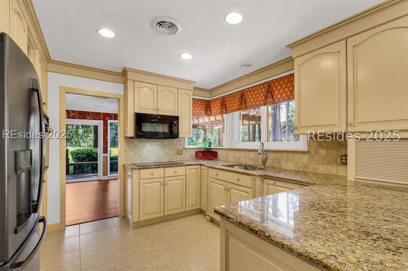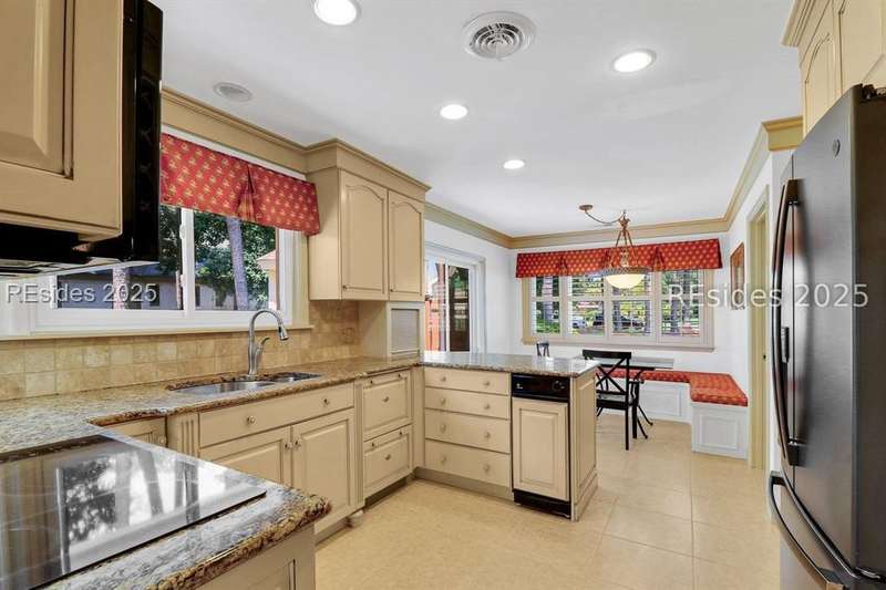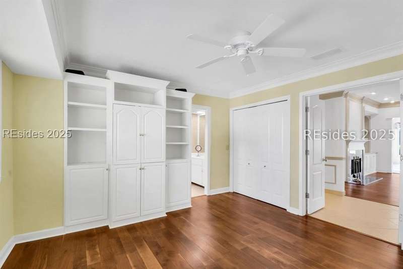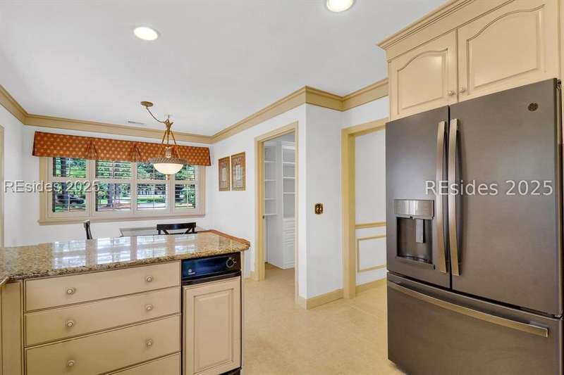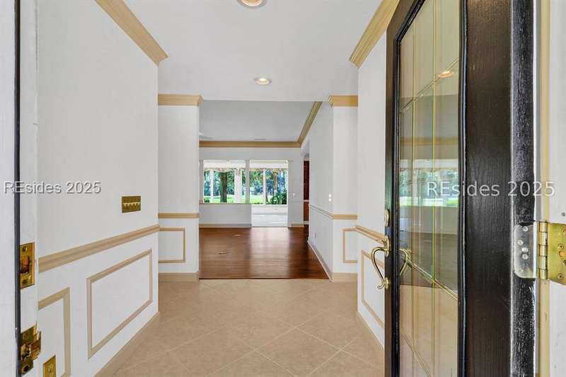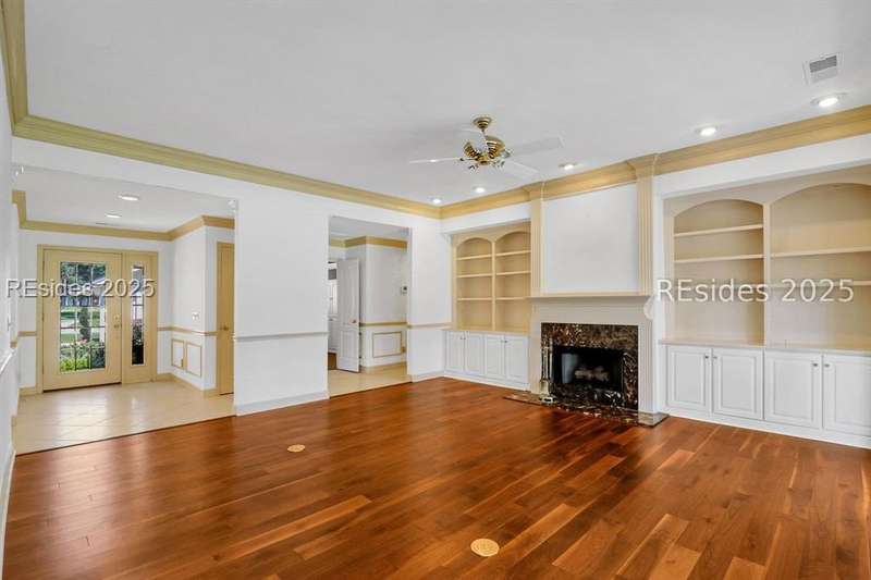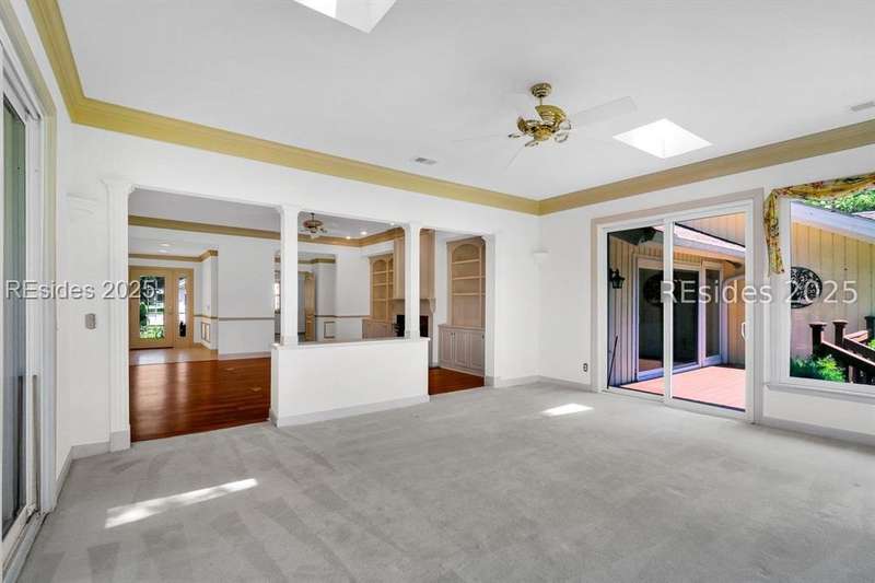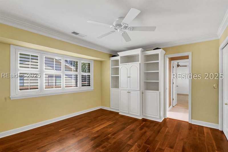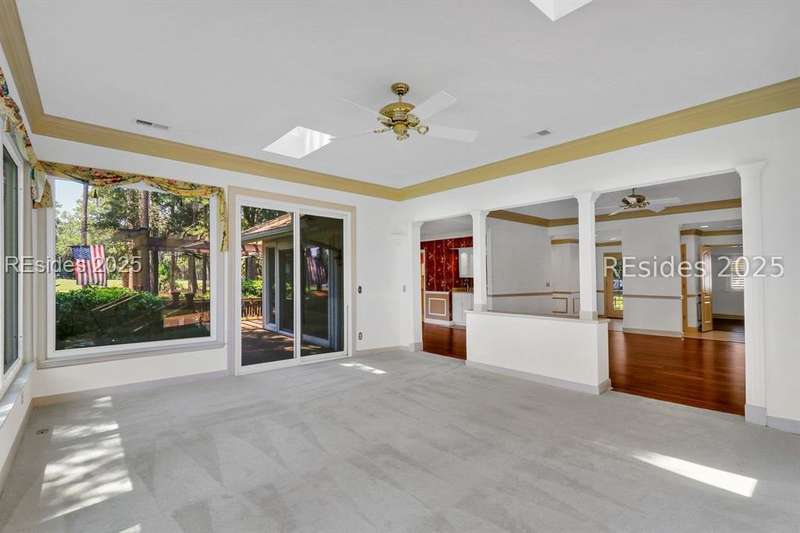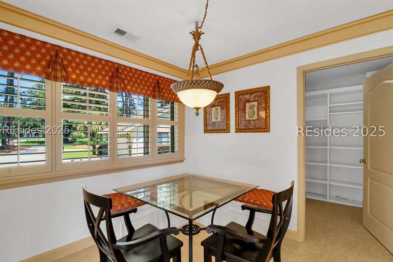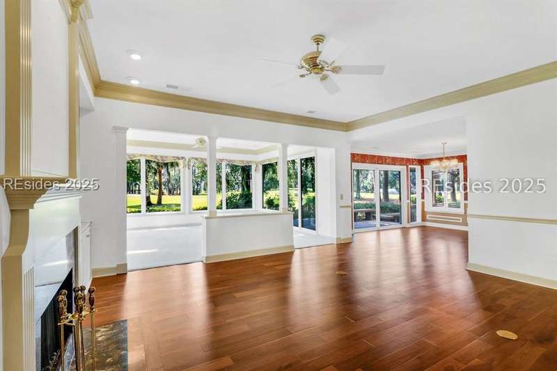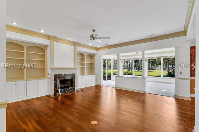 Value priced, superbly maintained, triple fairway, lagoon & marsh view residence in private, amenity rich Moss Creek. Features include wood flooring, smooth ceilings, custom detailed millwork & built-ins, granite counters, gas FP, plantation shutters, walls of windows to view, 2-tiered wrap around rear deck, max storage space incl. spray foamed attic storage, specimen trees, mature plantings, etc. Very livable floor plan offers great room, much desired Carolina room, formal/casual dining, wet bar w/frig & ice machine, kitchen with breakfast bar & walk-in pantry, 3 BRs including expansive primary suite w/ dual oversize walk-in closets w/built-ins, well-appointed bath, laundry room, office nook & 2 car garage. All on oversize lot offering maximum privacy and central locale close to all community amenities.