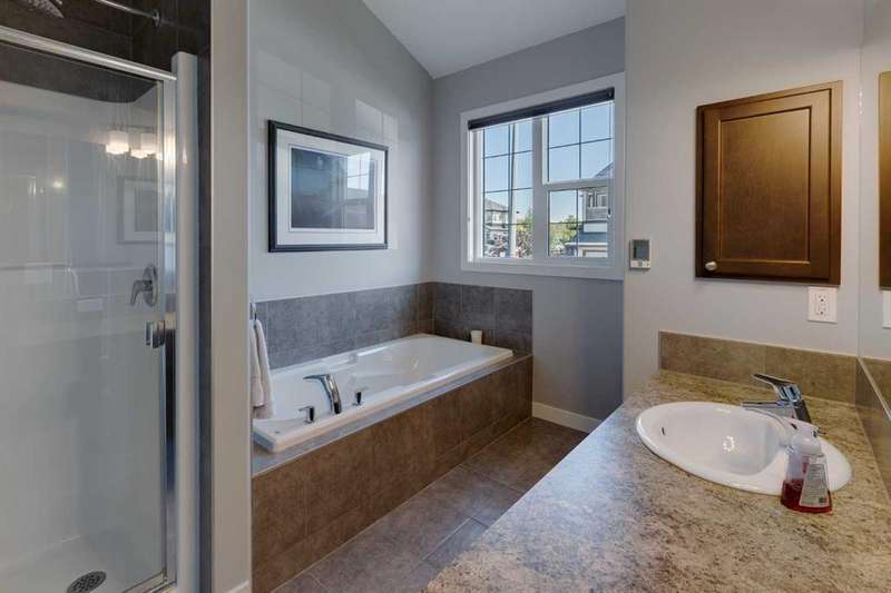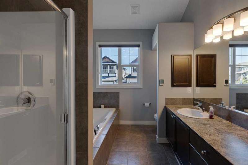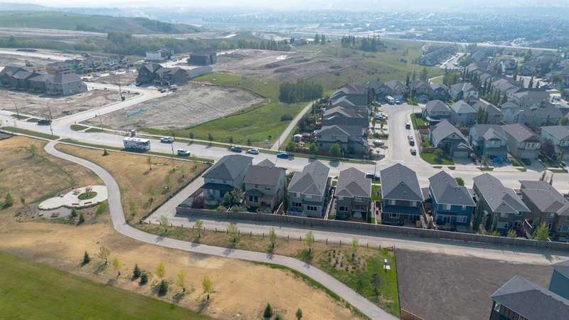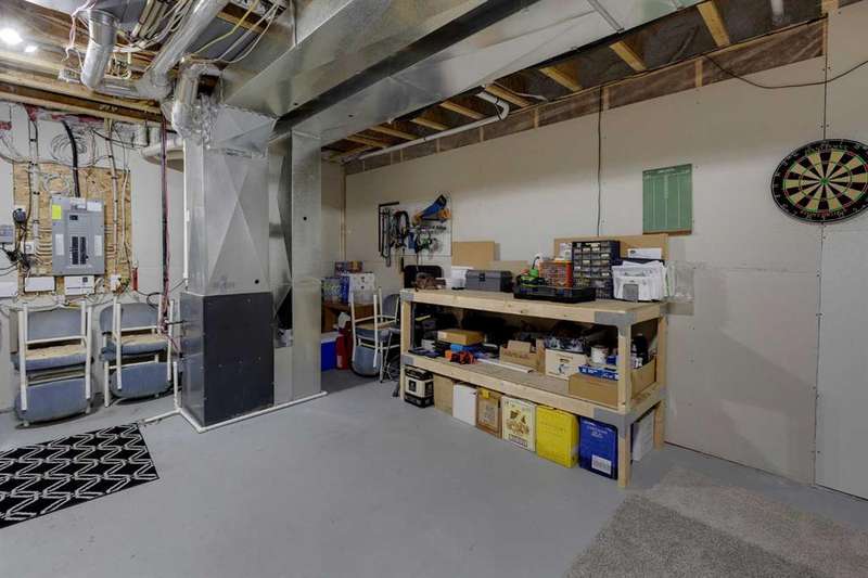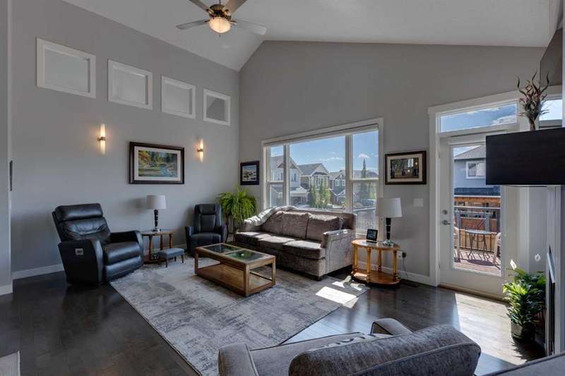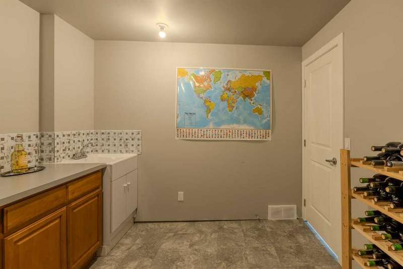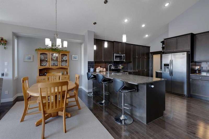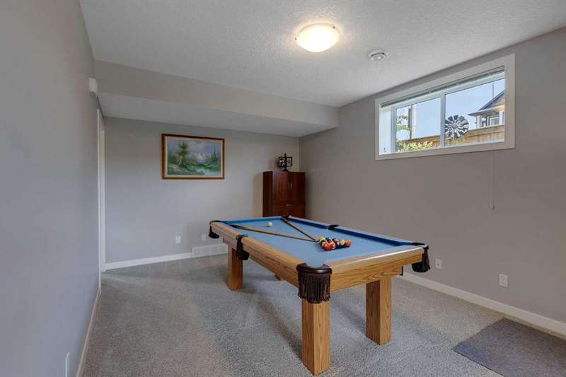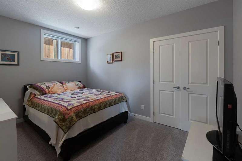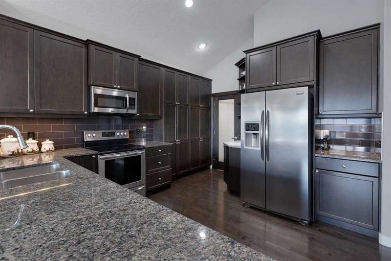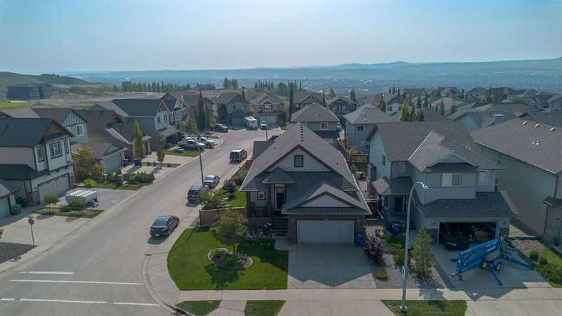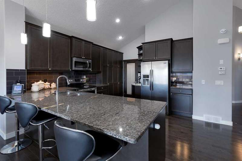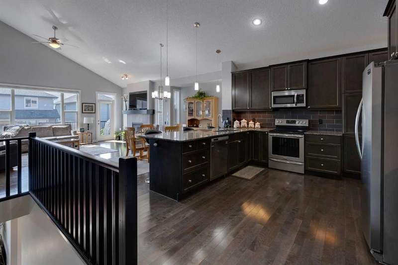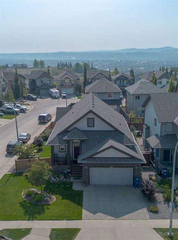 Welcome to this beautifully maintained 4-bedroom, 2.5-bath bungalow located in the sought-after community of Heritage Hills, Cochrane. Offering partial mountain views from the back deck, this spacious home blends functionality, comfort, and elegance across 1,521 sq ft on the main level and an additional 1409 sq ft in the fully finished basement. Main floor highlights include bright, open-concept layout with hardwood, tile, and carpet flooring. A huge kitchen features stainless steel appliances, ample cabinetry, under-cabinet lighting, and generous storage space. The living room with gas fireplace and large windows (upgraded number of windows) provides a welcoming atmosphere. Convenient main floor laundry. Primary suite has heated floor ensuite, soaker tub, walk-in closet, and beautiful finishes like vaulted ceiling and windows. Two additional decks (one front and two in back) for morning coffee or evening conversations with friendly neighbours. Basement features include 9' ceilings creating a spacious feel throughout, large bonus/family room, two well-sized bedrooms with oversized windows for natural light. There is a full bathroom and even a wine/beer making room with sink, cold storage room, and additional storage areas. Additional features to the home include: radon mitigation system, Hunter Douglas blinds throughout main floor, central vacuum system included, security system (assumable for $40/month). RV parking area can be restored to grass if owner chooses and this corner lot has great curb appeal. Beautifully landscaped yard with underground irrigation, garden plots, and the three decks for entertaining or relaxing. Low maintenance space between this home and next door, as well. This thoughtfully designed bungalow offers the perfect mix of indoor comfort and outdoor enjoyment. Located close to walking paths, parks, and all the amenities Cochrane has to offer, it’s ideal for families, downsizers, or anyone seeking single-level living with space to grow. Highway 1A allows quick access to Ghost Lake and Canmore/Banff or east to Calgary.