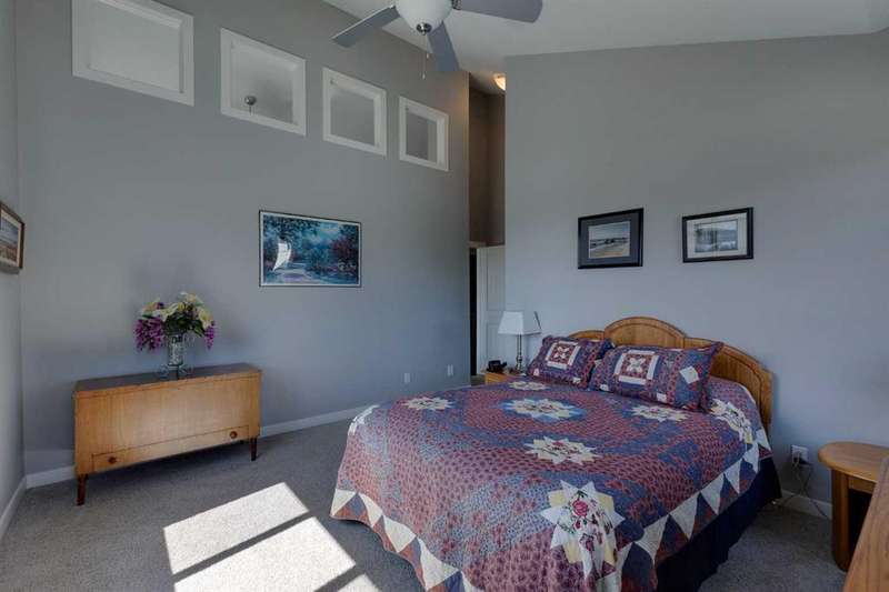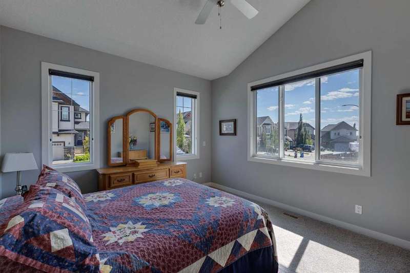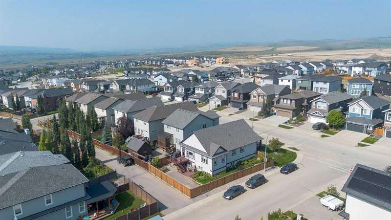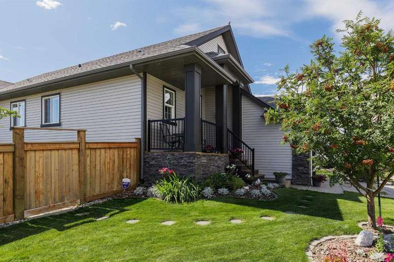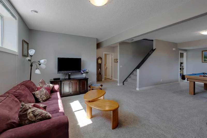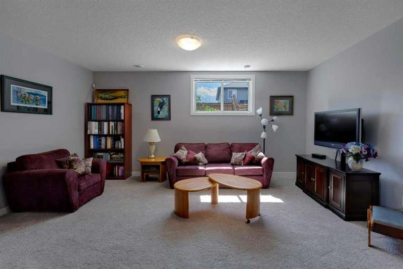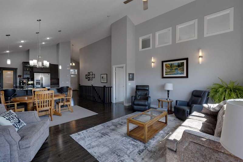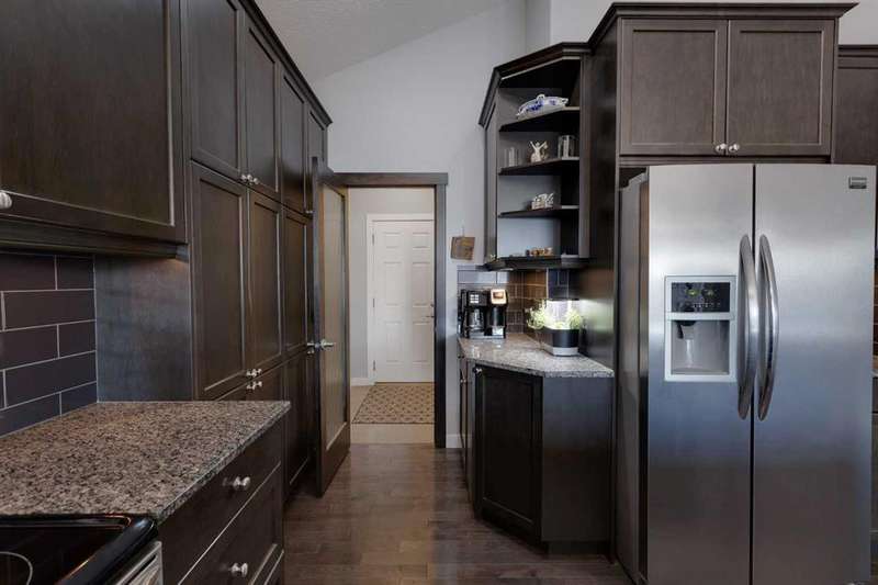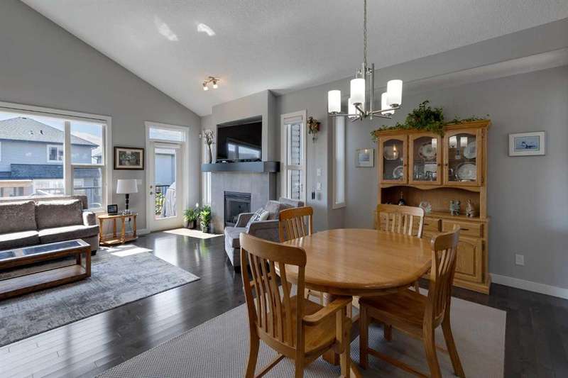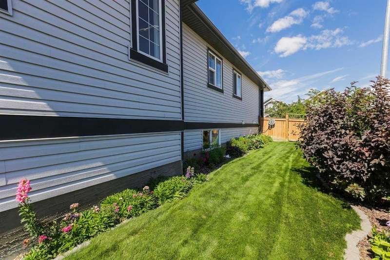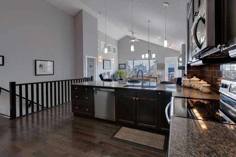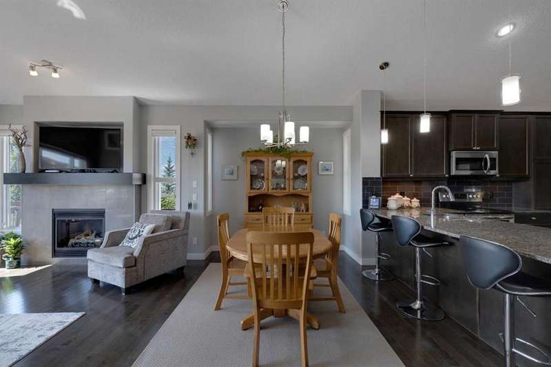 Welcome to this beautifully maintained 4-bedroom, 2.5-bath bungalow located in the sought-after community of Heritage Hills, Cochrane. Offering partial mountain views from the back deck, this spacious home blends functionality, comfort, and elegance across 1,521 sq ft on the main level and an additional 1409 sq ft in the fully finished basement. Main floor highlights include bright, open-concept layout with hardwood, tile, and carpet flooring. A huge kitchen features stainless steel appliances, ample cabinetry, under-cabinet lighting, and generous storage space. The living room with gas fireplace and large windows (upgraded number of windows) provides a welcoming atmosphere. Convenient main floor laundry. Primary suite has heated floor ensuite, soaker tub, walk-in closet, and beautiful finishes like vaulted ceiling and windows. Two additional decks (one front and two in back) for morning coffee or evening conversations with friendly neighbours. Basement features include 9' ceilings creating a spacious feel throughout, large bonus/family room, two well-sized bedrooms with oversized windows for natural light. There is a full bathroom and even a wine/beer making room with sink, cold storage room, and additional storage areas. Additional features to the home include: radon mitigation system, Hunter Douglas blinds throughout main floor, central vacuum system included, security system (assumable for $40/month). RV parking area can be restored to grass if owner chooses and this corner lot has great curb appeal. Beautifully landscaped yard with underground irrigation, garden plots, and the three decks for entertaining or relaxing. Low maintenance space between this home and next door, as well. This thoughtfully designed bungalow offers the perfect mix of indoor comfort and outdoor enjoyment. Located close to walking paths, parks, and all the amenities Cochrane has to offer, it’s ideal for families, downsizers, or anyone seeking single-level living with space to grow. Highway 1A allows quick access to Ghost Lake and Canmore/Banff or east to Calgary.