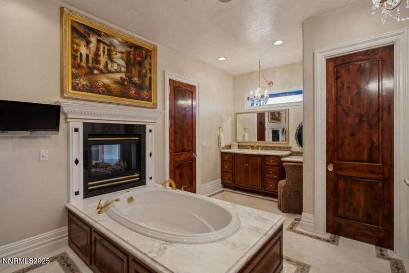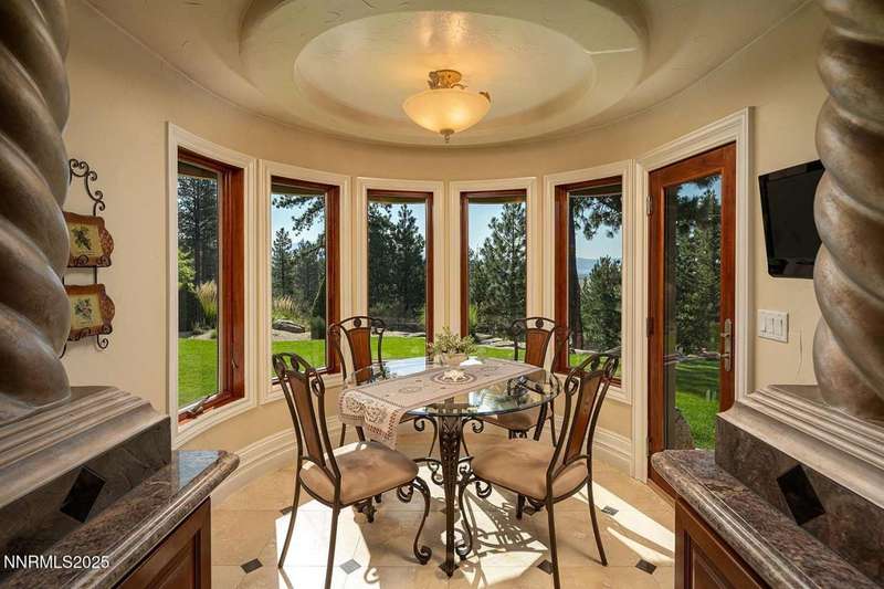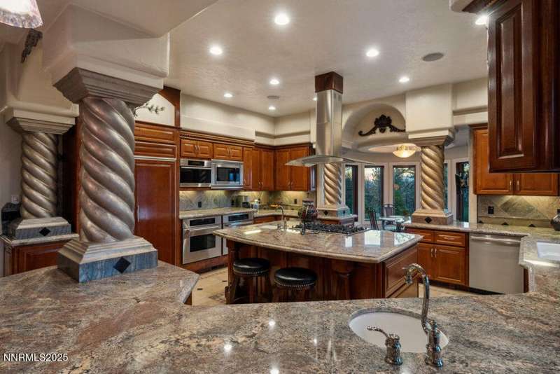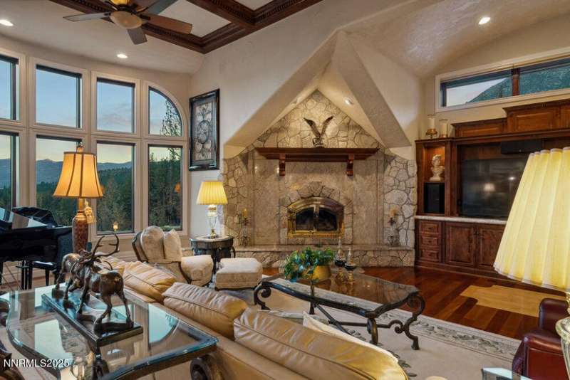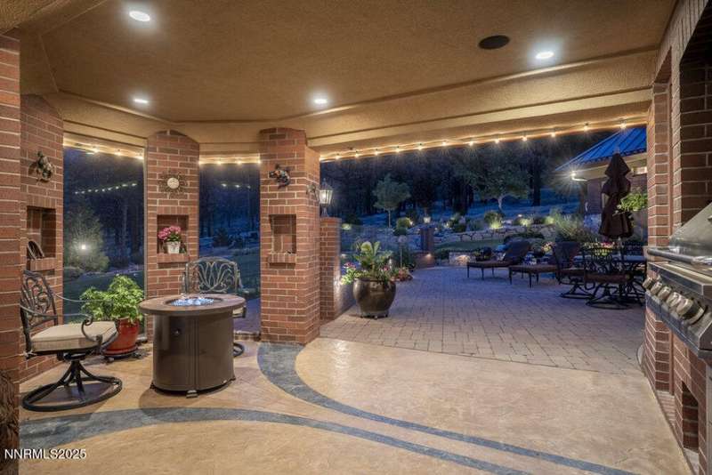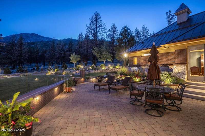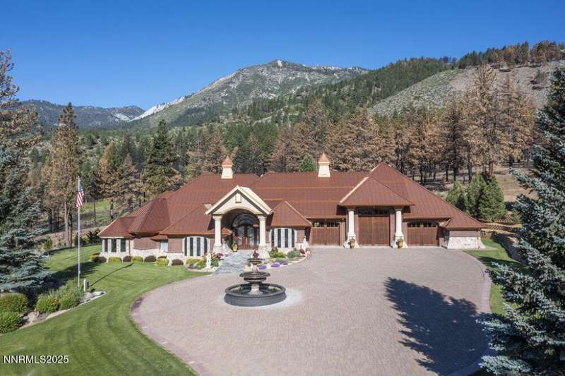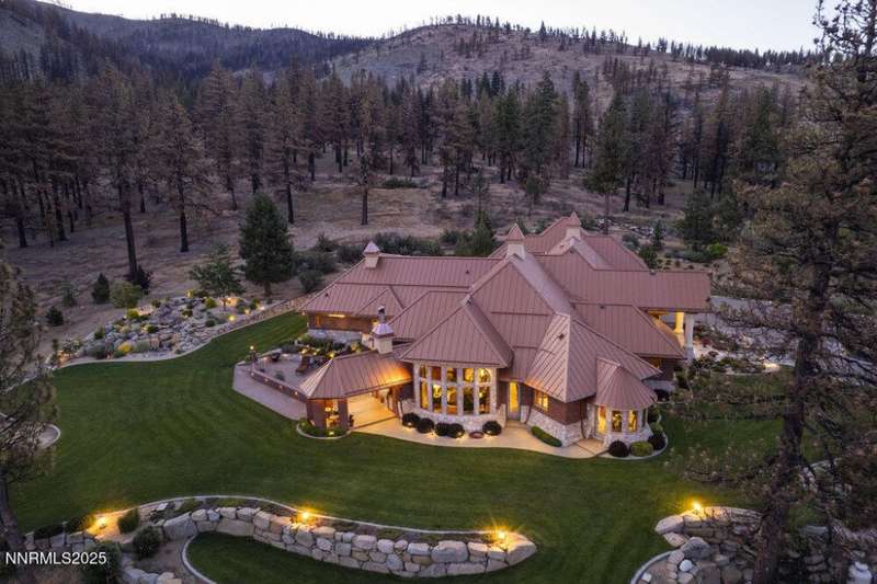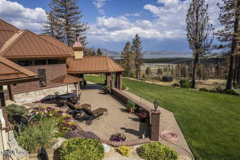 Welcome home to this elegant valley estate set on a beautiful 5+ acre parcel bordering Davis Creek Park with panoramic mountain, valley and lake views! The thoughtfully designed floor plan features a great room concept with a mix of formal and casual dining space, perfect for entertaining. The comfortable living room borders the kitchen and includes cathedral ceilings with exposed beams, elegant flooring and a wood-burning fireplace to add ambience and warmth on cool nights. The primary suite offers a tranquil retreat at the end of the day, inviting you to soak in the jetted garden tub near the dual-sided fireplace, or freshen up in the custom steam shower. The oversized walk-in closet includes built-in wardrobe cabinetry and shelving for ample organization. The garage is approximately 2,000 sq.ft. with a 42' RV bay and plenty of room for vehicles, recreational equipment or a workshop, plus an additional storage shed (designed to match the house) provides space for tools and garden equipment. The manicured outdoor living space with extended paver patio has been lovingly cultivated, and creates an private oasis for enjoying the views and natural environment of that surrounding the home. Accent lighting and outdoor kitchen creates an elegant evening setting for dining and entertaining.
