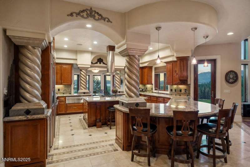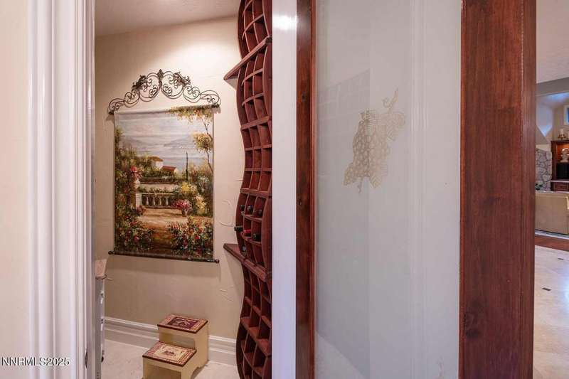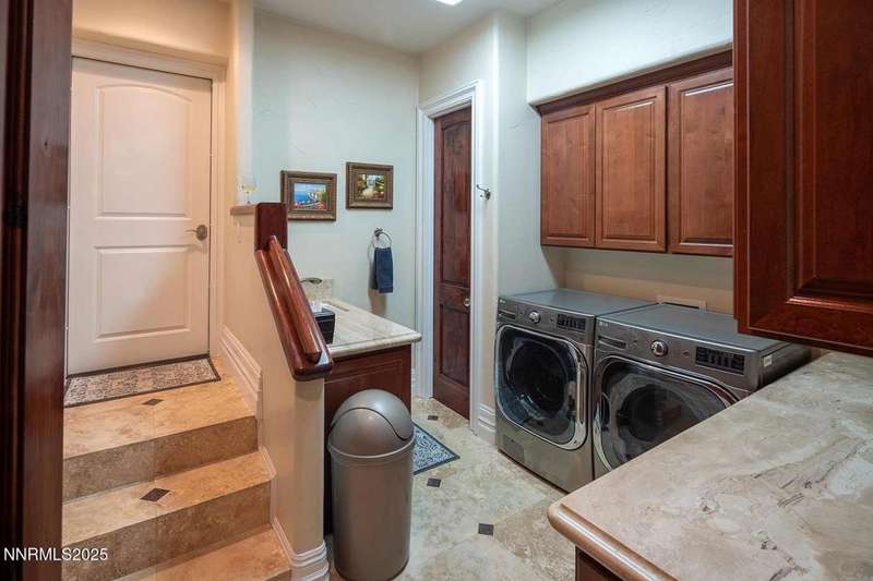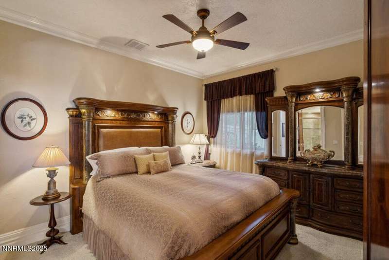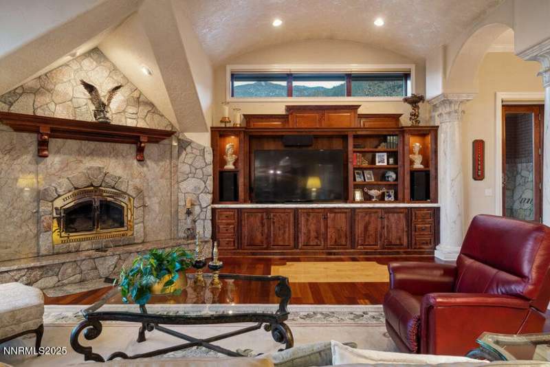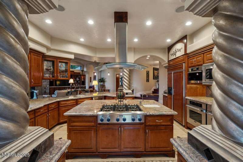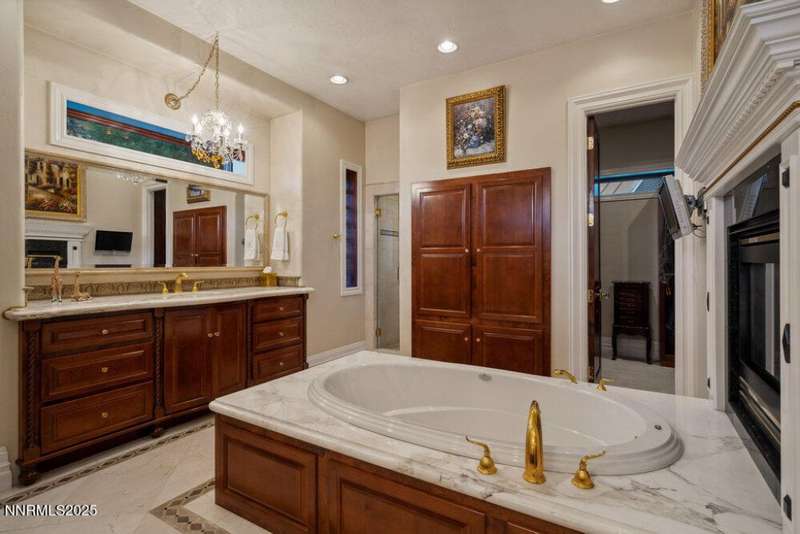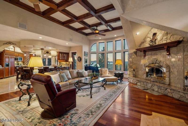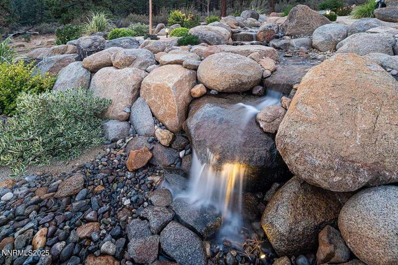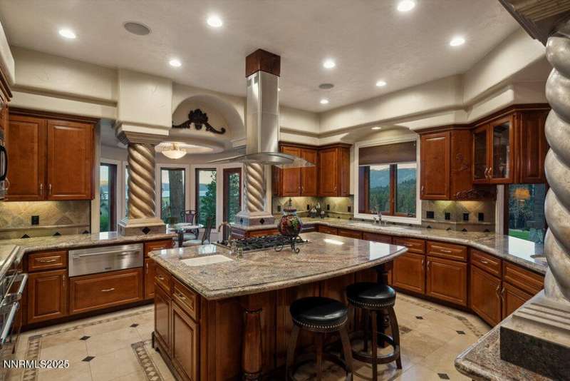 Welcome home to this elegant valley estate set on a beautiful 5+ acre parcel bordering Davis Creek Park with panoramic mountain, valley and lake views! The thoughtfully designed floor plan features a great room concept with a mix of formal and casual dining space, perfect for entertaining. The comfortable living room borders the kitchen and includes cathedral ceilings with exposed beams, elegant flooring and a wood-burning fireplace to add ambience and warmth on cool nights. The primary suite offers a tranquil retreat at the end of the day, inviting you to soak in the jetted garden tub near the dual-sided fireplace, or freshen up in the custom steam shower. The oversized walk-in closet includes built-in wardrobe cabinetry and shelving for ample organization. The garage is approximately 2,000 sq.ft. with a 42' RV bay and plenty of room for vehicles, recreational equipment or a workshop, plus an additional storage shed (designed to match the house) provides space for tools and garden equipment. The manicured outdoor living space with extended paver patio has been lovingly cultivated, and creates an private oasis for enjoying the views and natural environment of that surrounding the home. Accent lighting and outdoor kitchen creates an elegant evening setting for dining and entertaining.